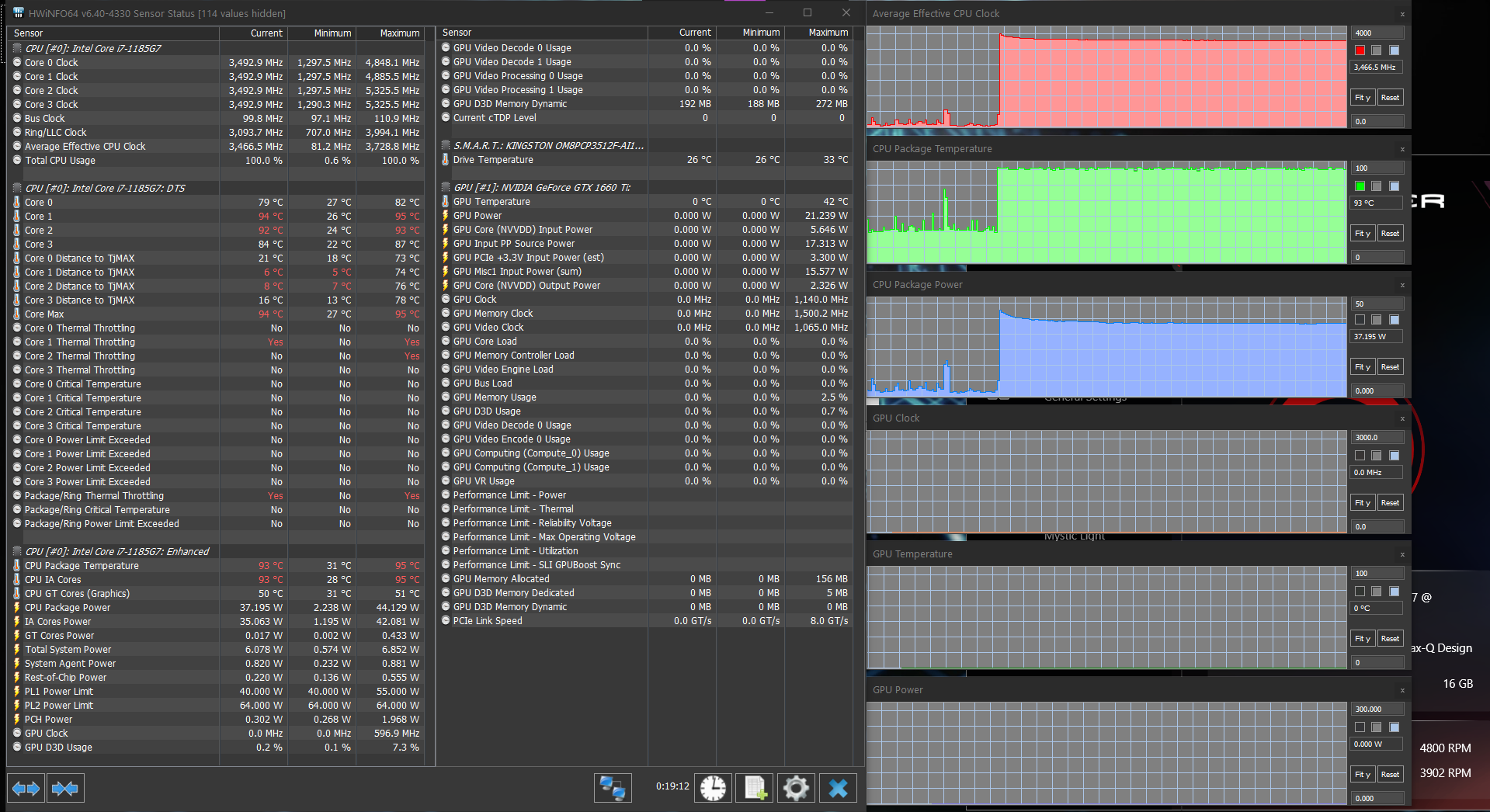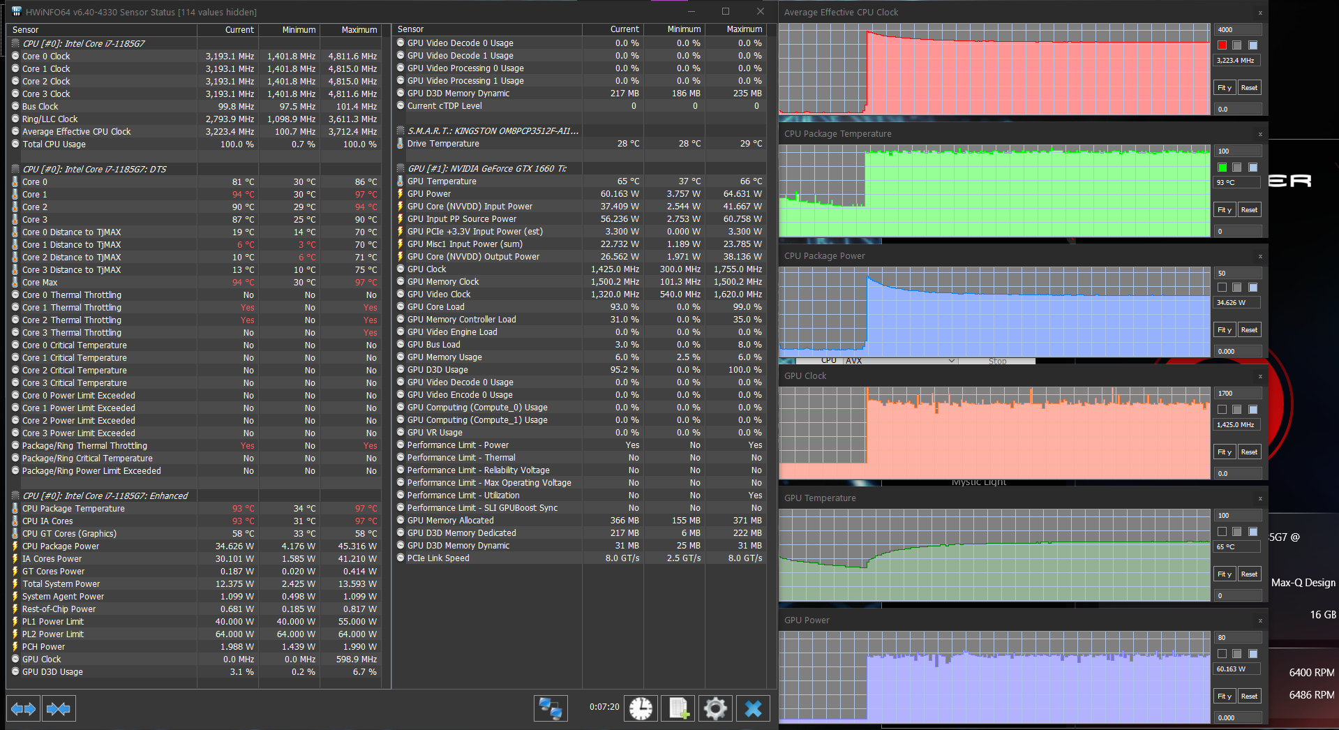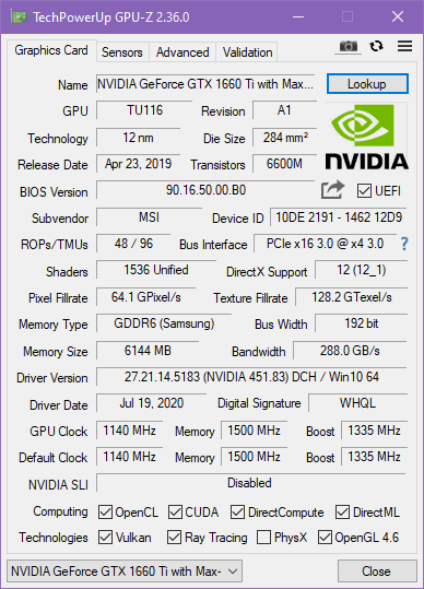 Попробовать в играх новую «ириску» (интегрированную графику Iris Xe процессора Core i7-1185G7) было интересно, но для начала поговорим все-таки об актуальном для покупателя этого ноутбука. А он, без сомнения, будет пользоваться дискретной игровой видеокартой среднего уровня Nvidia GeForce GTX 1660 Ti в исполнении Max-Q с 6 ГБ GDDR6. Напомним, что исполнение Max-Q подразумевает некоторое ухудшение характеристик карты ради заметного снижения энергопотребления (в данном случае — с 80 до 60 Вт). Низкоуровневые параметры этого ускорителя представлены на скриншоте, мы же по итогам тестирования можем подтвердить, что в производительных режимах работы ноутбука и системы охлаждения он штатно работал при потреблении 60 Вт — почти всегда, а про исключения поговорим отдельно.