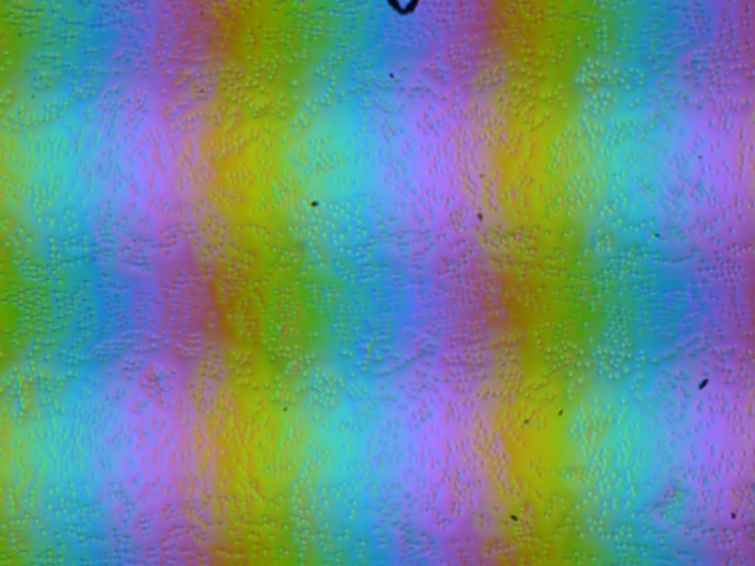 Зерно этих дефектов в несколько раз меньше размеров субпикселей (масштаб этих двух фотографий примерно одинаковый), поэтому фокусировка на микродефектах и «перескок» фокуса по субпикселям при изменении угла зрения выражены слабо, из-за этого нет и «кристаллического» эффекта.