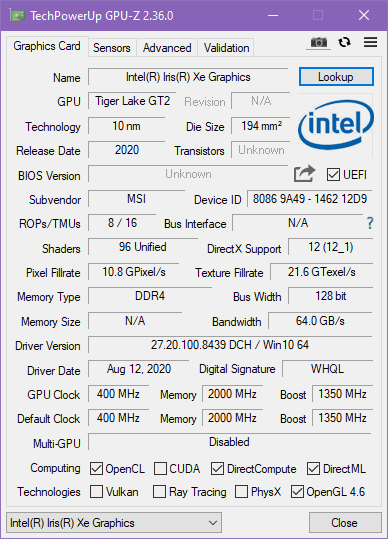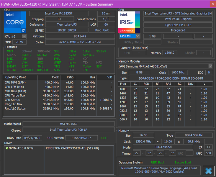 В MSI Stealth 15M установлен процессор Intel Core i7-1185G7 свежайшего 11-го поколения (Tiger Lake). Именно благодаря его встроенному контроллеру в ноутбуке реализован порт Thunderbolt 4. В практическом смысле нам интересно, что старшие (от Core i5) новые процессоры имеют продвинутое графическое ядро Iris Xe, и мы даже опробовали его в деле. В целом анонсированные новые процессоры относятся к категории ультрамобильных (U), но Intel отказалась от традиционной номенклатуры и теперь подчеркивает в названии уровень интегрированной графики (G7 — Iris Xe с 80/96 исполнительными блоками, G4 — UHD Graphics Xe с 48 исполнительными блоками). Уровень тепловыделения может меняться (вместе с базовой частотой) в широких пределах — от 12 до 28 Вт (опять же, у старших моделей в линейке).