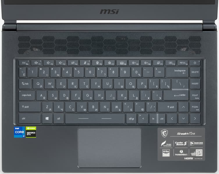 Модель Stealth 15M представлена в нескольких конфигурациях. Мы получили на тест ноутбук с видеокартой Nvidia GeForce GTX 1660 Ti (Max-Q), также есть вариант с видеокартой GeForce RTX 2060 (Max-Q). Отличительная особенность новых моделей — использование процессора Intel Core 11-го поколения (Tiger Lake). В данном случае мы можем уверенно говорить только об использовании Core i7-1185G7, хотя, вероятно, в рознице будут доступны и другие варианты. Еще в этих моделях могут устанавливаться разные 15,6-дюймовые экраны: с частотой обновления около 60 Гц, 144 Гц и 240 Гц — во всех случаях с разрешением Full HD.