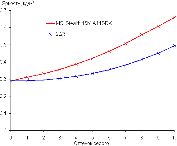 Рост прироста яркости более-менее равномерный и почти каждый следующий оттенок значимо ярче предыдущего, однако в светах равномерность роста нарушается, а один ближайший к белому оттенок по яркости от белого не отличается. В самой темной области хорошо различаются все оттенки, что для игрового ноутбука особенно актуально: