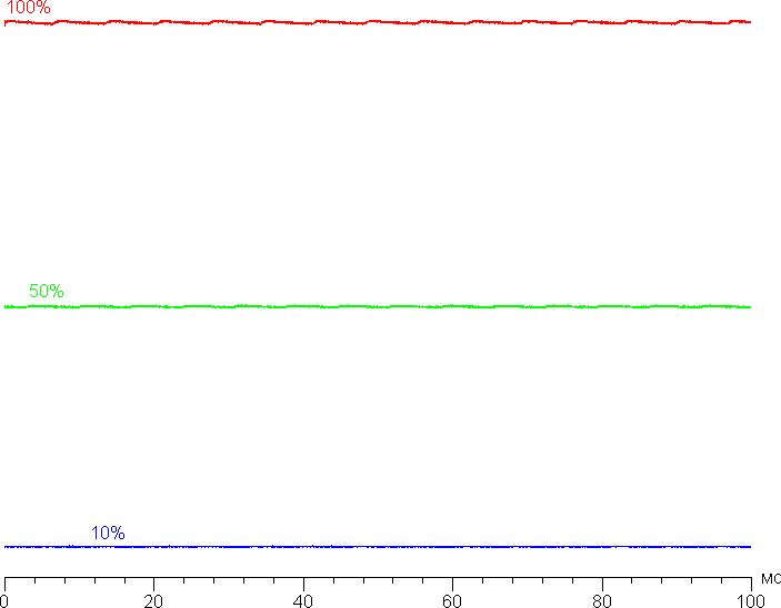 На любом уровне яркости значимая модуляция подсветки отсутствует, поэтому нет и никакого мерцания экрана. В доказательство приведем графики зависимости яркости (вертикальная ось) от времени (горизонтальная ось) при различных значениях настройки яркости: