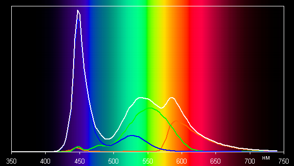 Такой спектр с относительно узким пиком синего и с широкими горбами зеленого и красного цветов характерен для экранов, в которых используется белая светодиодная подсветка с синим излучателем и желтым люминофором. Спектры показывают, что светофильтры матрицы значительно подмешивают компоненты друг к другу, что и сужает цветовой охват.