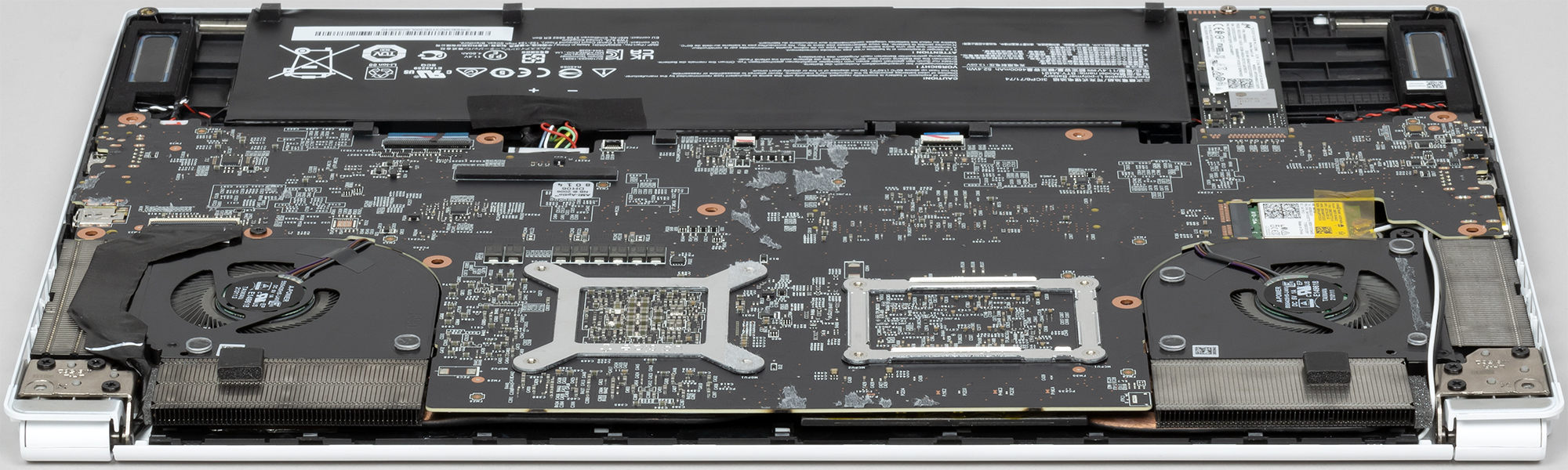 Как и у большинства современных ноутбуков, внутренняя часть корпуса поделена на две части, примерно треть занимает батарея, состоящая из трех ячеек и имеющая емкость 52,4 Вт·ч. Она занимает не всю ширину корпуса, с одного бока в слот М.2 еще устанавливается SSD-накопитель, и все равно по бокам остается немало свободного места. Но второго слота М.2 нет, и единственная возможность апгрейда дисковой подсистемы — замена имеющегося накопителя (его форм-фактор M.2 2280).