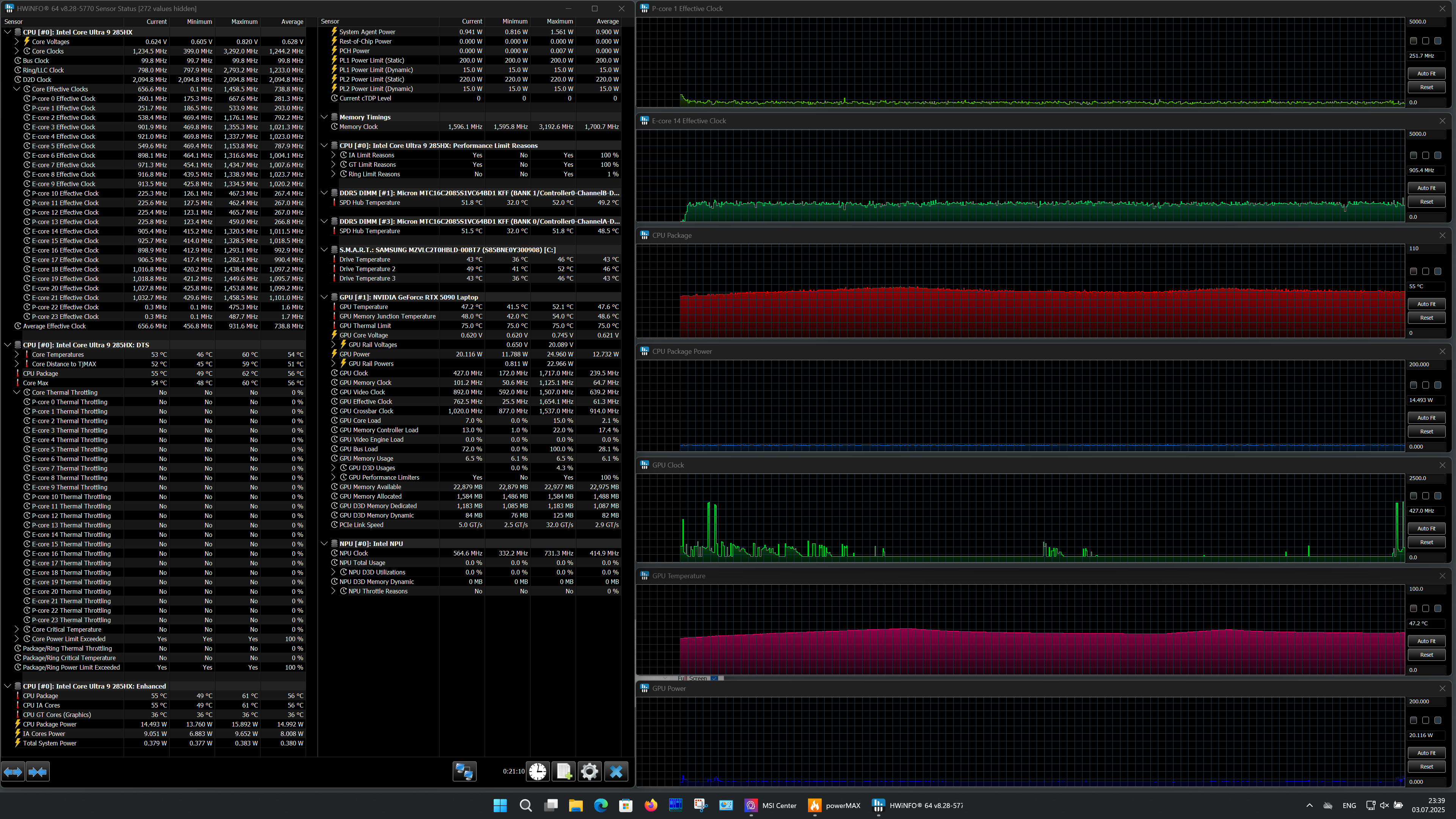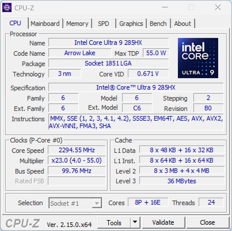 | Процессор | Intel Core Ultra 9 285HX: 8 P-ядер/8 потоков, 2,8 ГГц (Turbo 5,5 ГГц), 16 E-ядер/16 потоков; 2,1 ГГц (Turbo 4,6 ГГц); TDP 45—55 Вт (Turbo 160 Вт), Tjmax 105 °C; NPU AI Boost (13 TOPS) | |