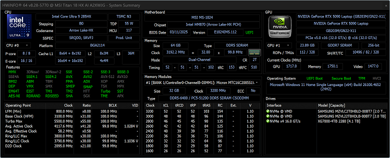 В настоящем обзоре мы будем сравнивать некоторые показатели быстродействия компонентов MSI Titan 18 HX AI A2XWJG с достижениями двух других ноутбуков, которые участвовали в аналогичных экспериментах ранее: