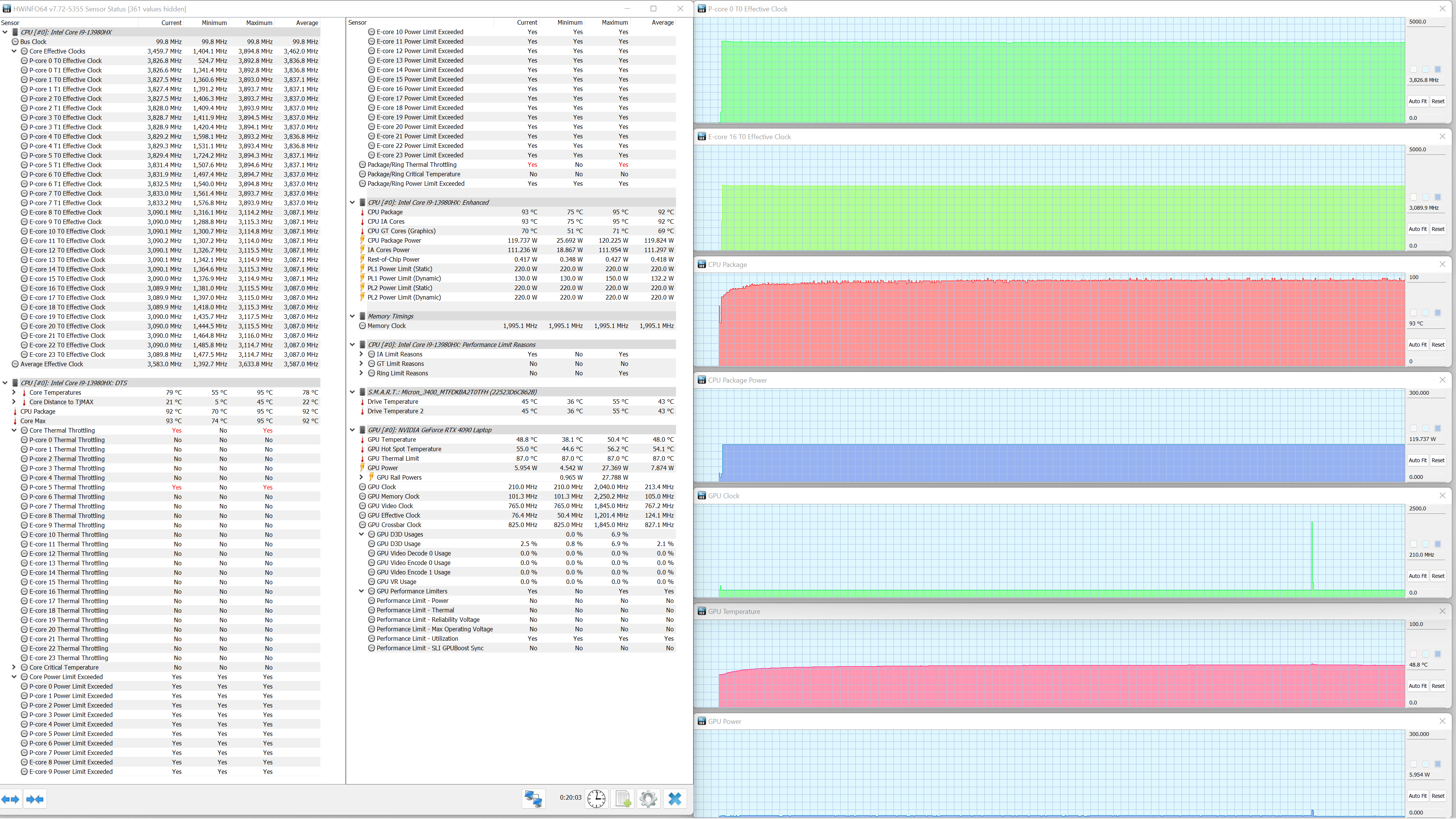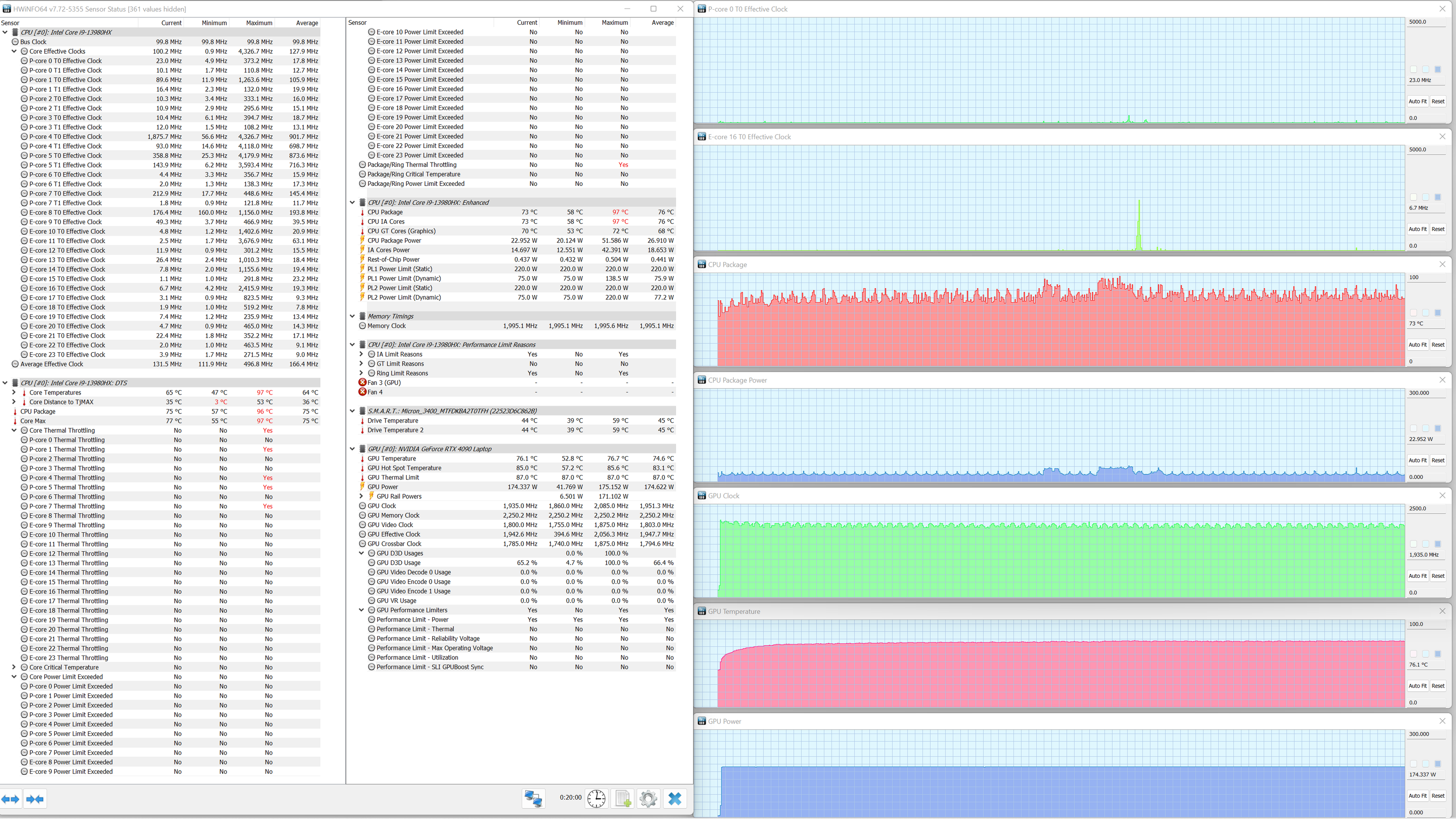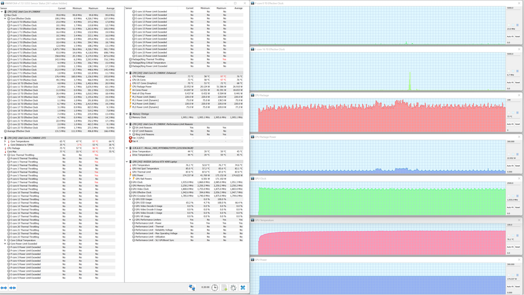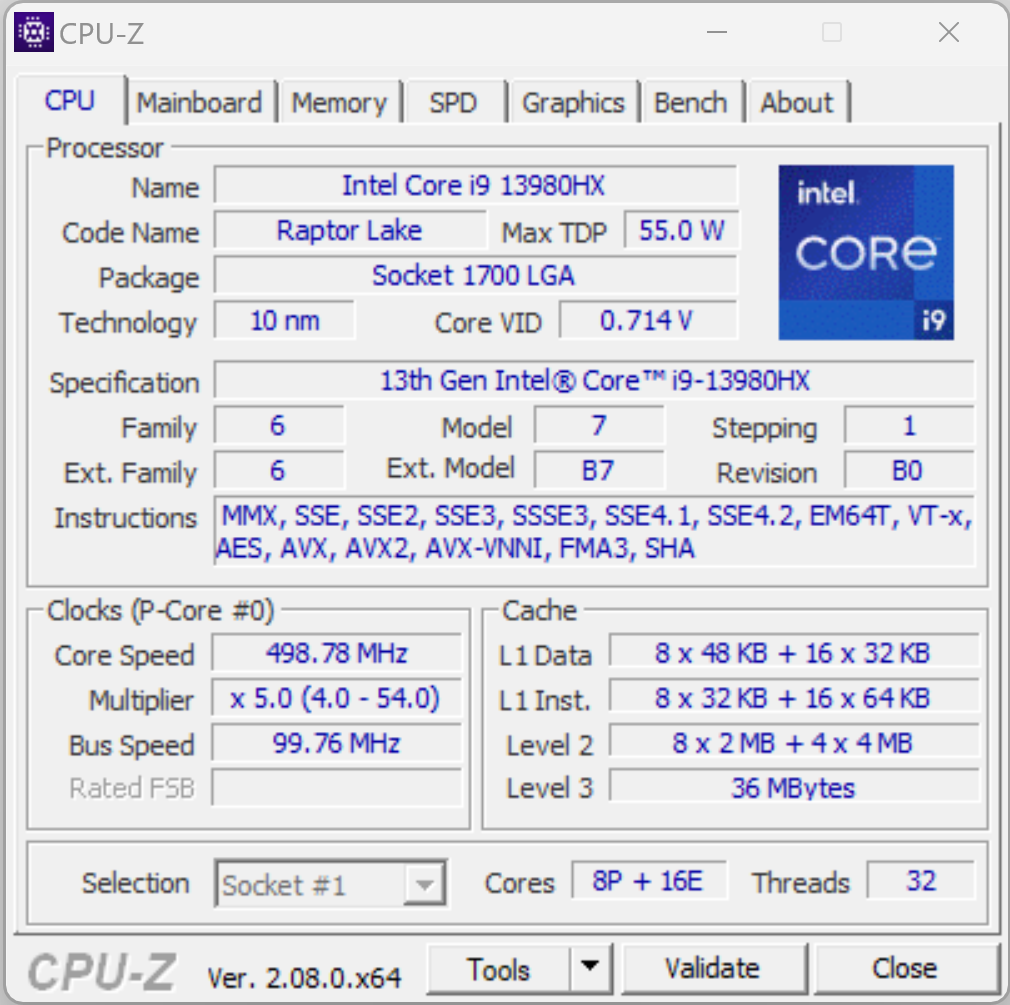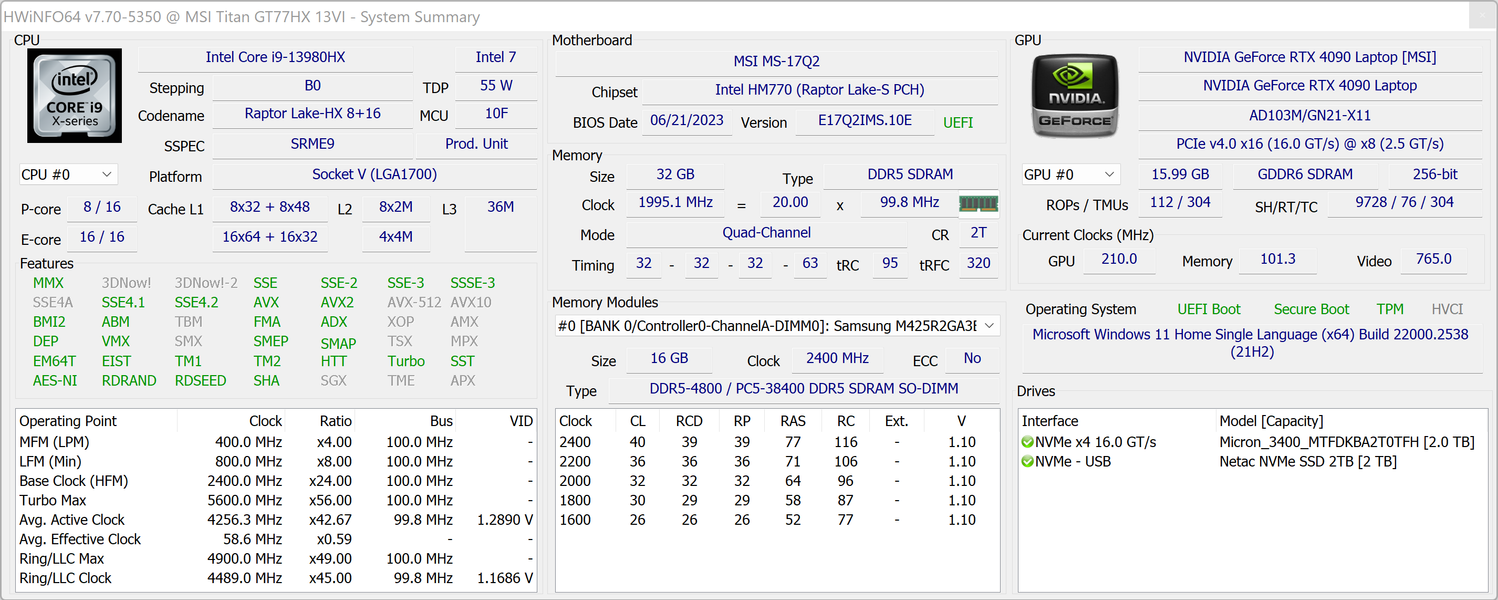 MSI Titan GT77 HX 13VI оснащен мобильным процессором Intel Core i9-13980HX (кодовое наименование Raptor Lake-HX) — это современное и одно из самых быстродействующих решений для портативных ПК. Процессор содержит в своем составе восемь высокопроизводительных ядер (Performance Cores, P-cores), работающих в режиме Hyper-Threading (16 потоков), и 16 однопоточных энергоэффективных ядер (Efficiency Cores, E-cores). Тактовая частота по паспорту — 2,2 ГГц в стабильном режиме и 5,6 ГГц при Turbo Boost, TDP 45—55 Вт (определяется производителем) и 157 Вт при разгоне. Максимальная рабочая температура — 100 °C. Низкоуровневые параметры центрального процессора представлены ниже на скриншоте утилиты HWInfo.