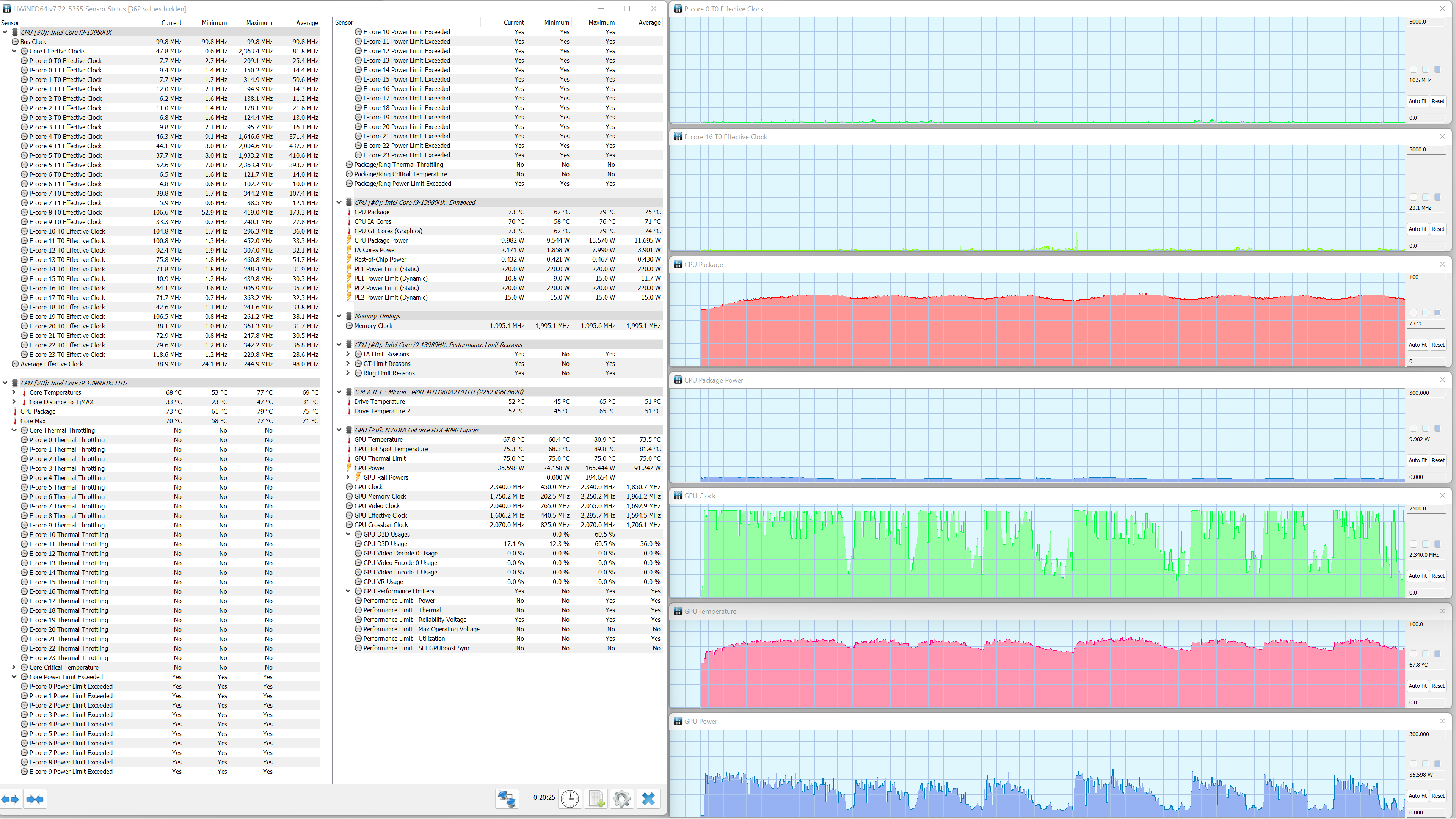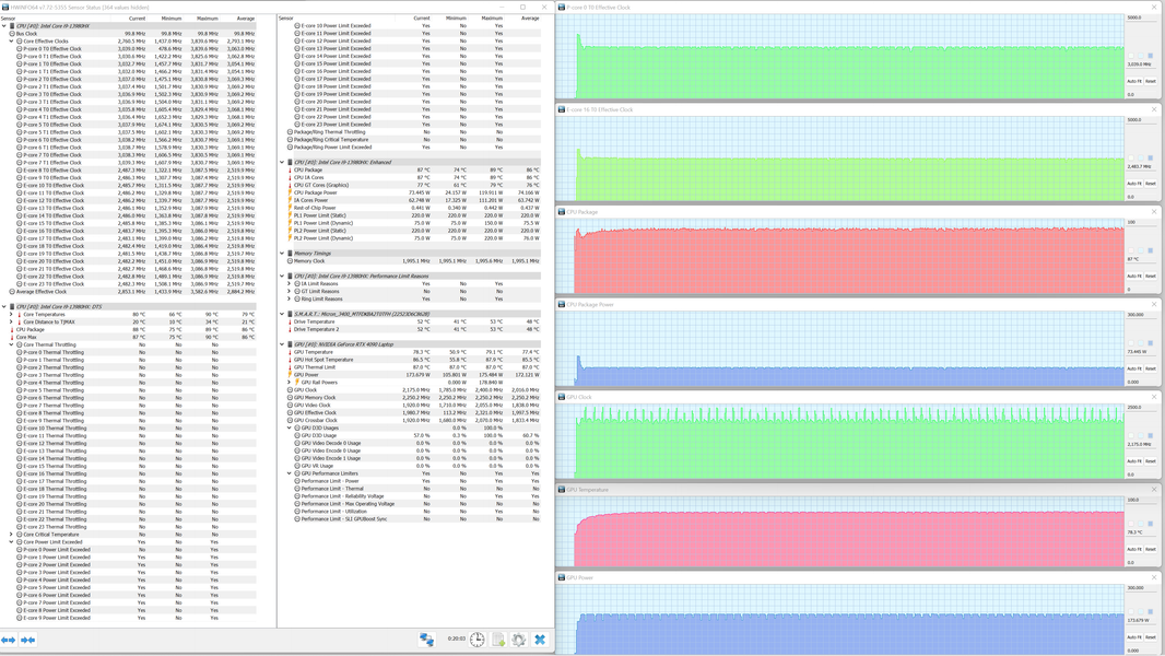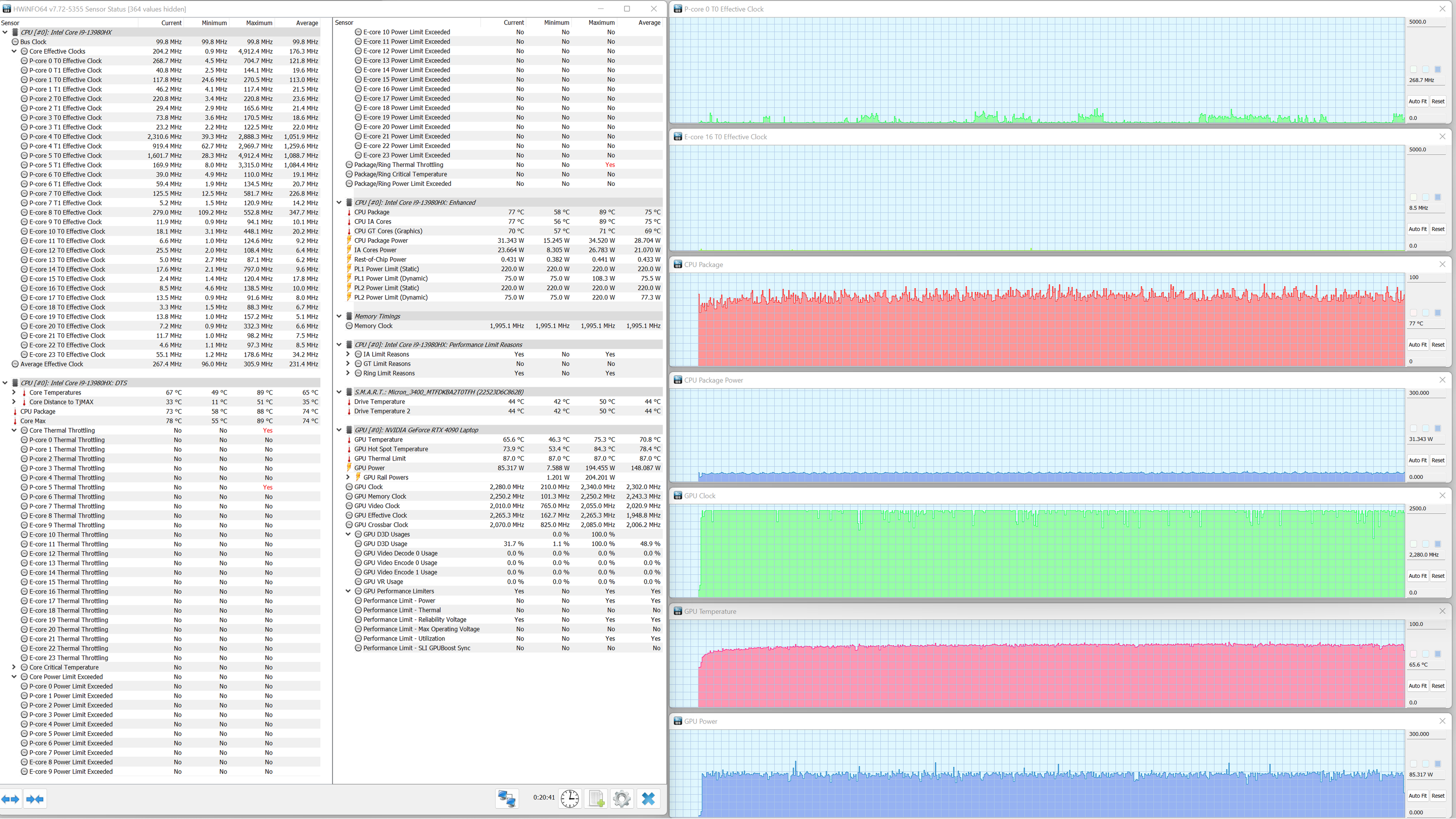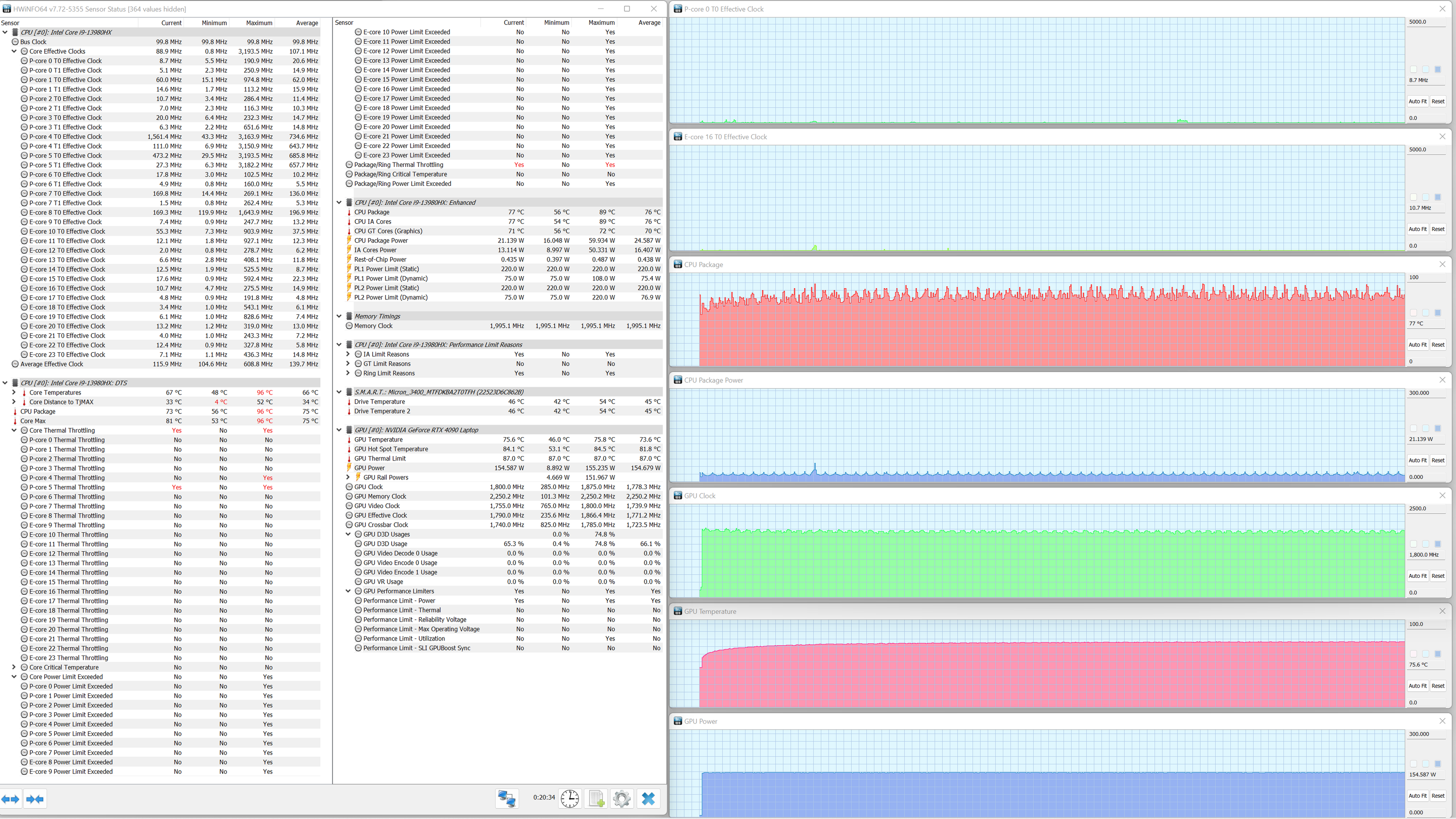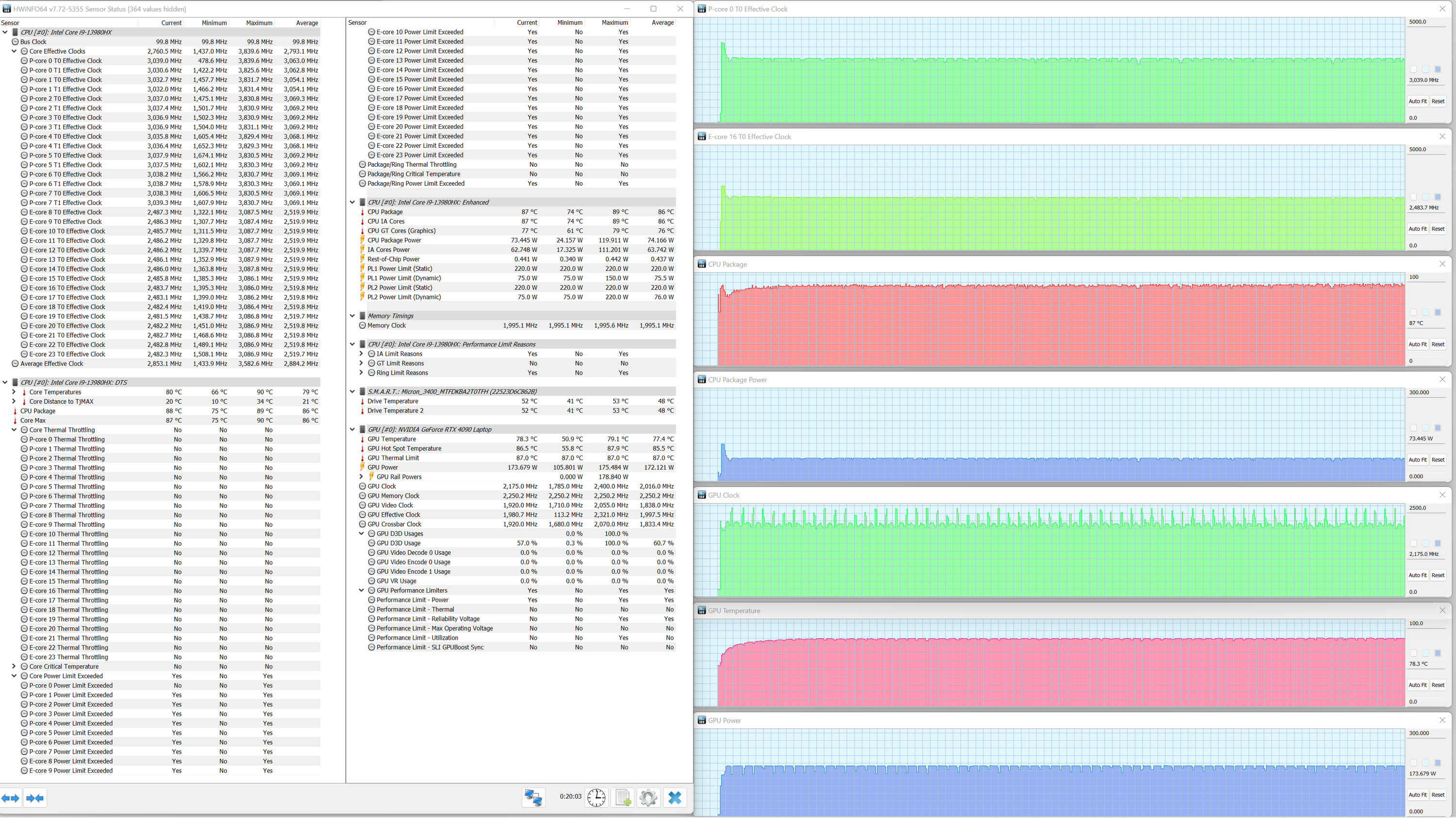 MSI Titan GT77 HX 13VI оснащен мобильным процессором Intel Core i9-13980HX (кодовое наименование Raptor Lake-HX) — это современное и одно из самых быстродействующих решений для портативных ПК. Процессор содержит в своем составе восемь высокопроизводительных ядер (Performance Cores, P-cores), работающих в режиме Hyper-Threading (16 потоков), и 16 однопоточных энергоэффективных ядер (Efficiency Cores, E-cores). Тактовая частота по паспорту — 2,2 ГГц в стабильном режиме и 5,6 ГГц при Turbo Boost, TDP 45—55 Вт (определяется производителем) и 157 Вт при разгоне. Максимальная рабочая температура — 100 °C. Низкоуровневые параметры центрального процессора представлены ниже на скриншоте утилиты HWInfo.