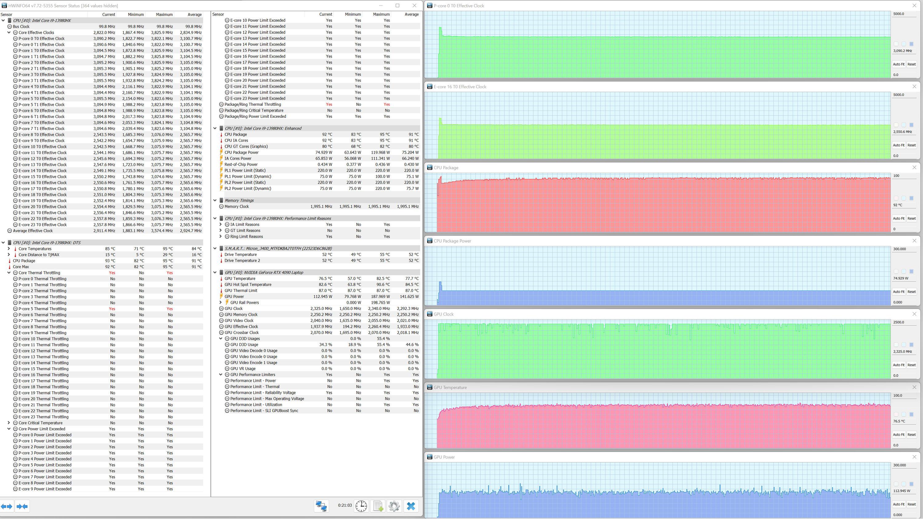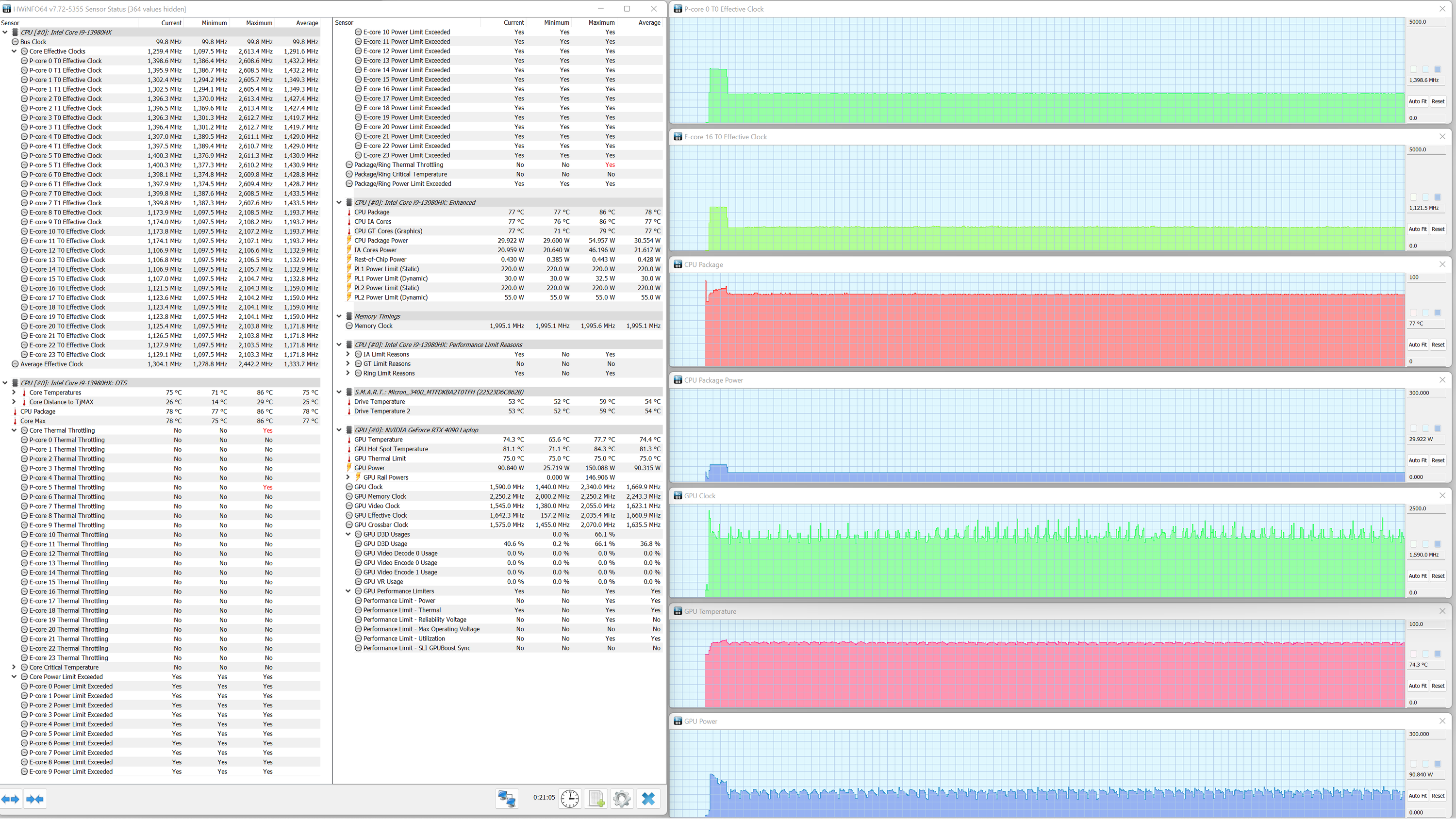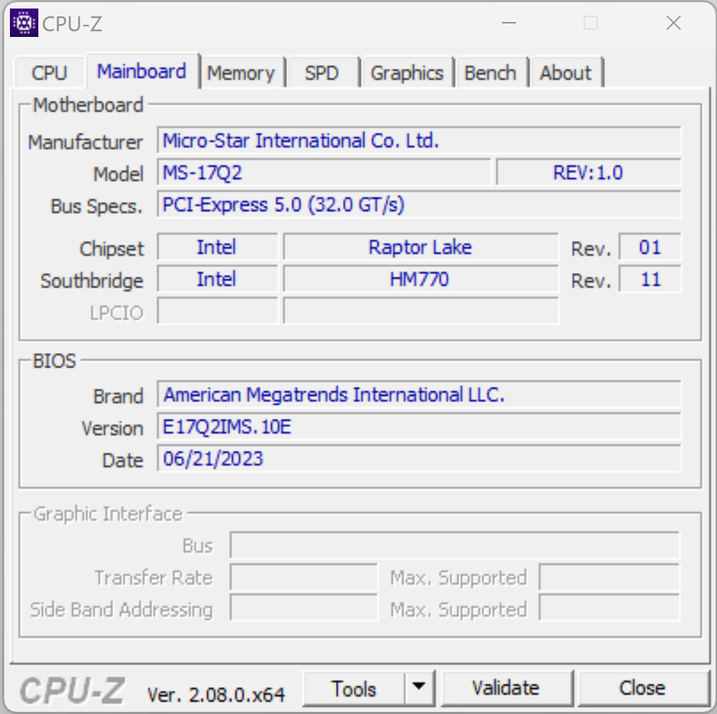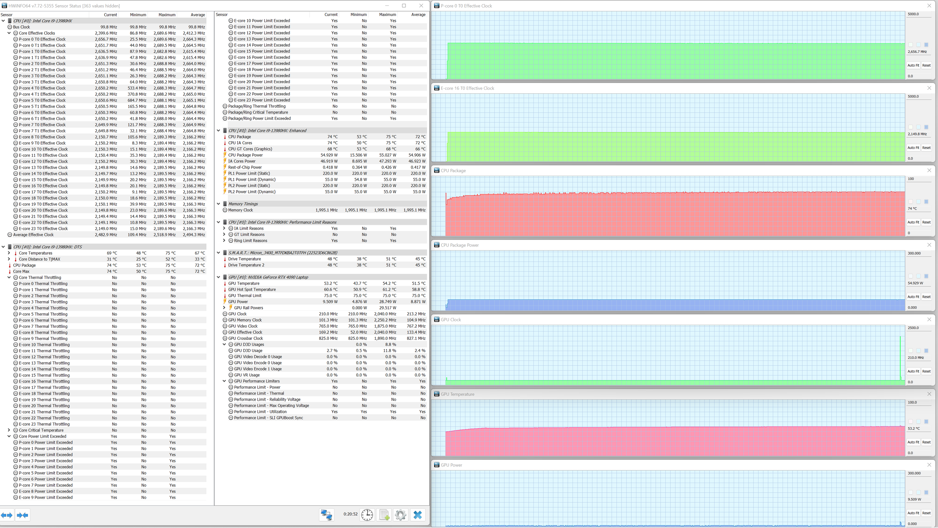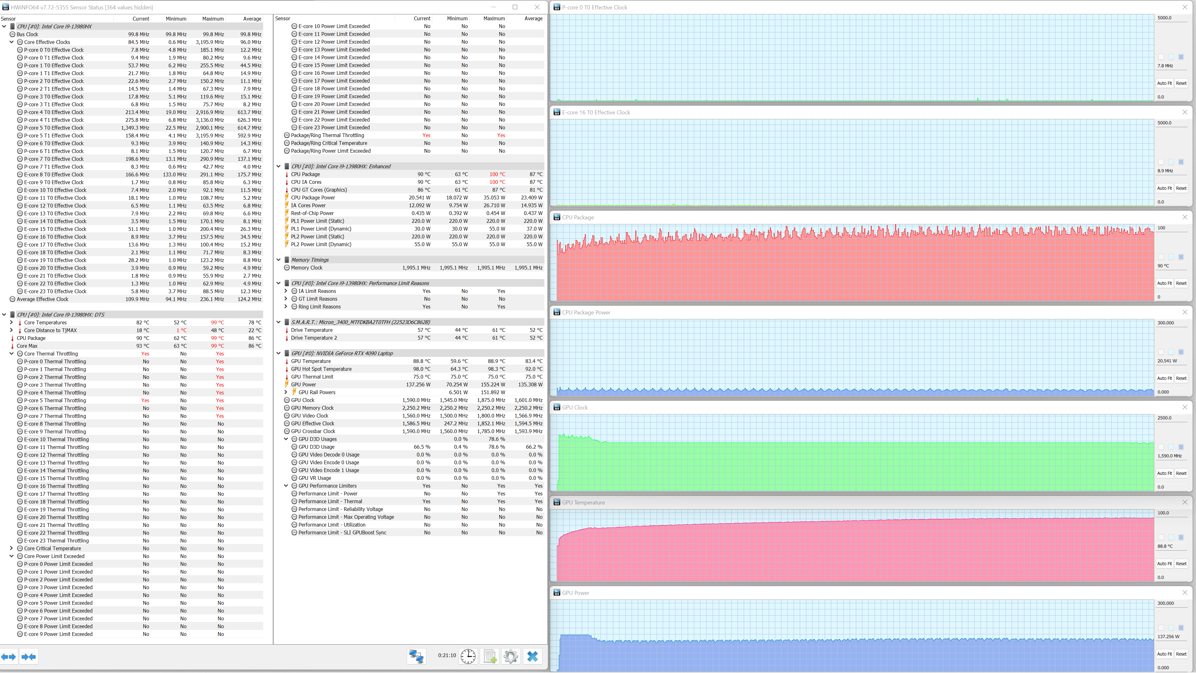 MSI Titan GT77 HX 13VI оснащен мобильным процессором Intel Core i9-13980HX (кодовое наименование Raptor Lake-HX) — это современное и одно из самых быстродействующих решений для портативных ПК. Процессор содержит в своем составе восемь высокопроизводительных ядер (Performance Cores, P-cores), работающих в режиме Hyper-Threading (16 потоков), и 16 однопоточных энергоэффективных ядер (Efficiency Cores, E-cores). Тактовая частота по паспорту — 2,2 ГГц в стабильном режиме и 5,6 ГГц при Turbo Boost, TDP 45—55 Вт (определяется производителем) и 157 Вт при разгоне. Максимальная рабочая температура — 100 °C. Низкоуровневые параметры центрального процессора представлены ниже на скриншоте утилиты HWInfo.