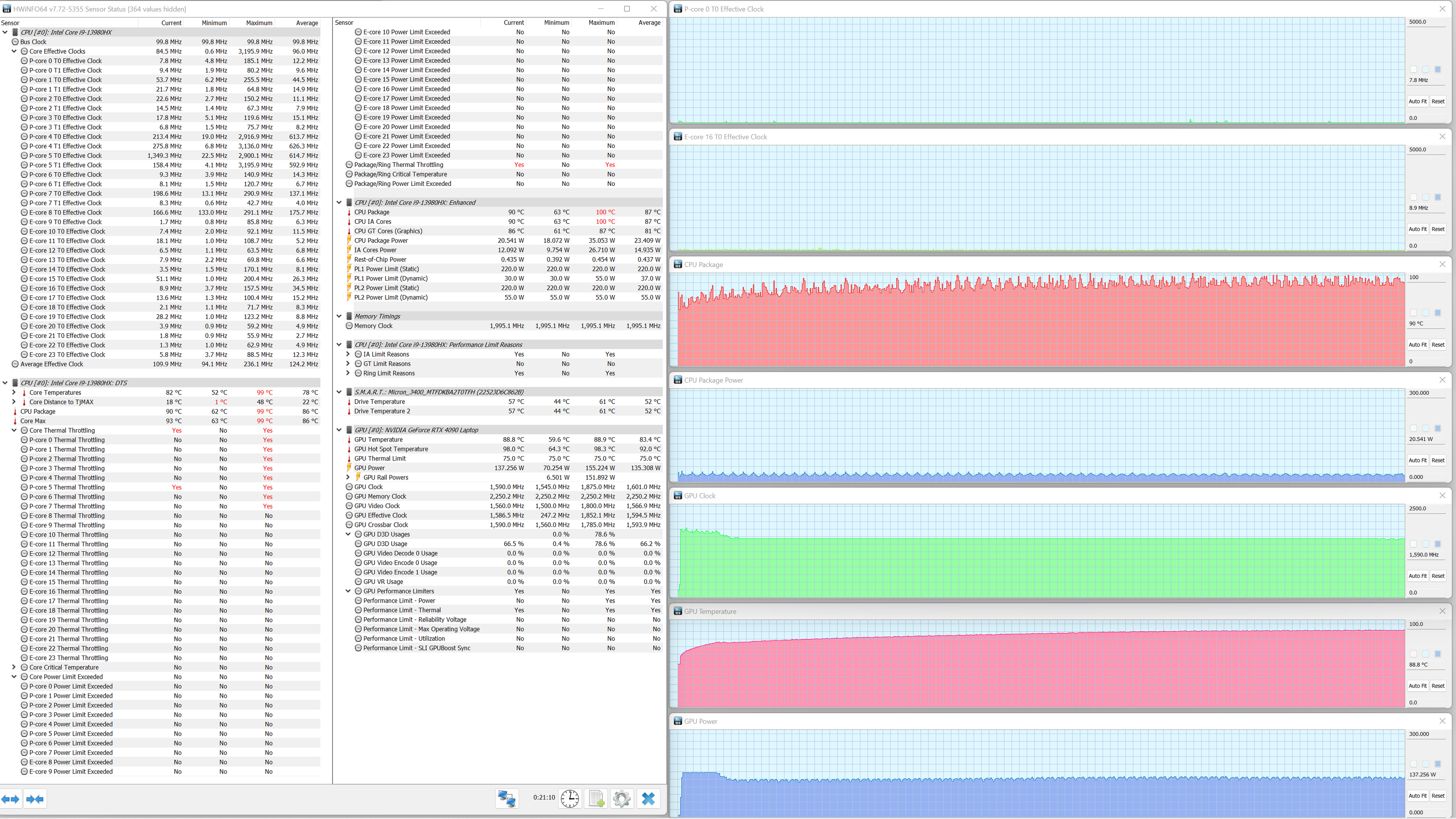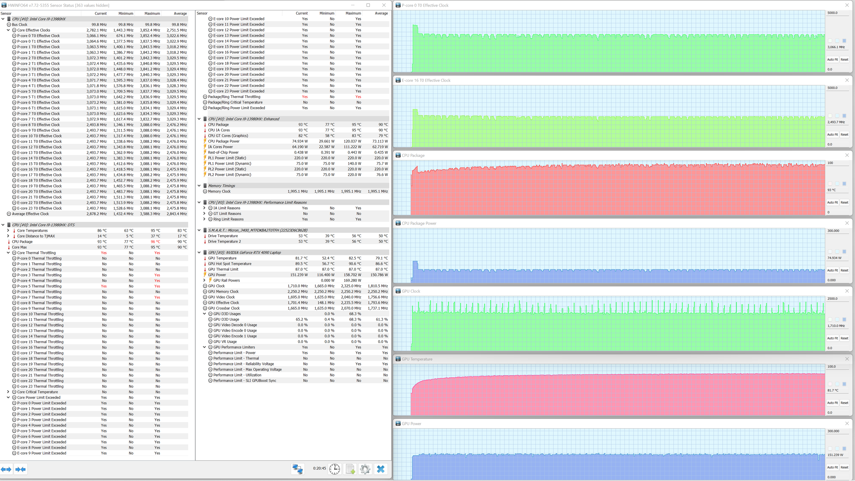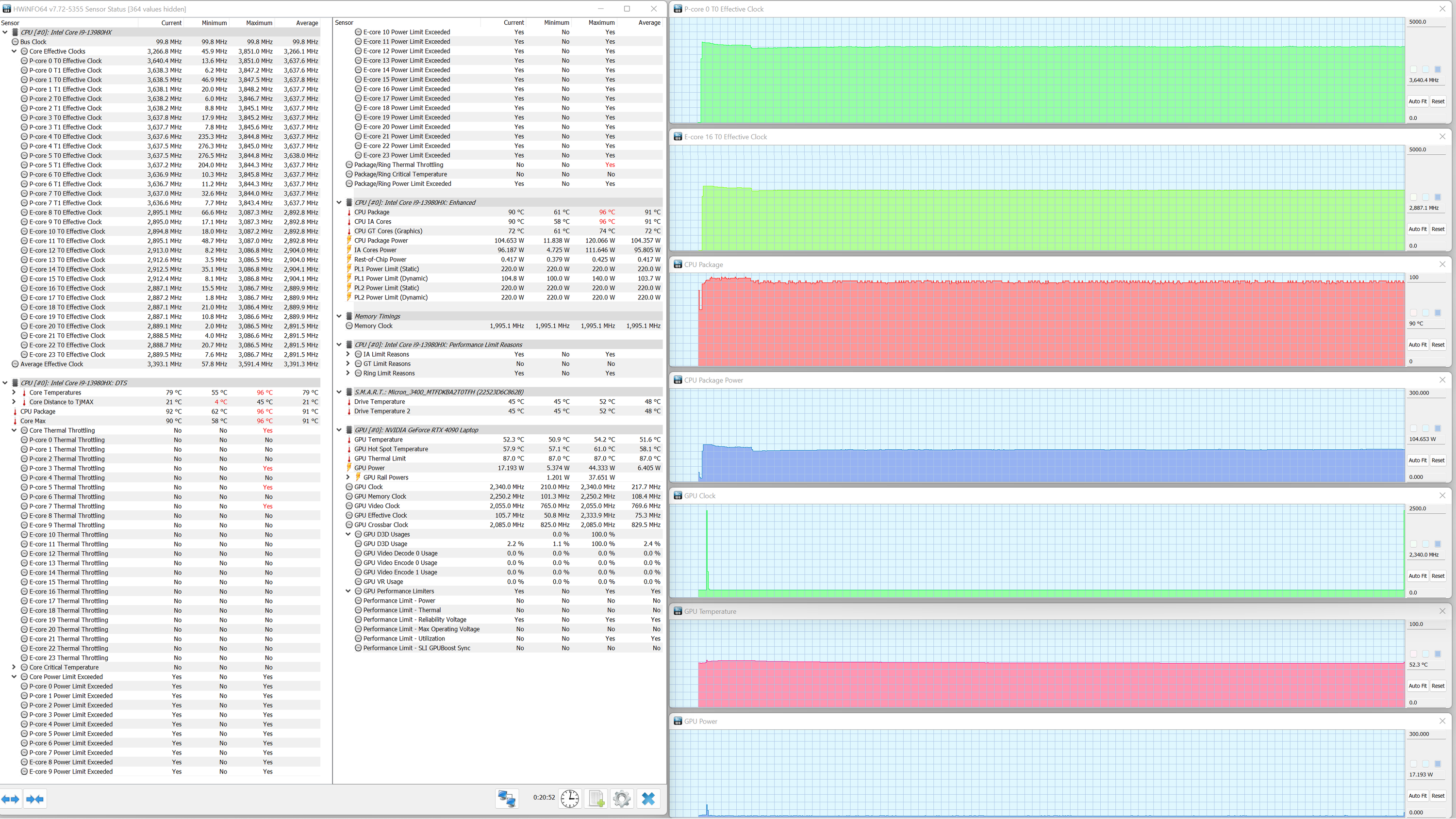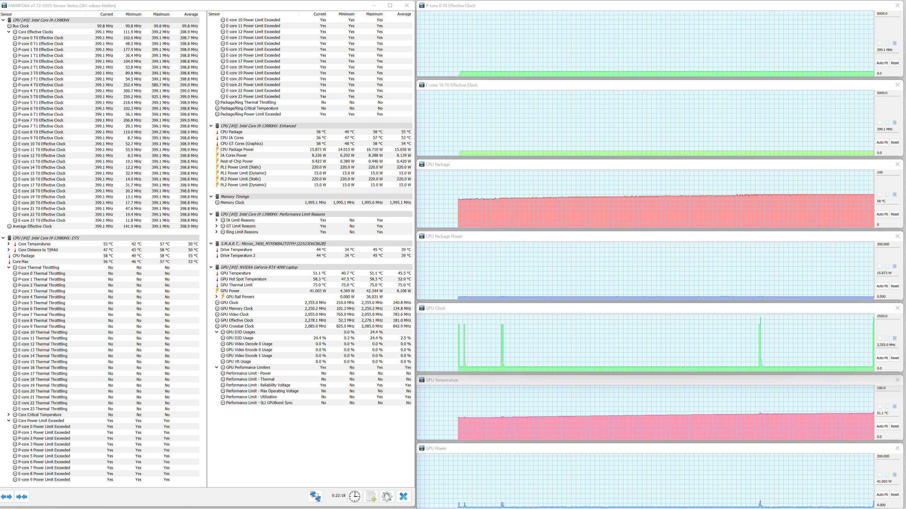 MSI Titan GT77 HX 13VI оснащен мобильным процессором Intel Core i9-13980HX (кодовое наименование Raptor Lake-HX) — это современное и одно из самых быстродействующих решений для портативных ПК. Процессор содержит в своем составе восемь высокопроизводительных ядер (Performance Cores, P-cores), работающих в режиме Hyper-Threading (16 потоков), и 16 однопоточных энергоэффективных ядер (Efficiency Cores, E-cores). Тактовая частота по паспорту — 2,2 ГГц в стабильном режиме и 5,6 ГГц при Turbo Boost, TDP 45—55 Вт (определяется производителем) и 157 Вт при разгоне. Максимальная рабочая температура — 100 °C. Низкоуровневые параметры центрального процессора представлены ниже на скриншоте утилиты HWInfo.