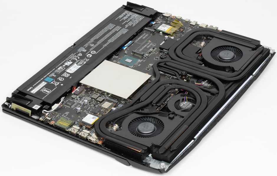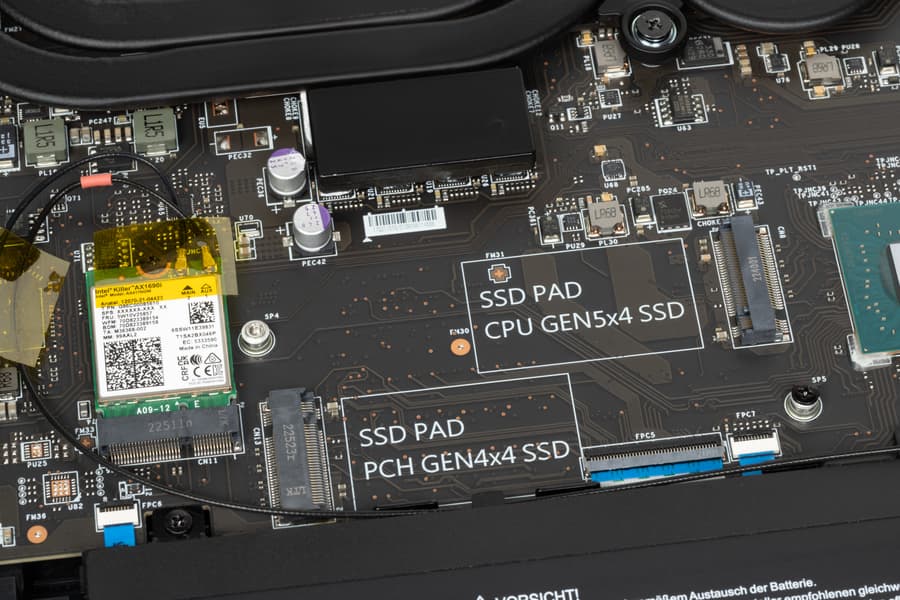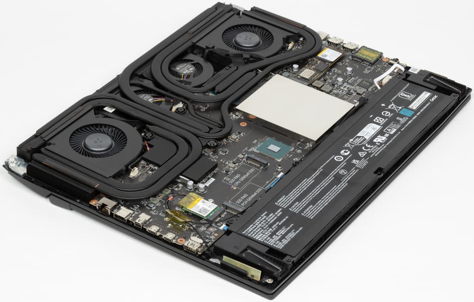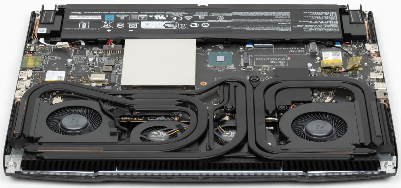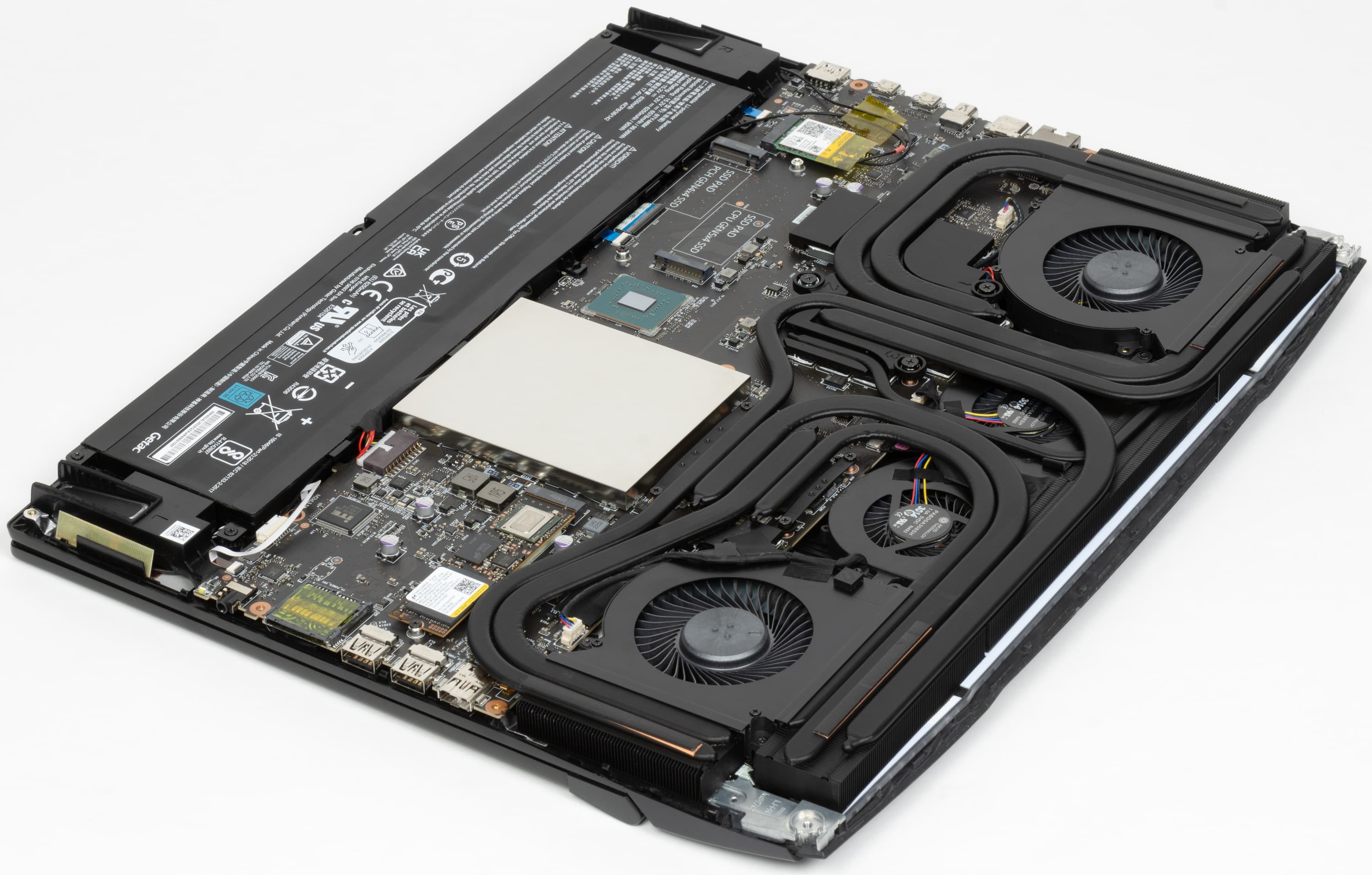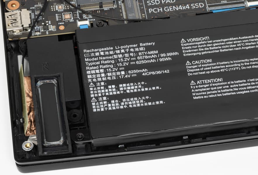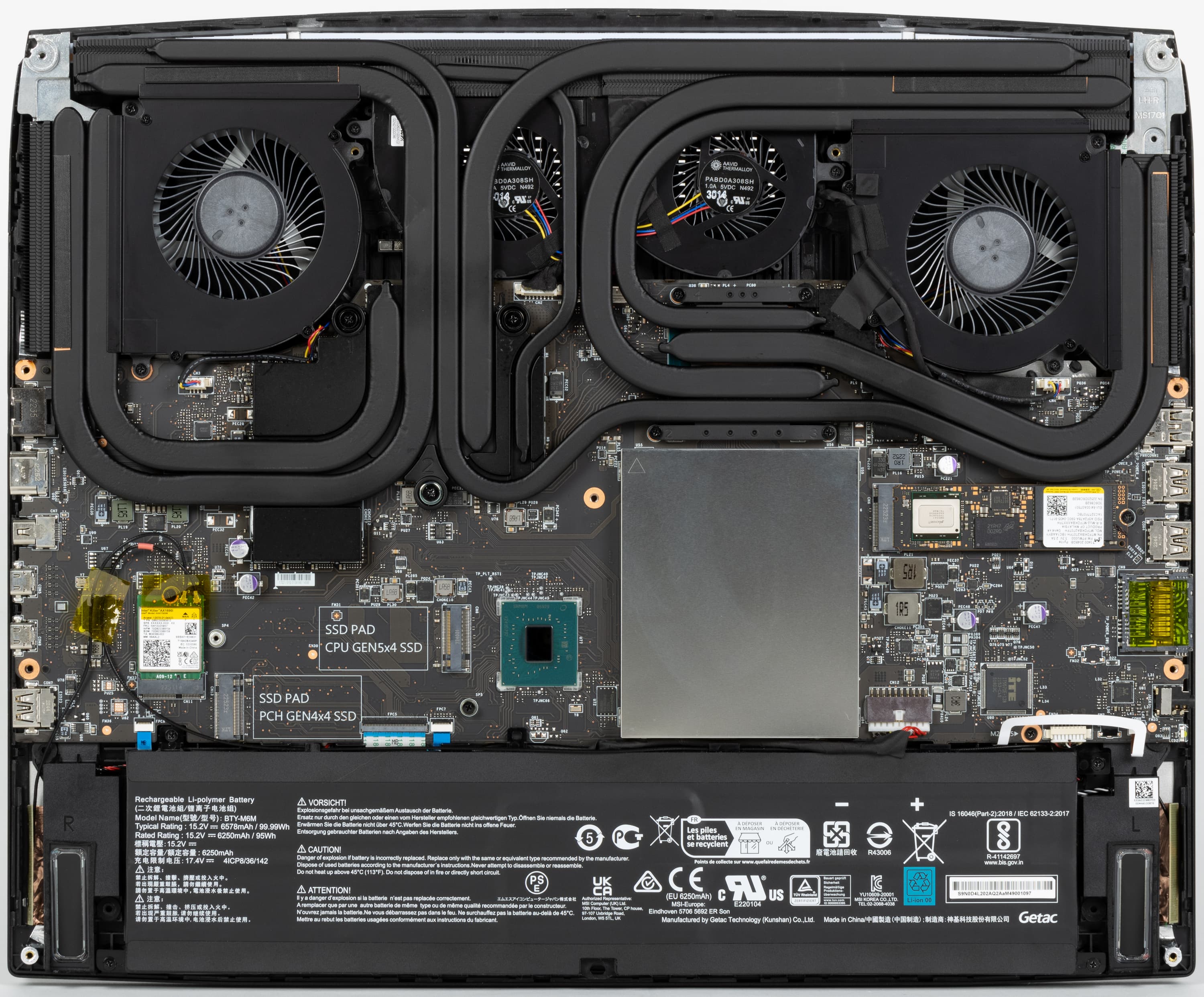 Снятие днища позволяет получить получить доступ к компонентам аппаратной оснастки MSI Titan GT77 HX 13VI. Во внутреннем объеме доминируют три наиболее крупных детали: система охлаждения, материнская плата и аккумулятор. Первая цельная, однокомпонентная. Аппаратная модернизация предусматривает возможность увеличения объема оперативной памяти, добавление двух дополнительных накопителей в два свободных слота M.2 — один PCIe 5 ×4, другой PCIe 4 ×4 (как у системного NVMe). Вдобавок можно заменить беспроводной адаптер и аккумулятор.