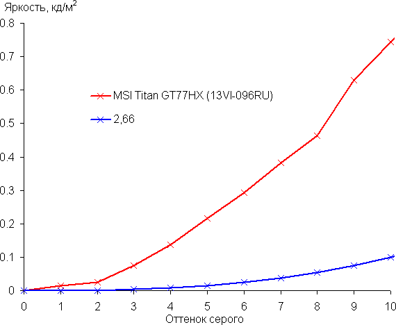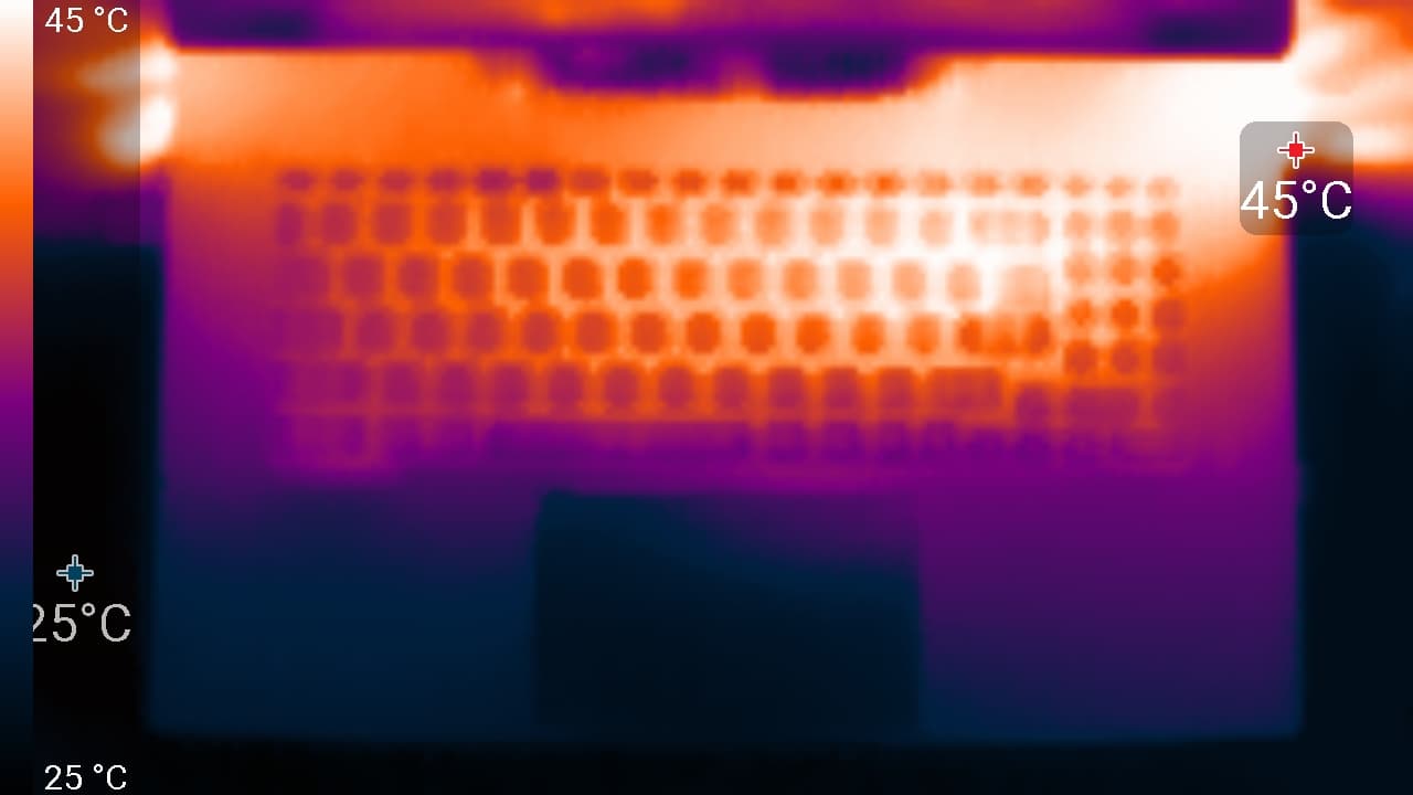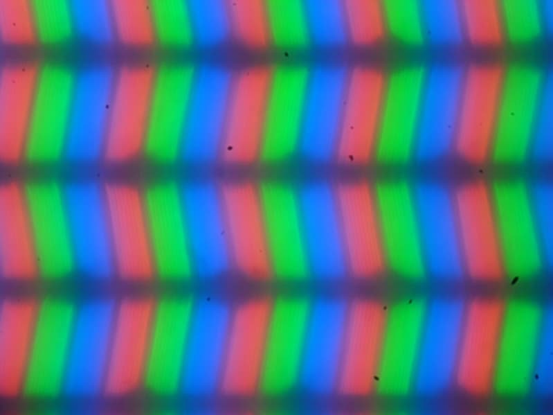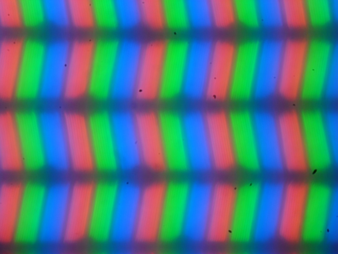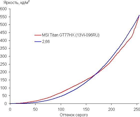 Внешняя поверхность матрицы черная жесткая и полуматовая (зеркальность хорошо выражена). Какие-либо специальные антибликовые покрытия или фильтр отсутствуют, нет и воздушного промежутка. При питании от сети или от батареи и при ручном управлении яркостью (автоматической подстройки по датчику освещенности нет) ее максимальное значение в режиме SDR составило порядка 560 кд/м² (в центре экрана на белом фоне). Максимальная яркость очень высокая, поэтому за ноутбуком можно будет работать/играть на улице ясным днем, если расположиться хотя бы не под прямыми солнечными лучами.