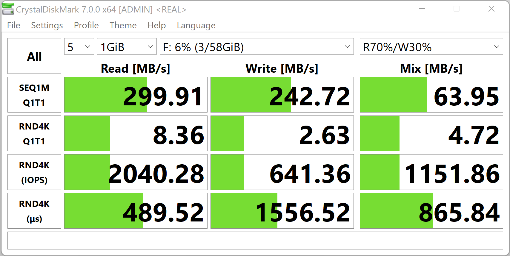 Здесь видим обещанные производителем носителя 300 МБ/с при чтении и немного меньше паспортных 299 МБ/с при записи.