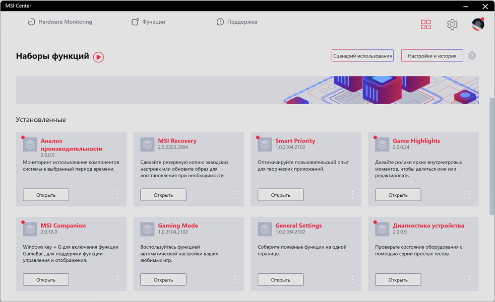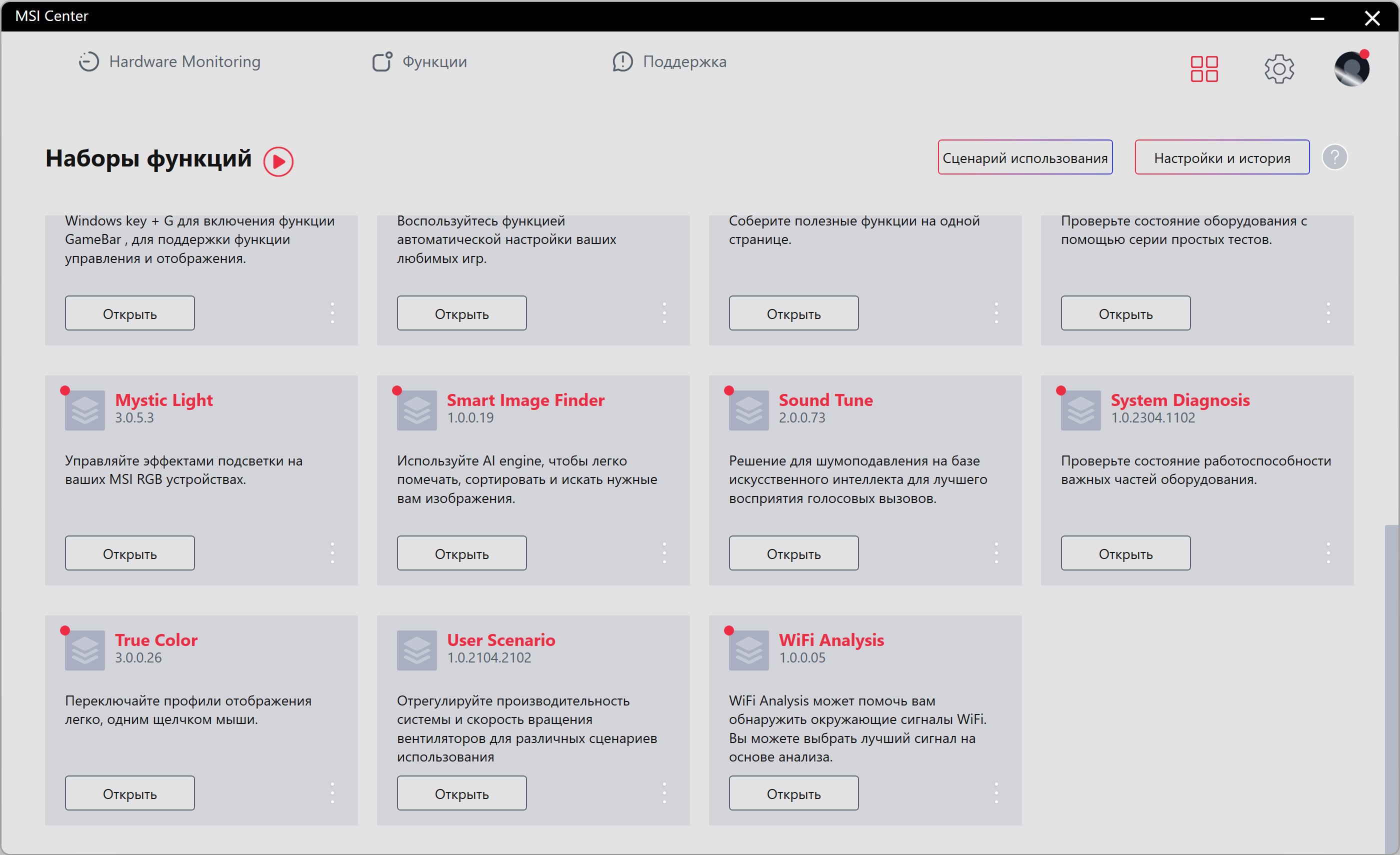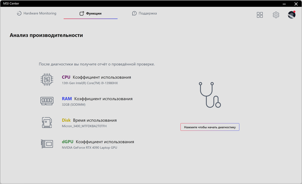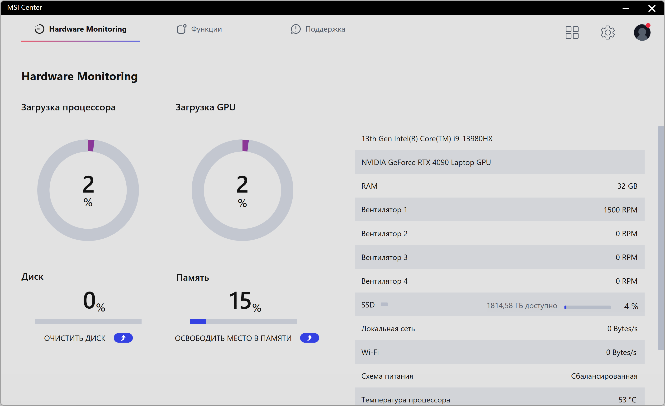 Основные опции сгруппированы в виде трех вкладок: Hardware Monitoring (системный монитор), «Функции» и «Поддержка». Первая позволяет определить загрузку CPU и GPU, заполненность системного накопителя и оперативной памяти, скорости вращения вентиляторов.