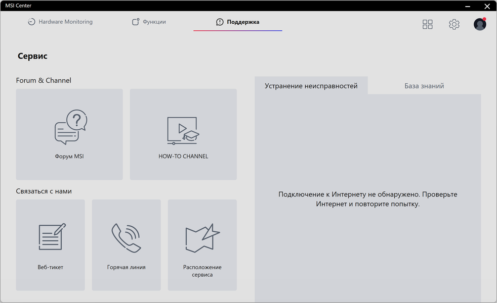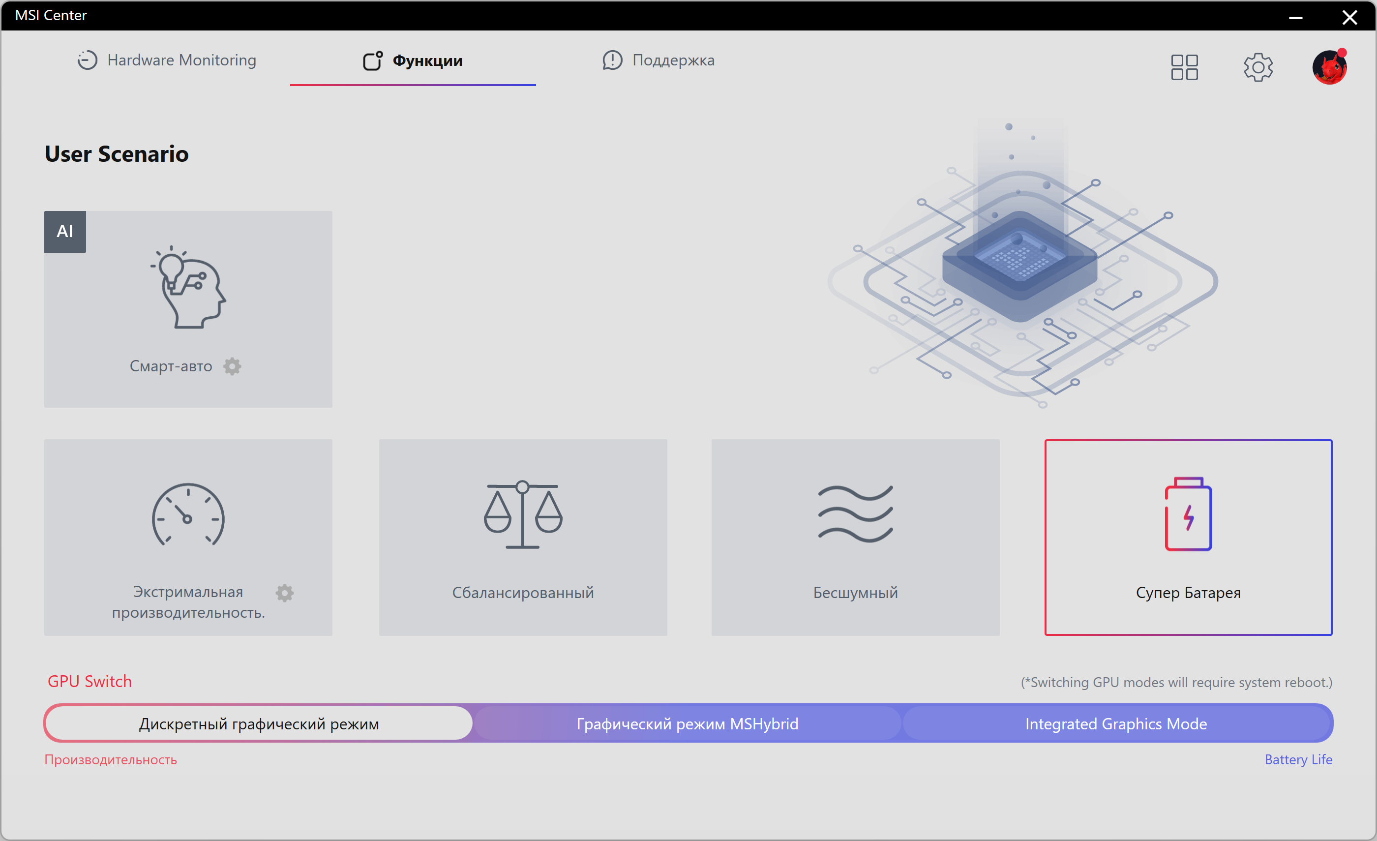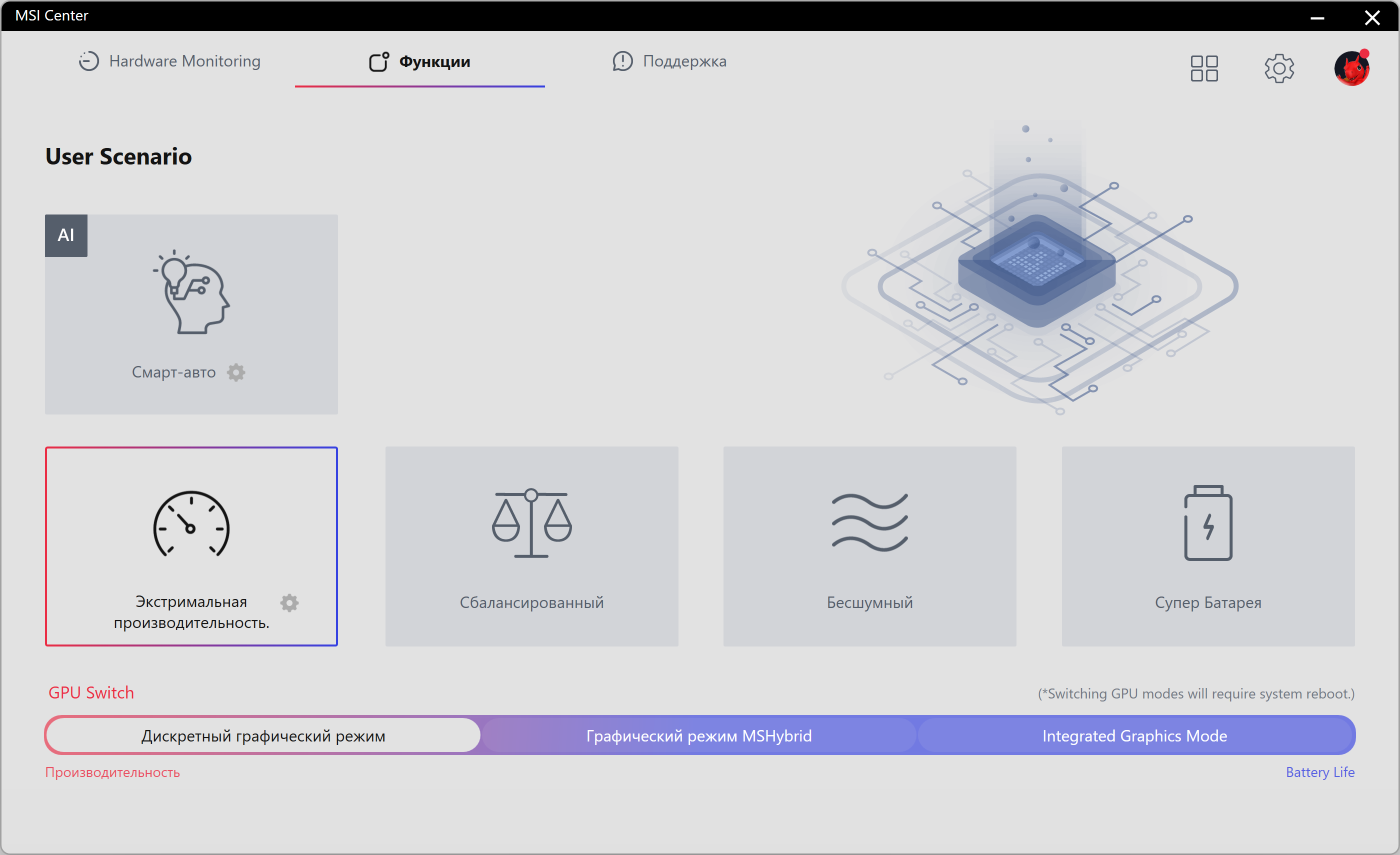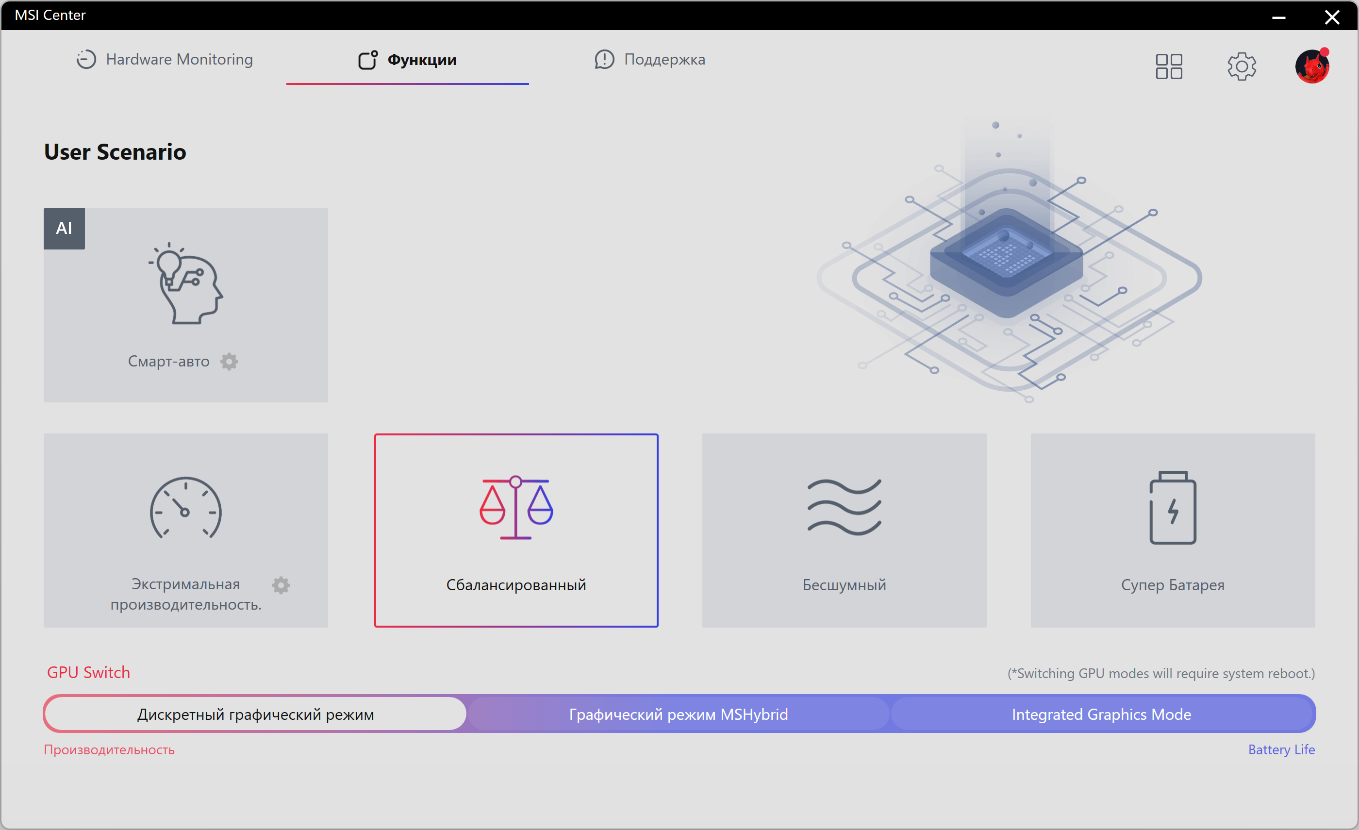 Основные опции сгруппированы в виде трех вкладок: Hardware Monitoring (системный монитор), «Функции» и «Поддержка». Первая позволяет определить загрузку CPU и GPU, заполненность системного накопителя и оперативной памяти, скорости вращения вентиляторов.
