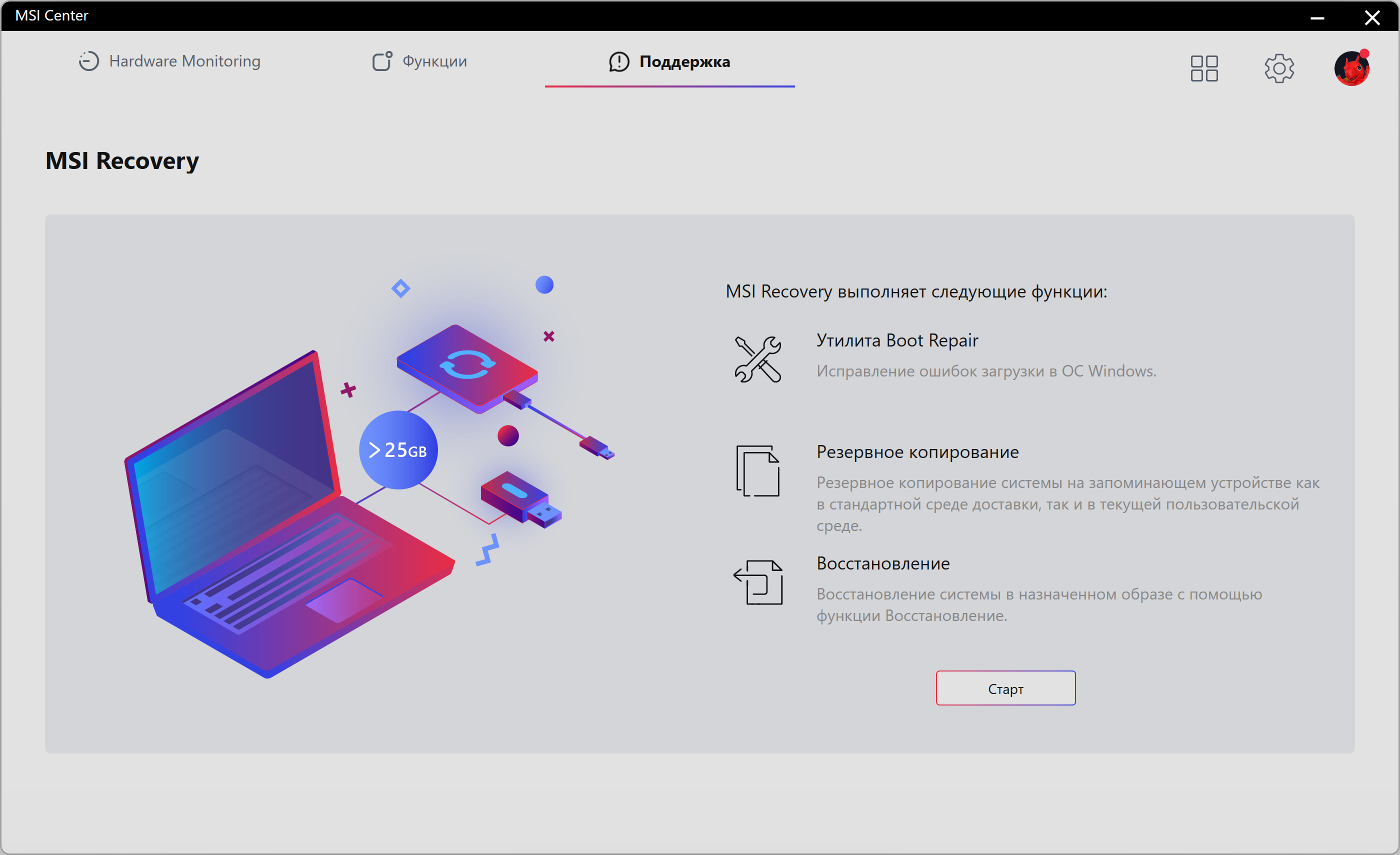 MSI Recovery служит для восстановления работоспособности системы при возникновении неустранимых ошибок при ее запуске.