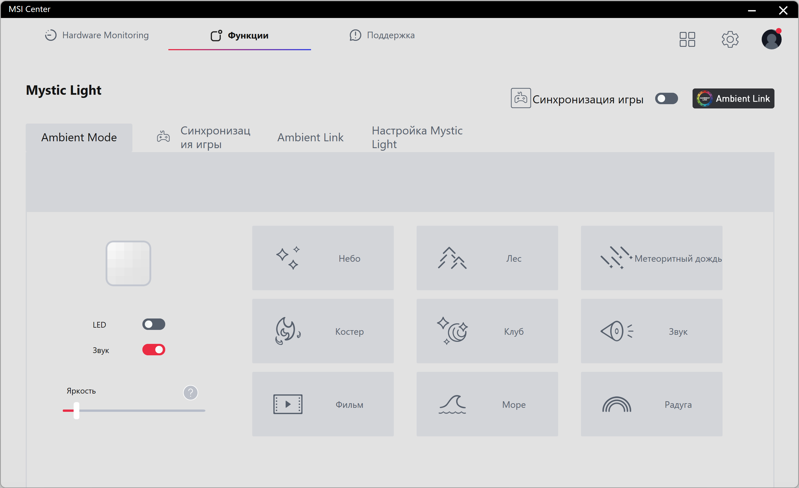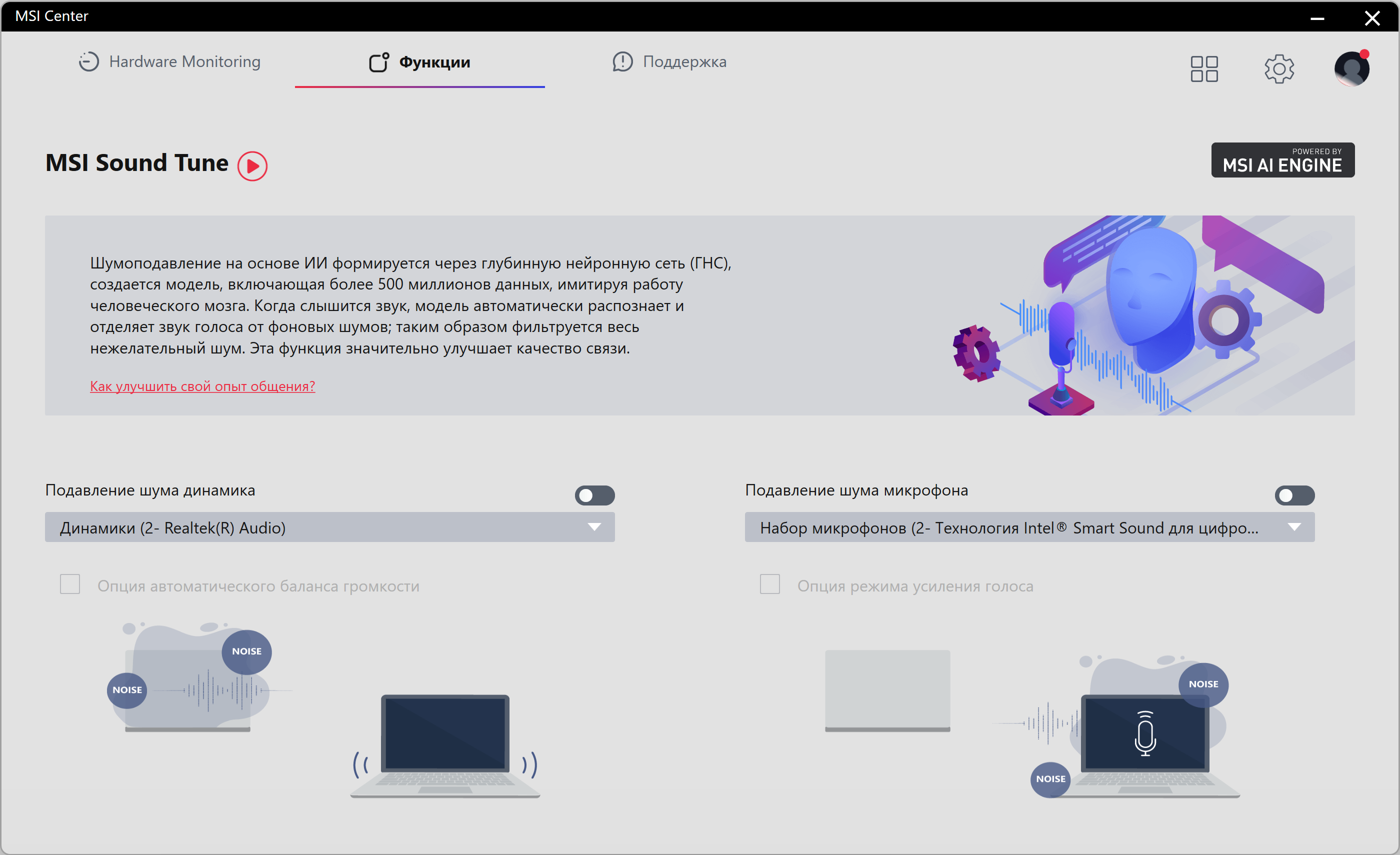 MSI Sound Tune (настройка звука) содержит функции управления шумоподавлением и чистотой акустических эффектов.