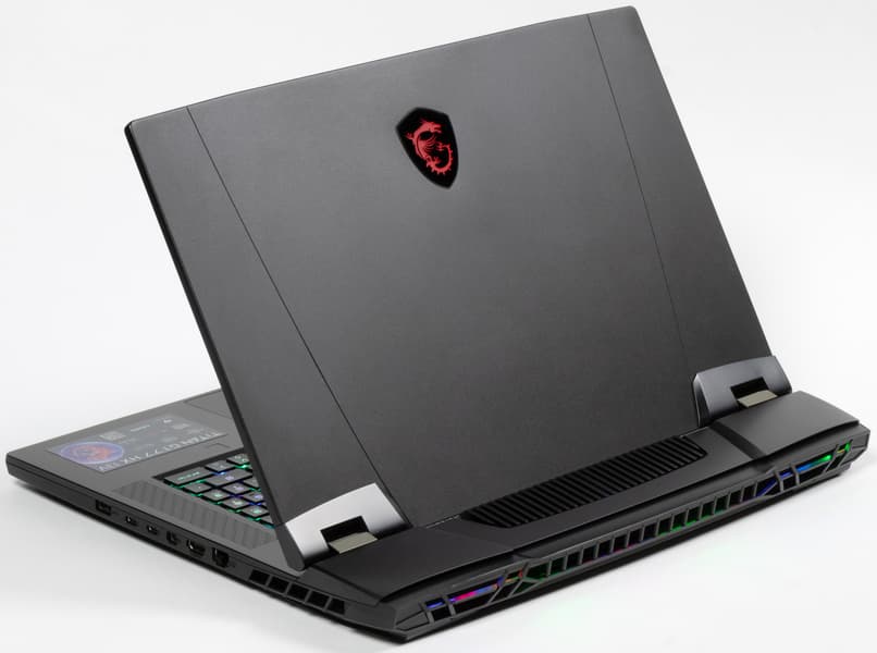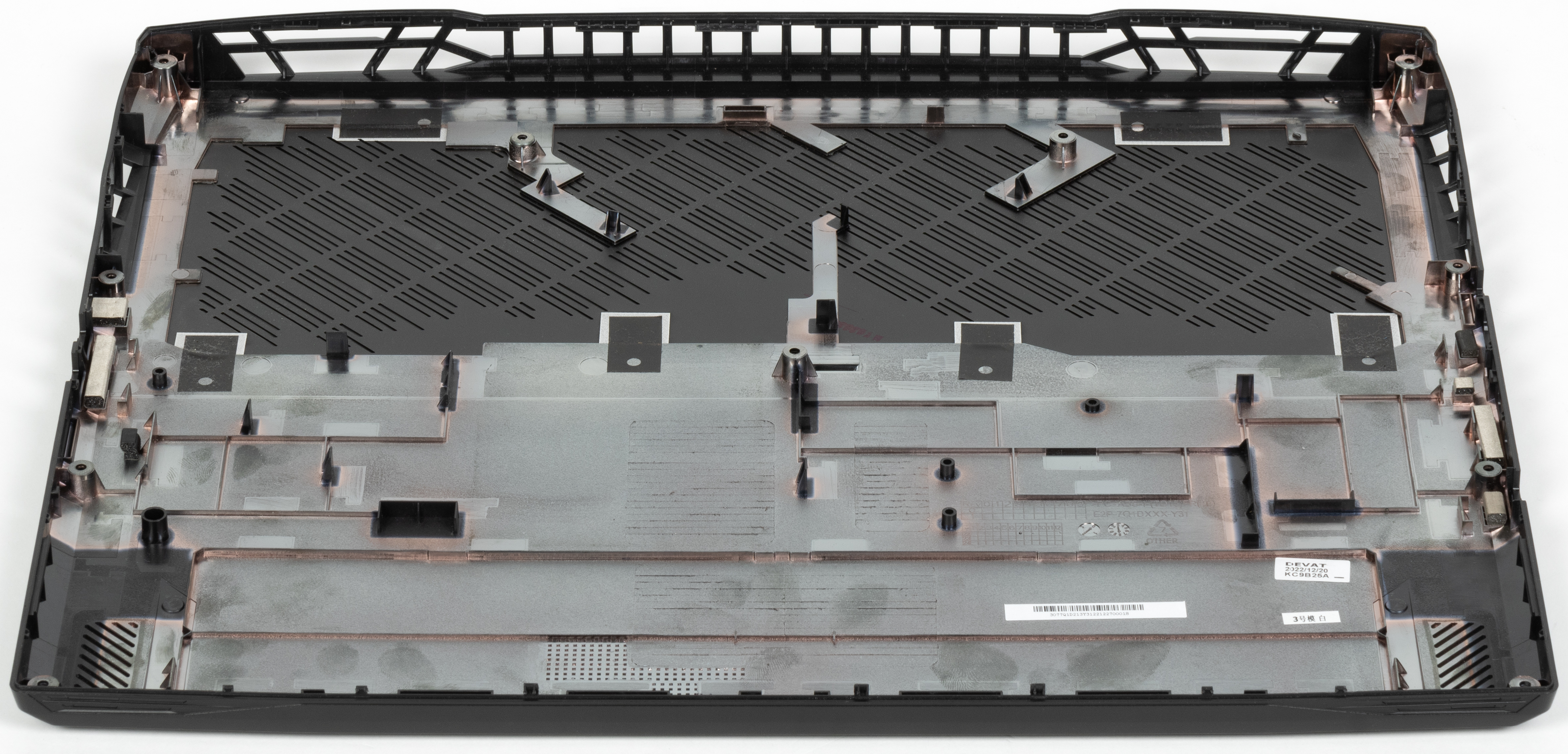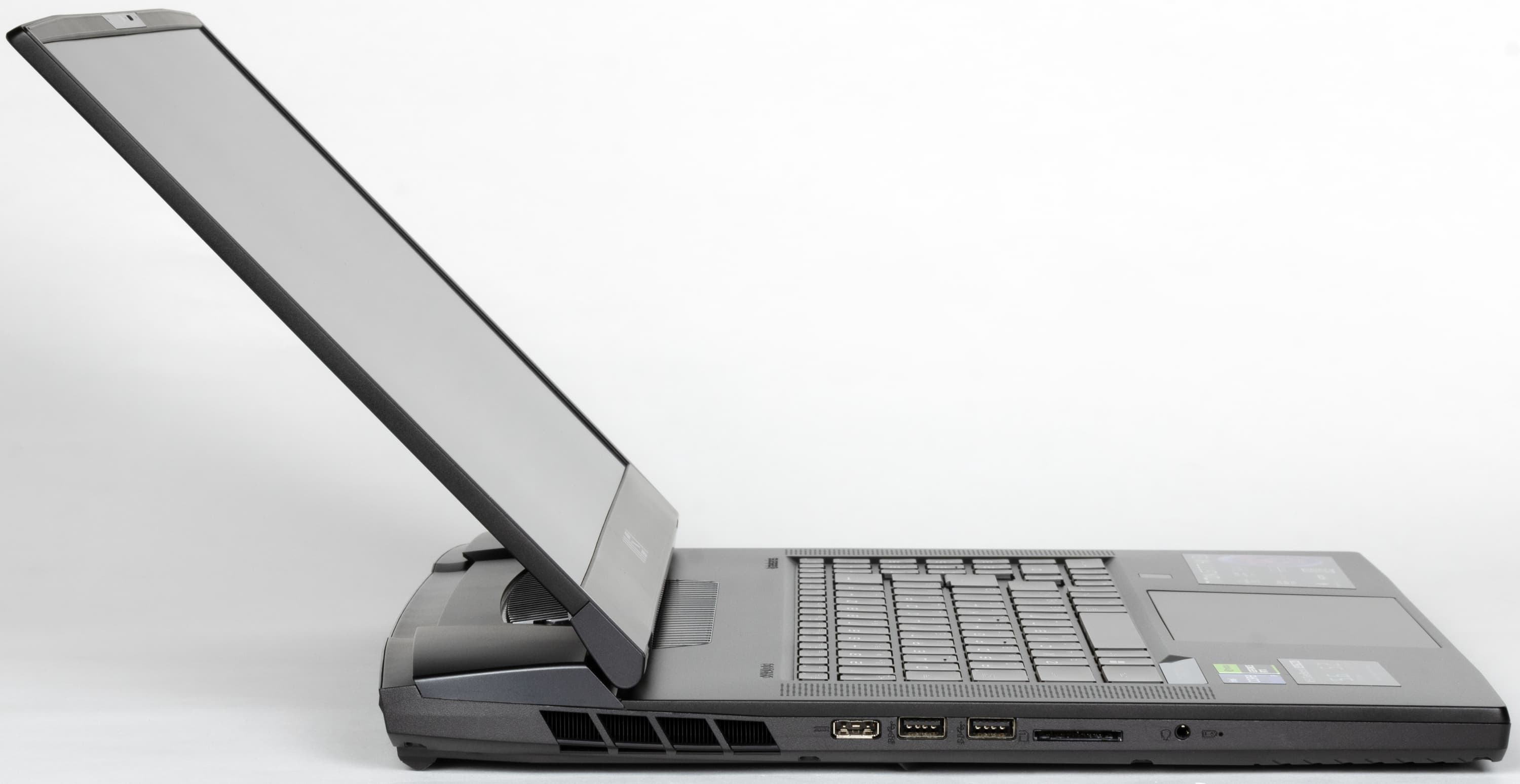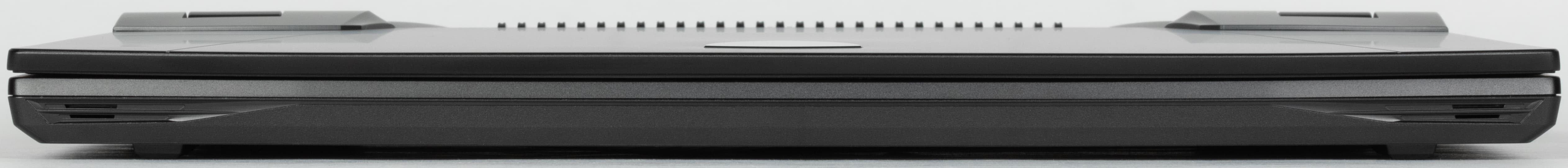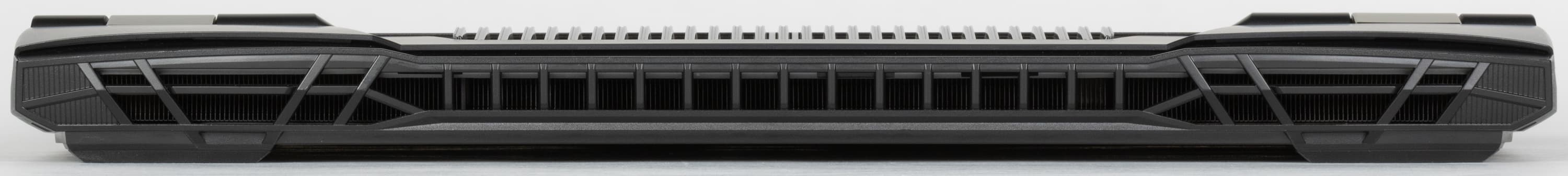 На задней панели почти во всю ширину расположена массивная решетка, через которую из внутреннего объема ноутбука наружу выбрасывается нагретый воздух. Сверху на заднем отсеке видна верхняя решетка воздухозаборников для пары дополнительных малых вентиляторов.