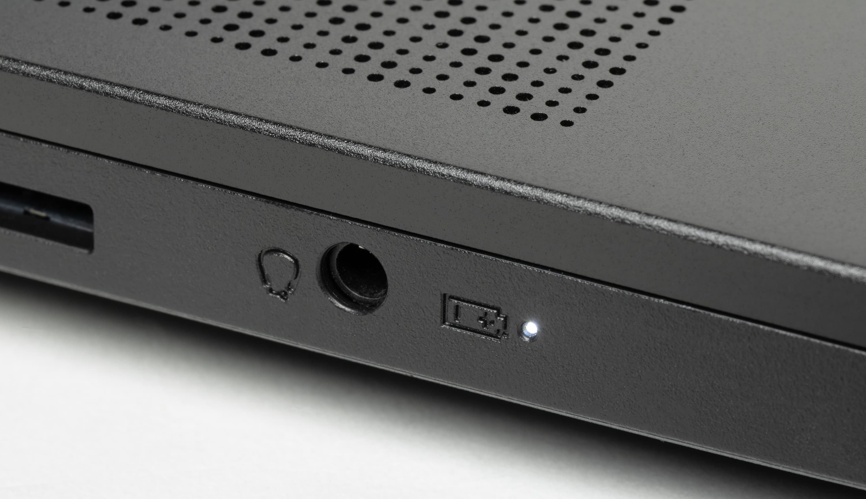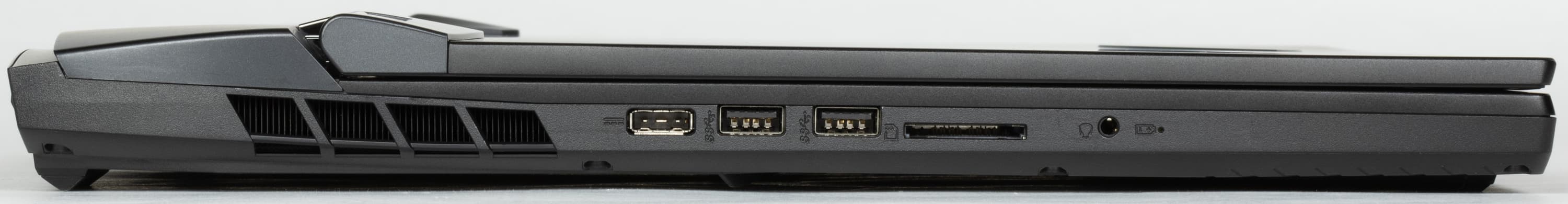 На левой боковой панели помещена еще одна решетка выходного отверстия системы охлаждения, проприетарный разъем для подключения источника питания, два порта USB 3.2 Gen2 Type-A, картовод для носителей SDXC и комбинированный разъем 3,5 мм для аудиогарнитуры.