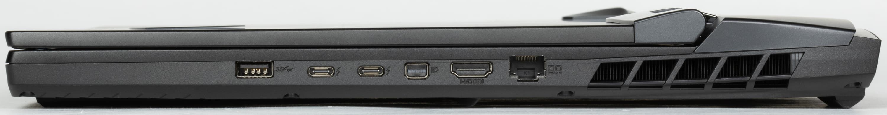 Справа имеется порт USB 3.2 Gen2 Type-A, два порта Thunderbolt 4 (Type-C), видеовыходы DisplayPort и HDMI, розетка RJ-45 и боковая решетка выходного тракта системы охлаждения.
