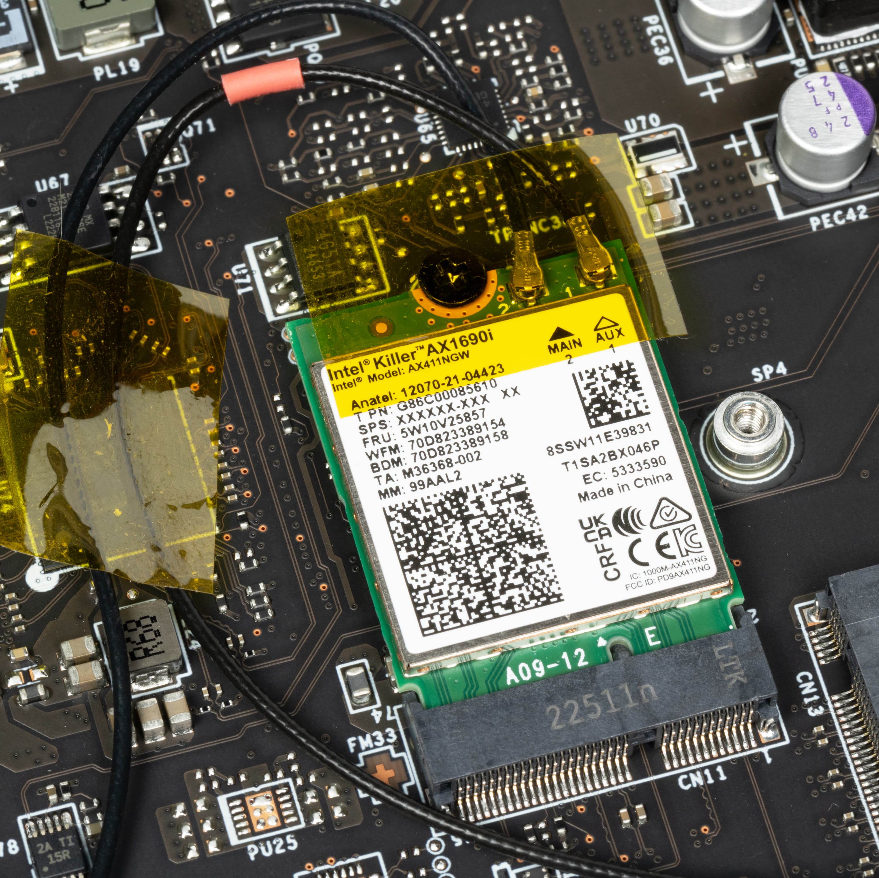 Адаптер беспроводной связи представлен трехдиапазонным (2,4/5/6 ГГц) устройством Intel AX411NGW (Garfield Peak), соответствующим классу Wi-Fi 6Е и поддерживающим стандарт IEEE 802.11ax. Это не самое новейшее решение (анонс состоялся в конце 2021 г.), но все же более современное, чем весьма популярный Intel AX211.