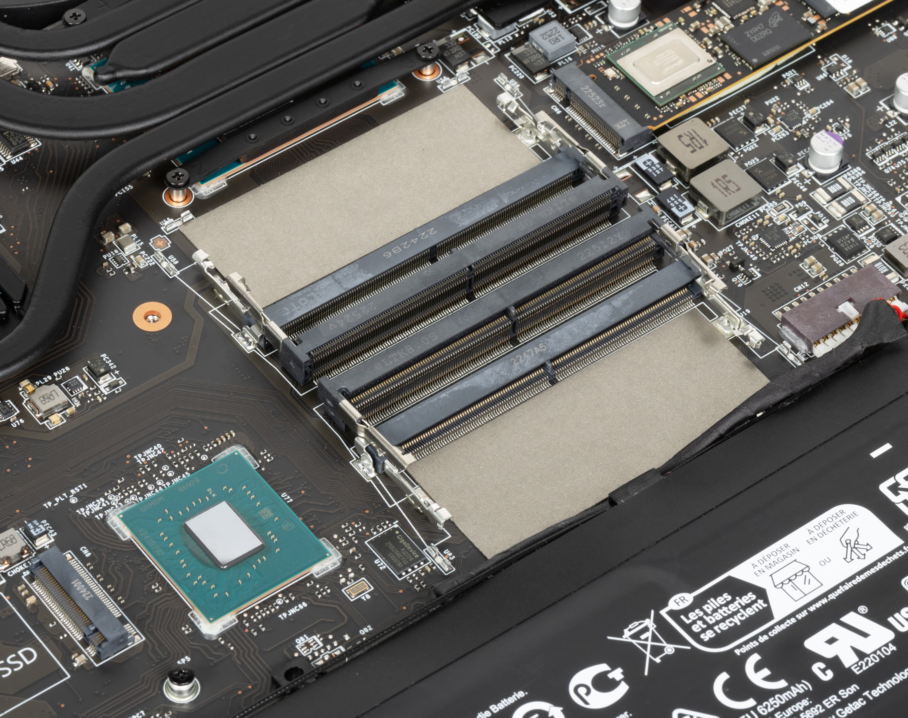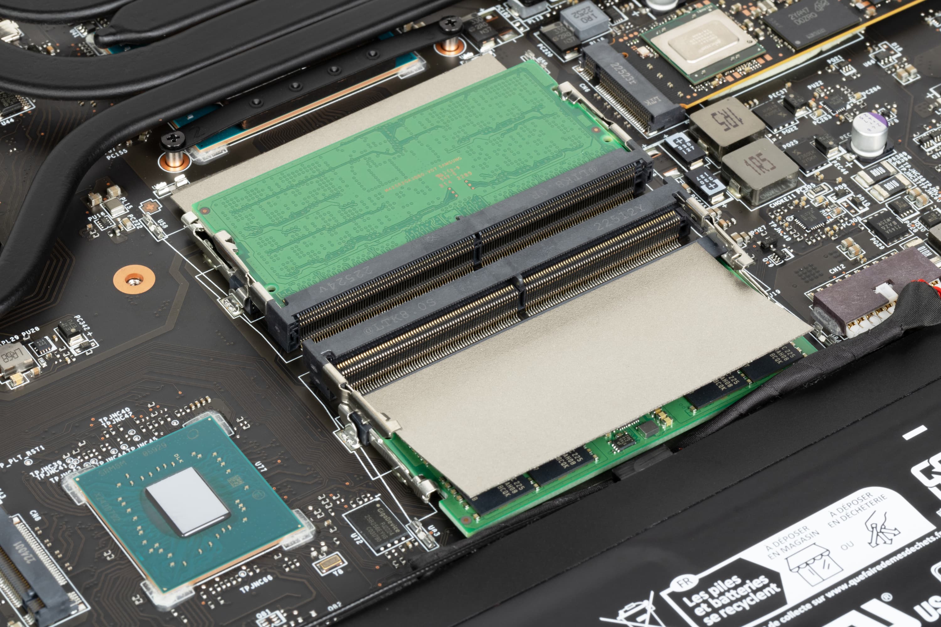 С завода ноутбук приезжает, будучи экипированным двумя модулями по 16 ГБ, которые работают в двухканальном режиме.