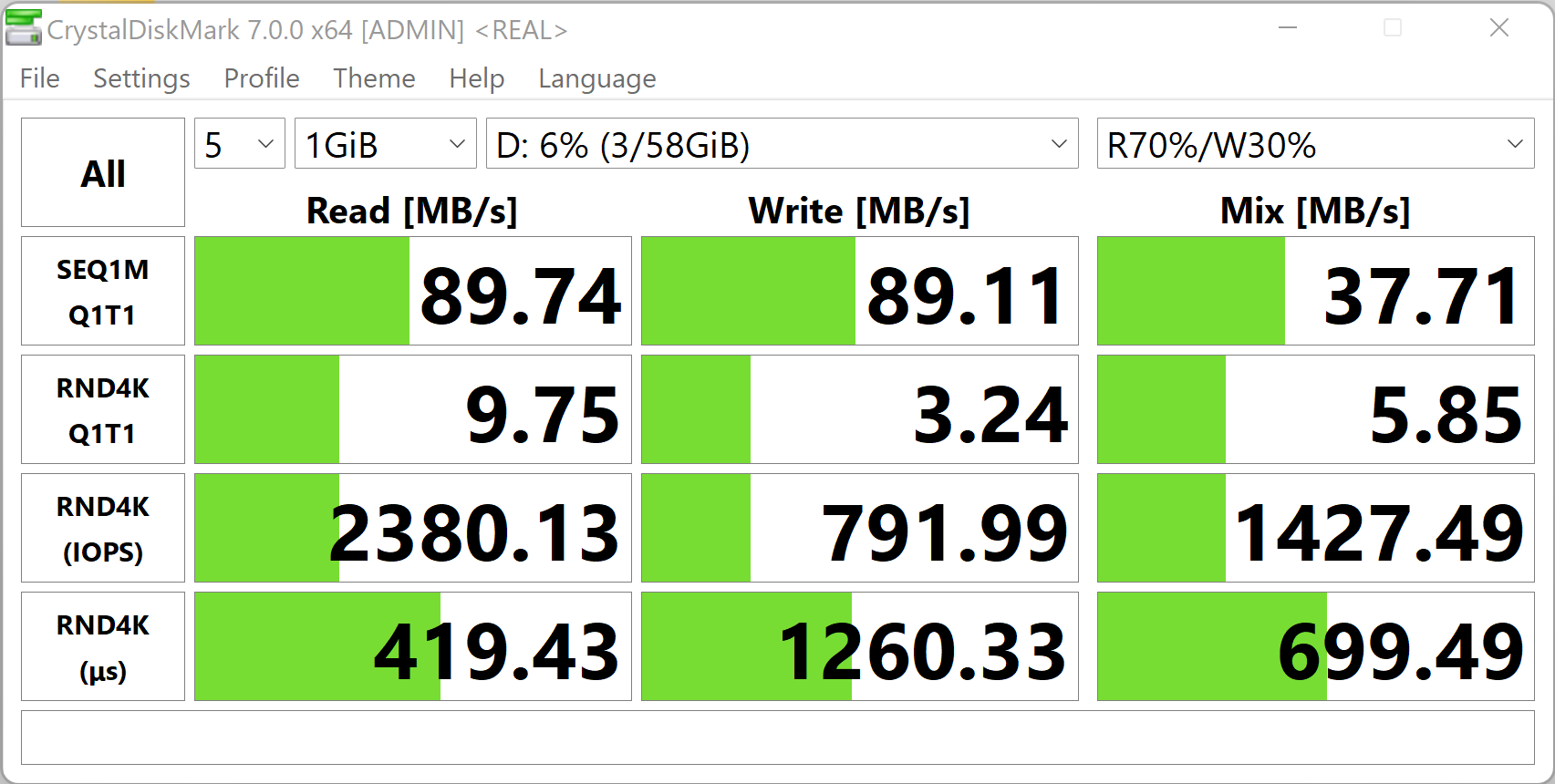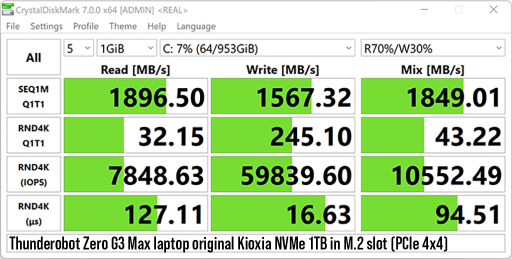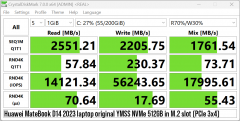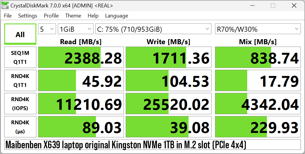 Конечно, 3000 МБ/с получить не удалось, однако и выбранный накопитель построен на памяти 3D NAND TLC, а не SLC, поэтому полученные показатели мы считаем очень хорошими. Кстати, они даже выше, чем скорости системных NVMe в слотах M.2 на системных платах в некоторых других ноутбуках, в том числе у одного из соперников нашего героя в нынешнем обзоре — Maibenben X639.