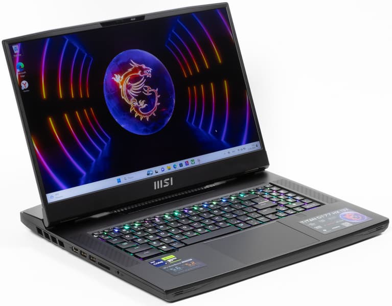 Видно, что компоненты платформы несомненно флагманские: топовые мобильный процессор Intel Core i9 13-го поколения с разблокированным множителем и видеокарта Nvidia GeForce RTX 4090 Laptop с 16 ГБ GDDR6. Возможности подключения периферии расширяют три порта USB 3.2 Gen2 и два Thunderbolt 4, которые, как заведено, обеспечивают еще и вывод видео на внешние устройства (DisplayPort 1.4). Это означает, что с учетом наличия в том же корпусе отдельных HDMI и Mini-DisplayPort к ноутбуку можно подключить одновременно четыре внешних монитора. Но главное достоинство MSI Titan GT77 HX 13VI — первый в мире ноутбучный экран с разрешением 4K и светодиодной подсветкой Mini-LED с небывало высокими контрастностью и яркостью, поддержкой широкого динамического диапазона (HDR) и почти полным охватом цветовых пространств sRGB, Adobe RGB, DCI-P3.