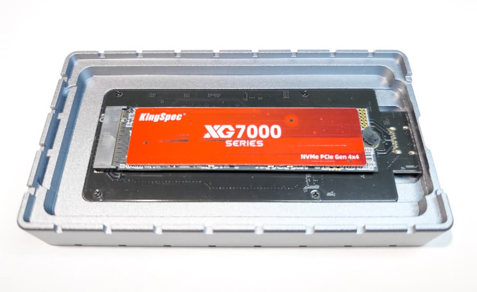 В слот М.2 этой коробки (которая, кстати, открывается и закрывается без винтов и отвертки) мы установили NVMe-накопитель KingSpec XG7000 объемом 4 ТБ (интерфейс PCIe 4 ×4). Коробку подключили к одному из портов Thunderbolt 4 ноутбука. Вот что сообщила утилита CrystalDiskMark 7: