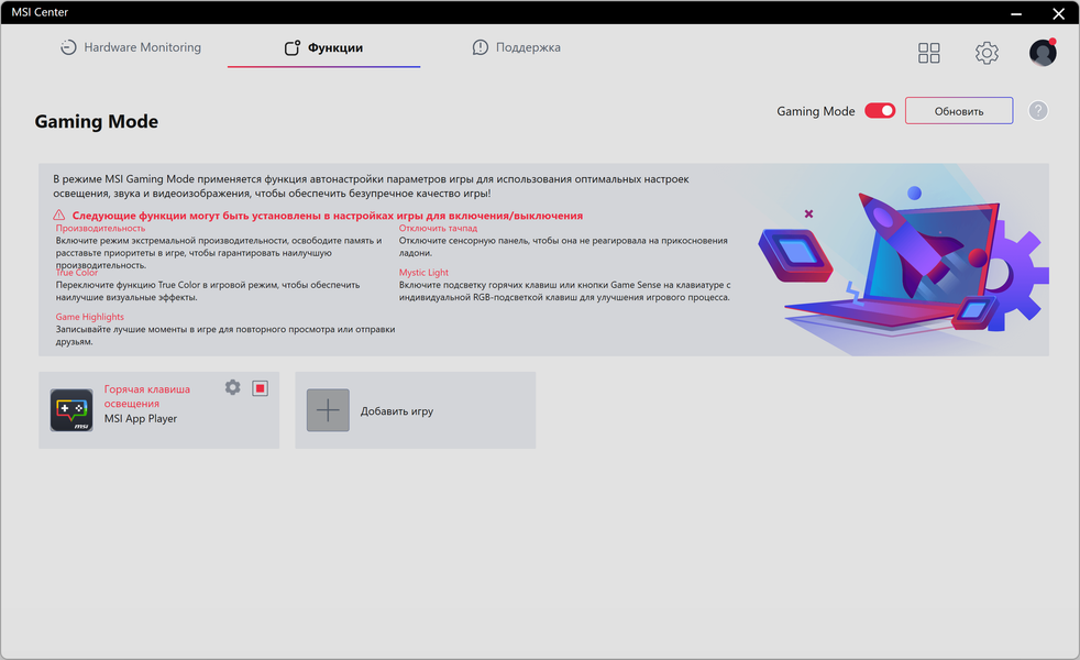 Gaming Mode (игровой режим) предназначен для оптимизации запуска различных игровых приложений.