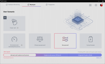 MSI Titan GT77 HX 13VI поставляется с установленной Windows 11 Home, триал-версией Microsoft Office 365, сетап-инициатором Яндекс, рядом служебных утилит (MSI True Color, Nahimic, SteelSeries) и фирменной утилитой MSI Center. Последняя переведена на русский язык лишь частично и содержит грамматические и пунктуационные ошибки. Однако именно она представляет наибольшую ценность при испытаниях машины, поскольку дает возможность настраивать разные параметры и выбирать сценарии (профили, пресеты) работы с разными уровнями производительности.