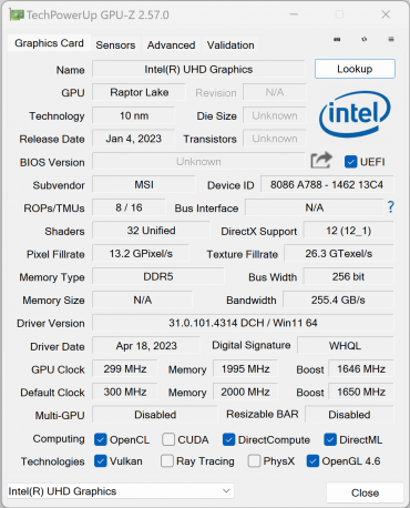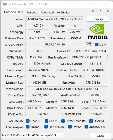 У главного вычислителя героя обзора имеется интегрированное графическое ядро Intel UHD Graphics, содержащее в себе 32 исполняемых блока. Но для игр и приложений, умеющих задействовать дискретный видеоускоритель, установлена топовая видеокарта новейшего поколения Nvidia GeForce RTX 4090 Laptop. Низкоуровневые параметры видны на скриншоте приложения GPU-Z.