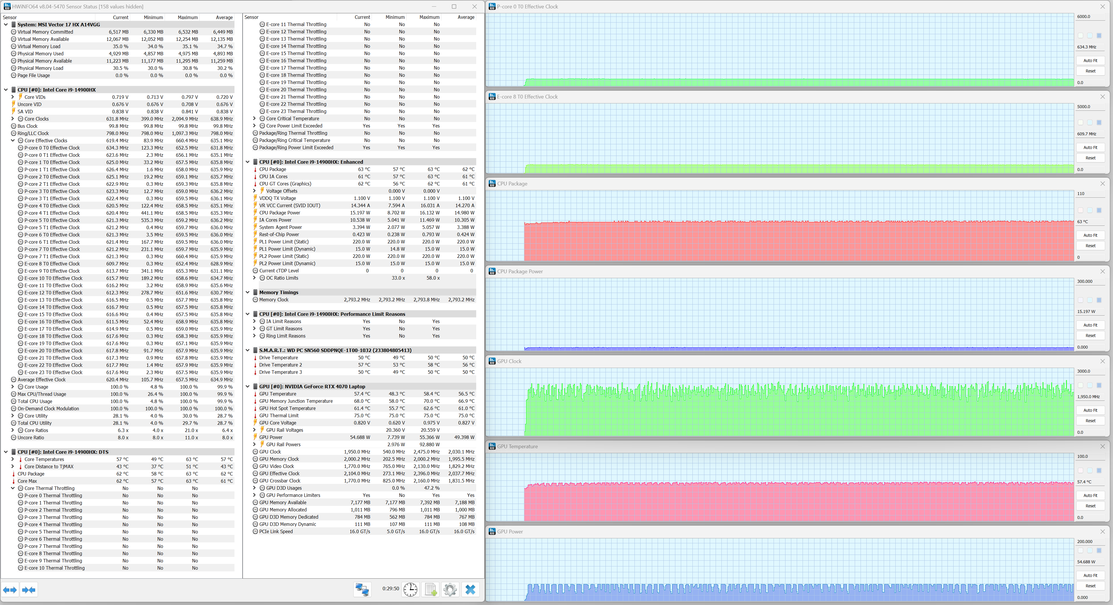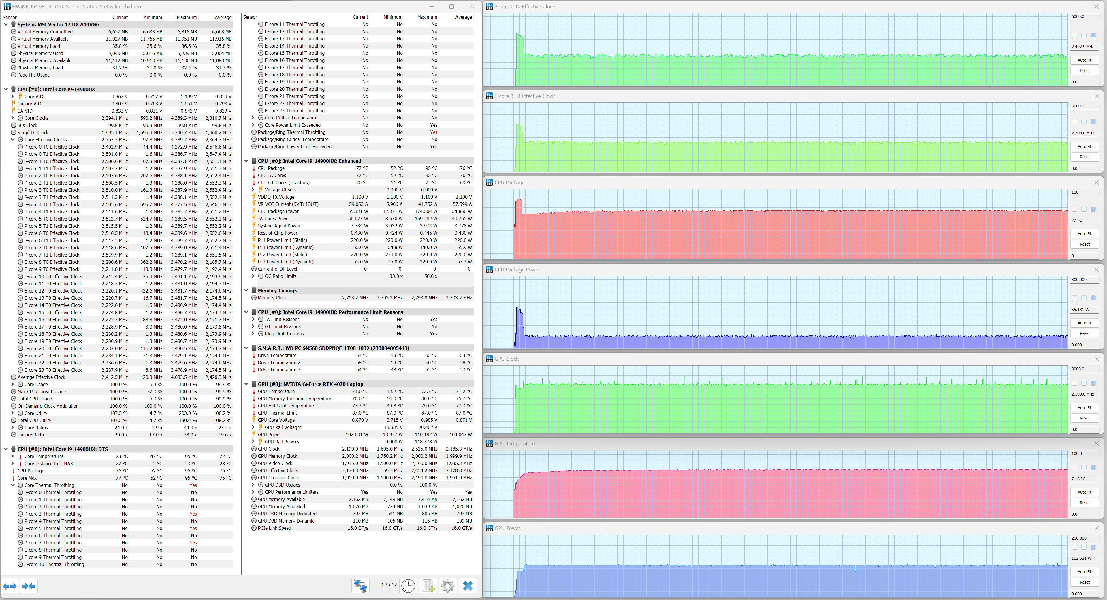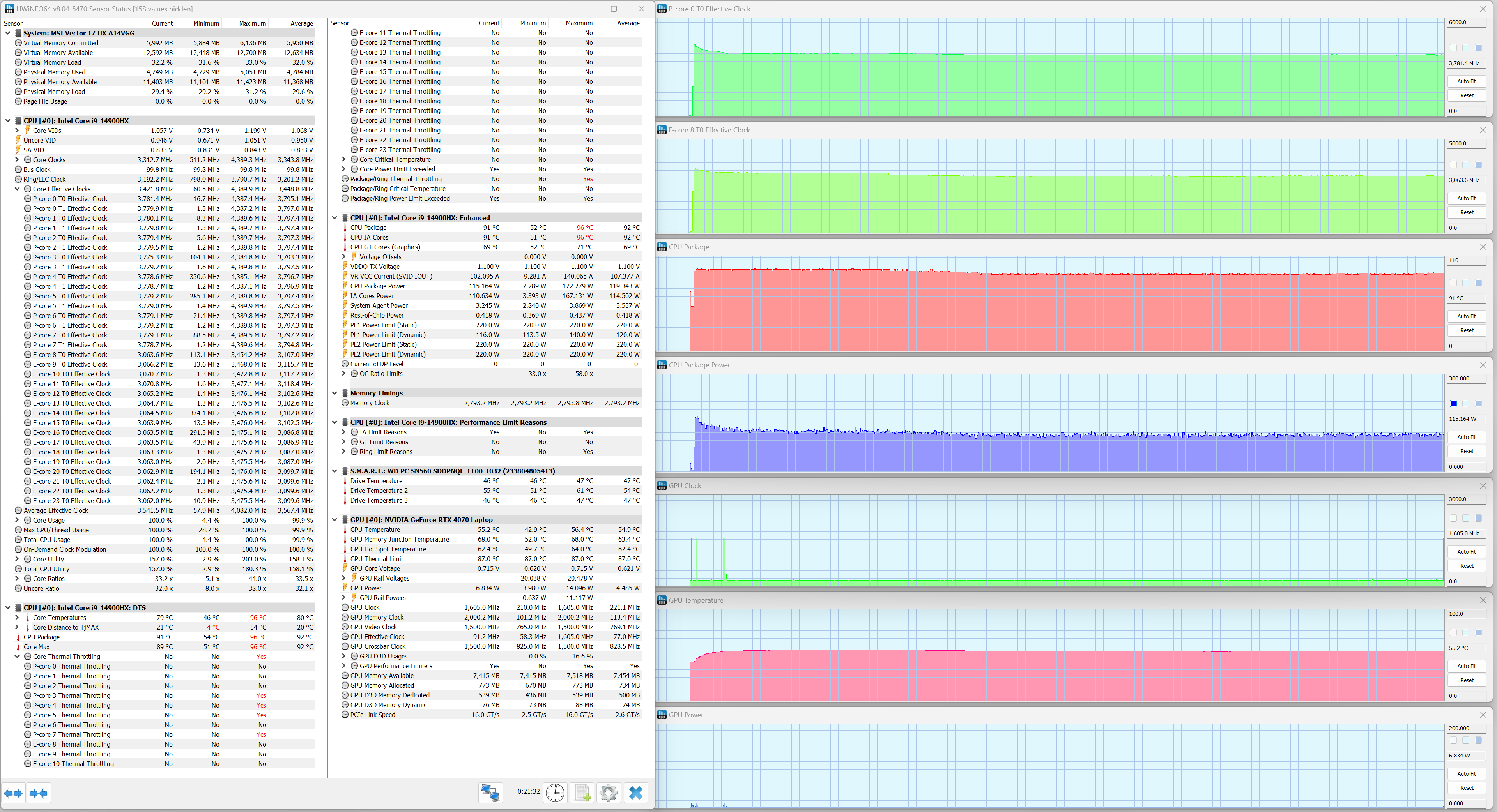 MSI Vector 17 HX A14VGG экипирован мобильным процессором Intel Core i9-14900HX (кодовое наименование Raptor Lake Refresh-HX) — это современное и одно из самых быстродействующих решений для портативных ПК. В его составе восемь двухпотоковых P-ядер (всего 16 потоков), работающих на базовой тактовой частоте 2,2 ГГц (при разгоне — до 5,8 ГГц), и шестнадцать однопотоковых E-ядер (16 потоков), работающих на базовой частоте 1,6 ГГц с возможностью разгона до 4,1 ГГц. TDP составляет 45—55 Вт (определяется производителем конечного устройства) и 157 Вт в турборежиме. Максимальная рабочая температура (Tjmax) — 100 °C. Низкоуровневые параметры центрального процессора представлены ниже на скриншоте утилиты HWInfo.