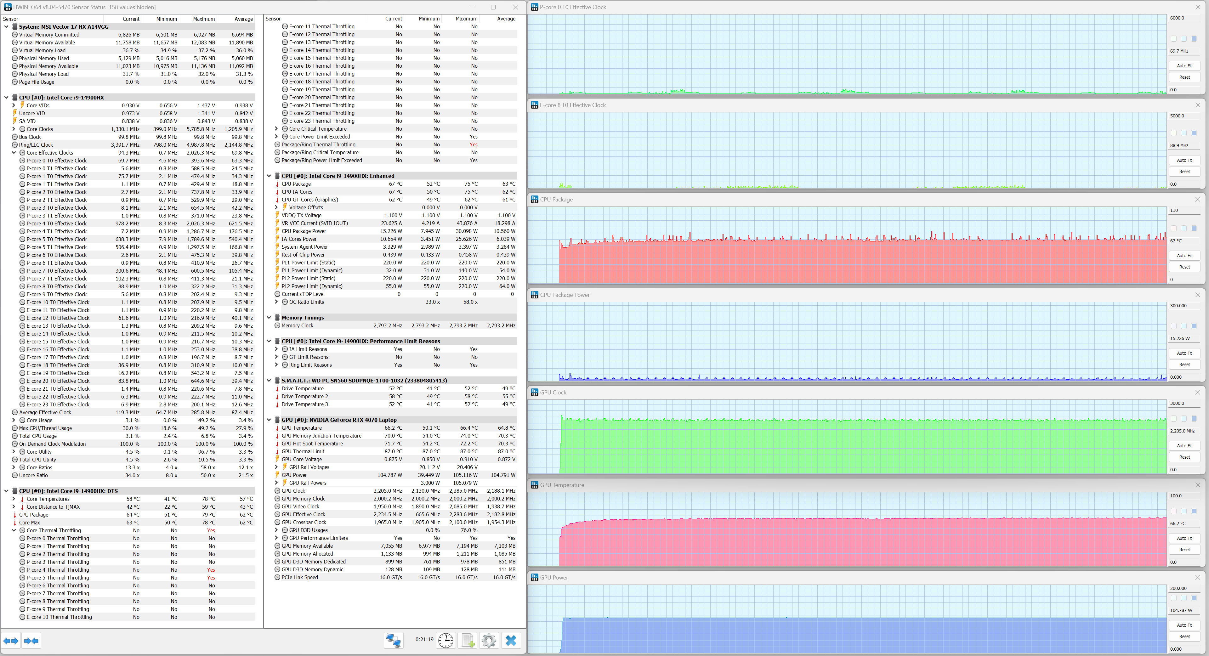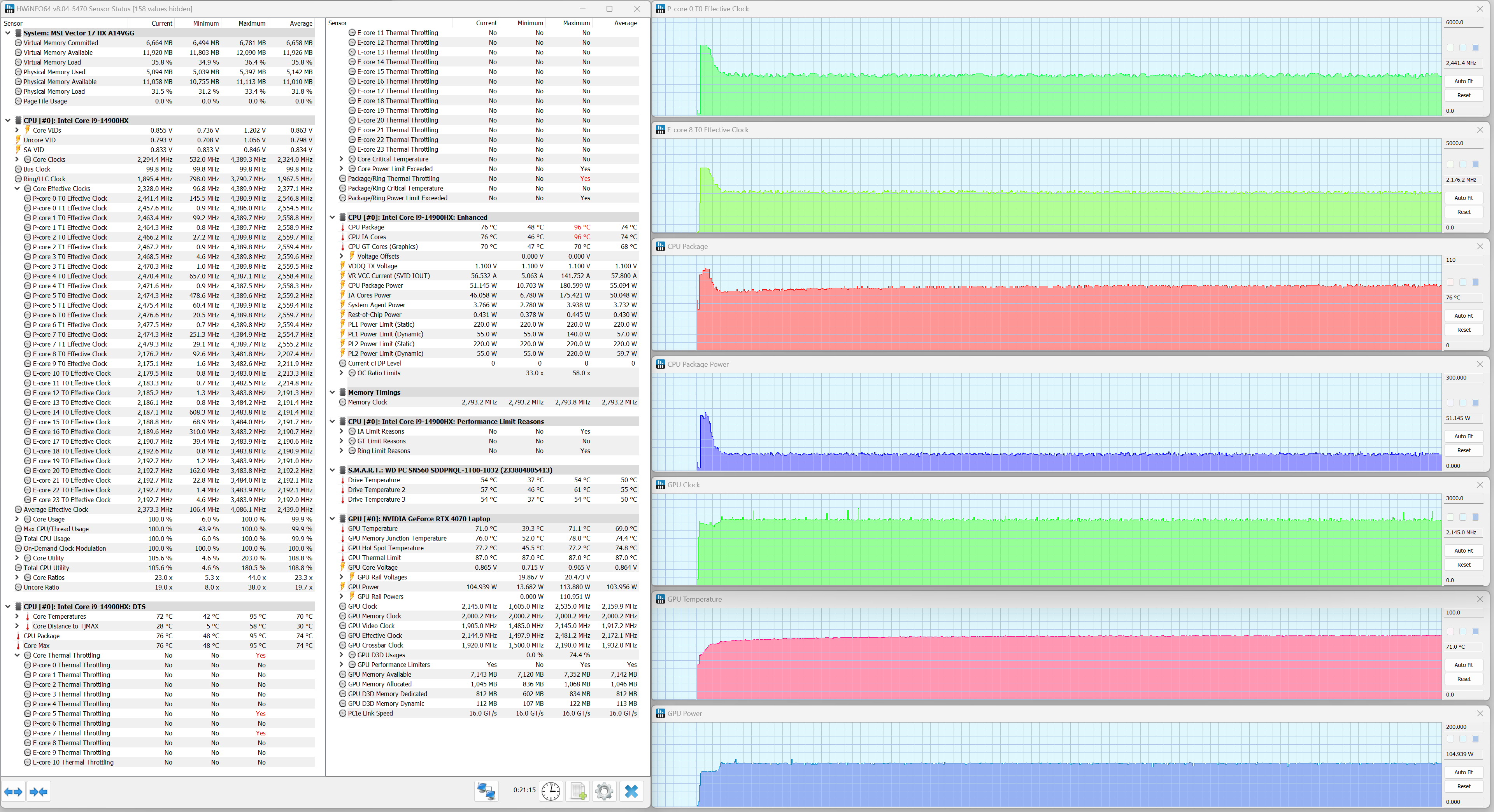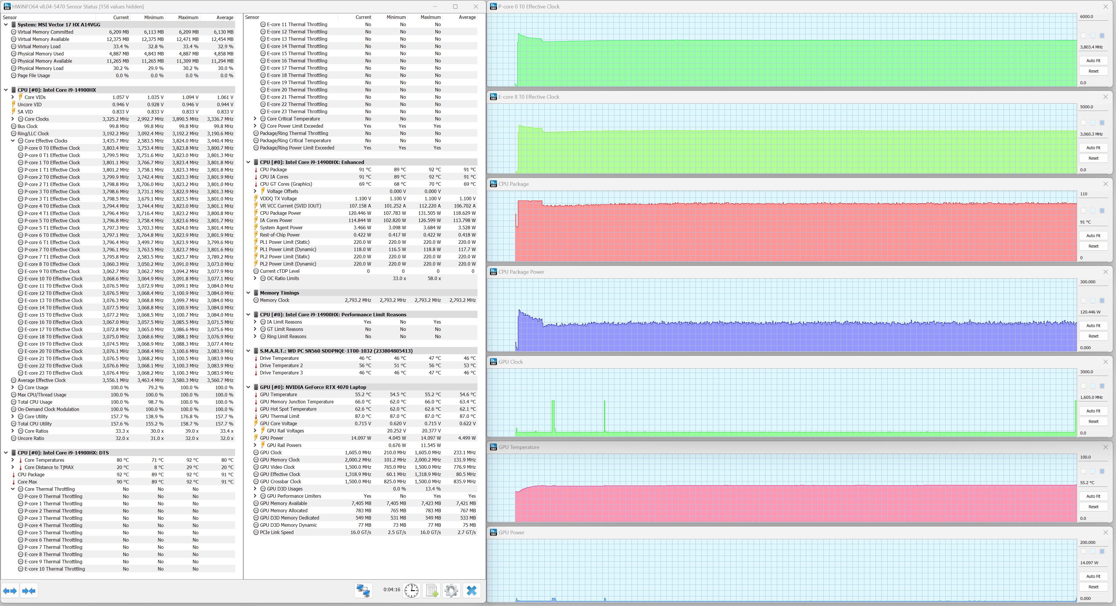 MSI Vector 17 HX A14VGG экипирован мобильным процессором Intel Core i9-14900HX (кодовое наименование Raptor Lake Refresh-HX) — это современное и одно из самых быстродействующих решений для портативных ПК. В его составе восемь двухпотоковых P-ядер (всего 16 потоков), работающих на базовой тактовой частоте 2,2 ГГц (при разгоне — до 5,8 ГГц), и шестнадцать однопотоковых E-ядер (16 потоков), работающих на базовой частоте 1,6 ГГц с возможностью разгона до 4,1 ГГц. TDP составляет 45—55 Вт (определяется производителем конечного устройства) и 157 Вт в турборежиме. Максимальная рабочая температура (Tjmax) — 100 °C. Низкоуровневые параметры центрального процессора представлены ниже на скриншоте утилиты HWInfo.