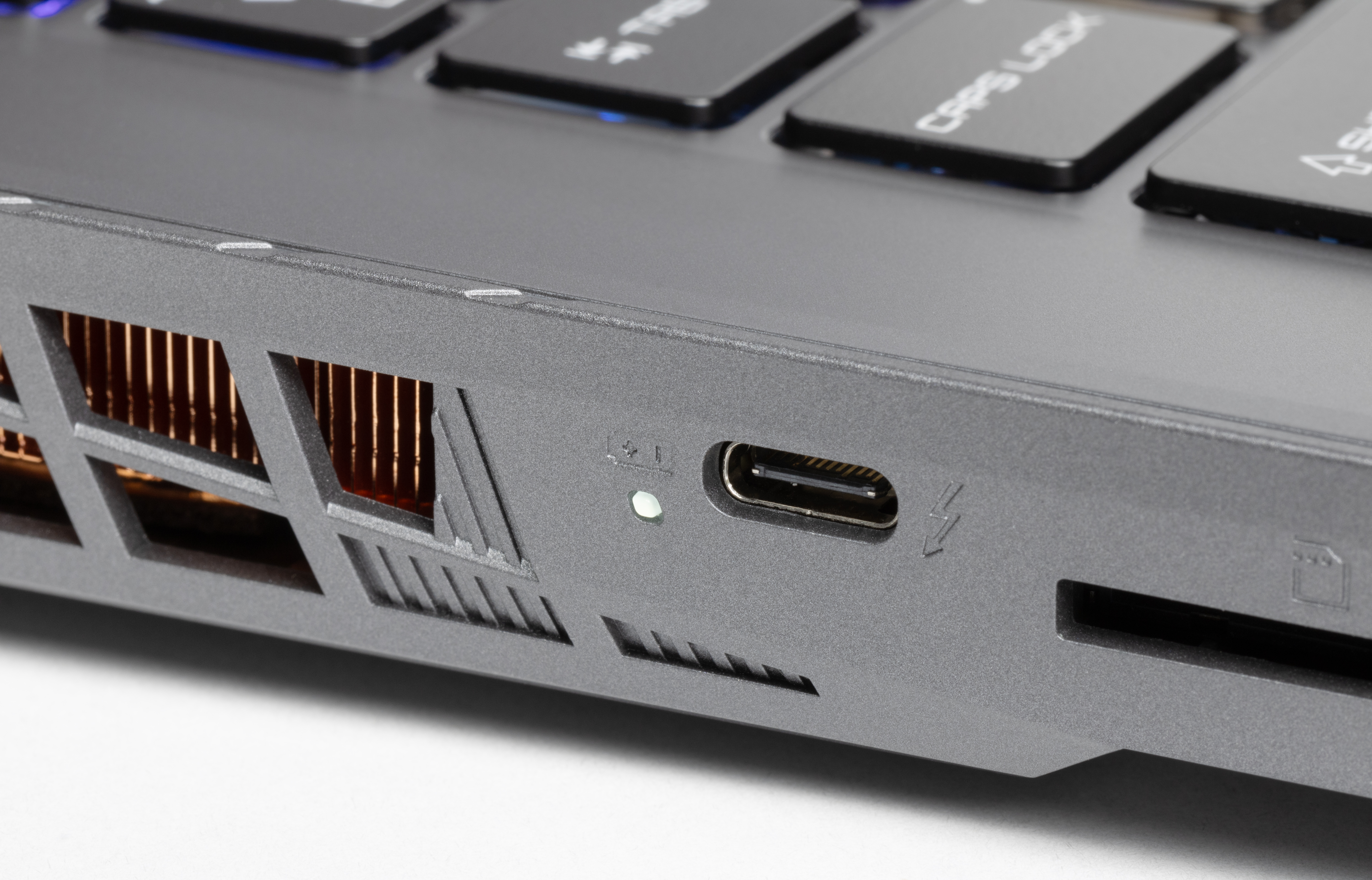 Справа расположены два порта USB 3.2 Gen1 Type-A и один USB 3.2 Gen2 Type-C (с поддержкой PowerDelivery и DisplayPort), а также боковая решетка выходного тракта системы охлаждения.