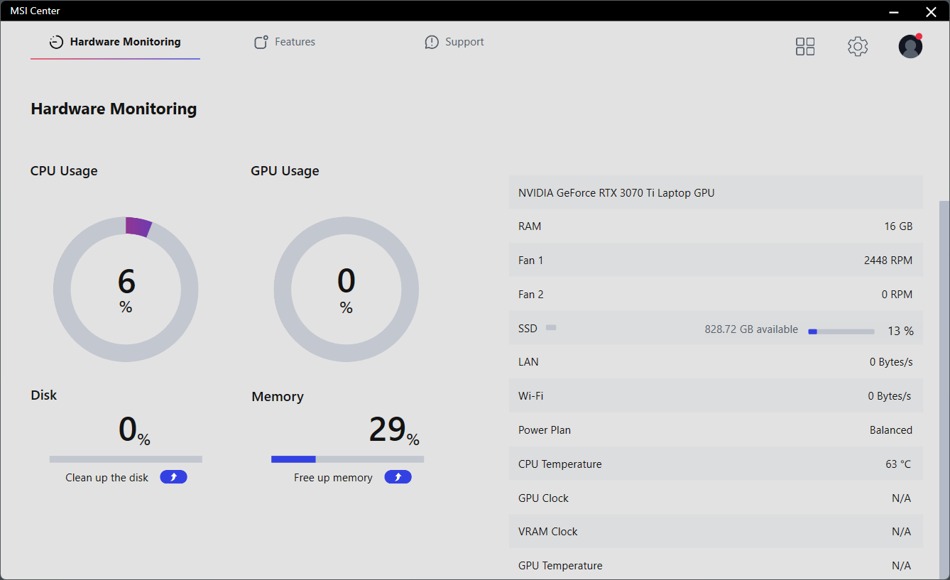 Первая вкладка — Hardware Monitoring — дает возможность отслеживать заполнение системного накопителя и оперативной памяти, рабочую температуру и загрузку CPU и GPU, а также текущие обороты вентиляторов плюс некоторые другие параметры.