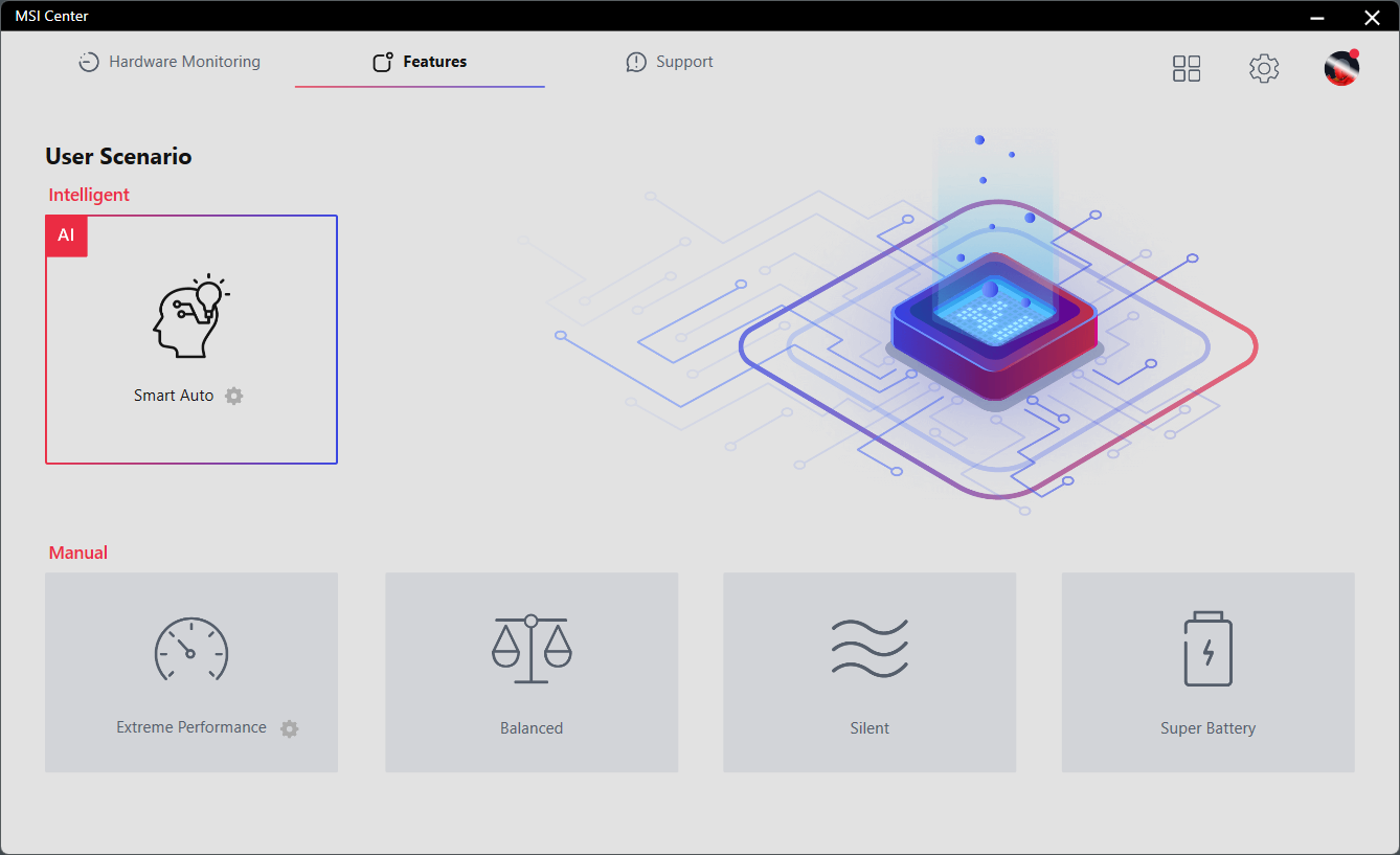 MSI Center — наиболее важный и практически полезный программный пакет. Он загружается в память резидентно при старте Windows и обнаруживается в системном «выдвижном ящике» панели задач. В окне приложения имеются три вкладки слева и три пиктограммы справа.