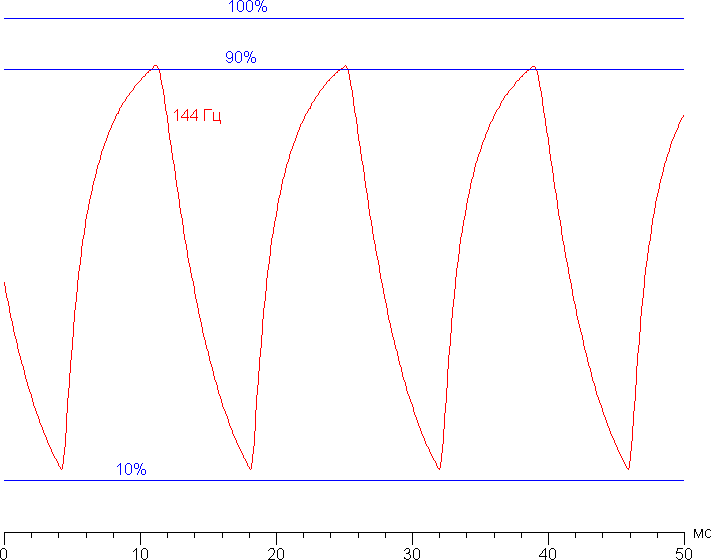 На любом уровне яркости значимая модуляция подсветки отсутствует, поэтому нет и никакого мерцания экрана. В доказательство приведем графики зависимости яркости (вертикальная ось) от времени (горизонтальная ось) при различных значениях настройки яркости: