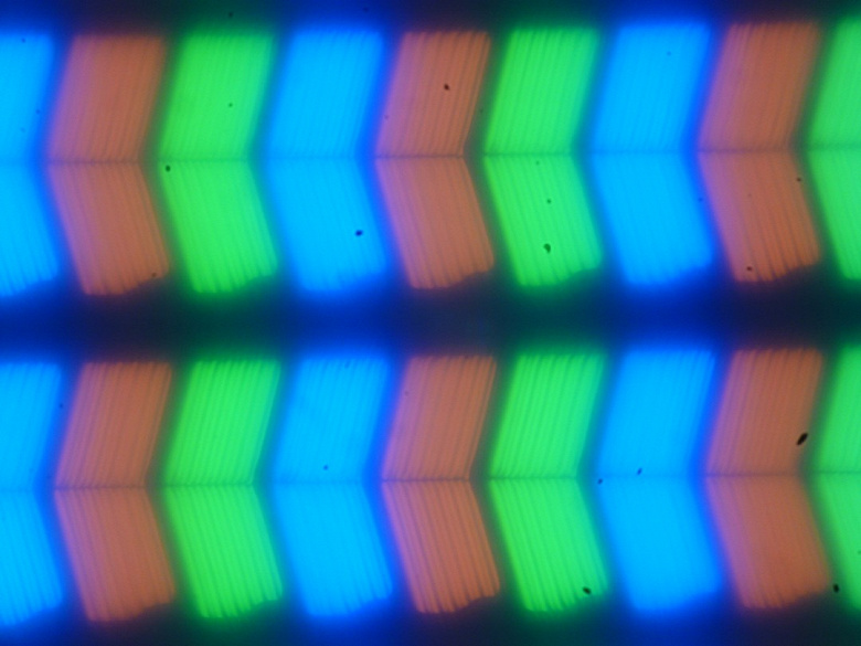 В этом ноутбуке используется матрица типа IPS. Микрофотографии демонстрируют типичную для IPS структуру субпикселей (черные точки — это пыль на матрице фотоаппарата):
