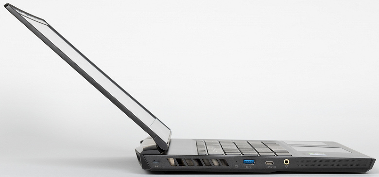 На левой боковой панели помещена решетка выходного отверстия системы охлаждения, слева от нее — отверстие кенсингтонского замка, справа — индикатор зарядки батареи, порты USB3 Type A и USB3 Type С (с поддержкой вывода видео) и стандартный миниджек 3,5 мм для подключения аудиогарнитуры.