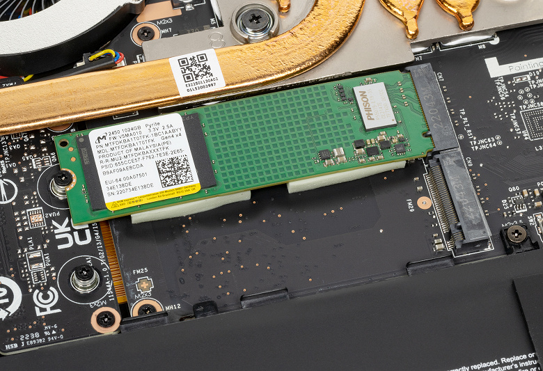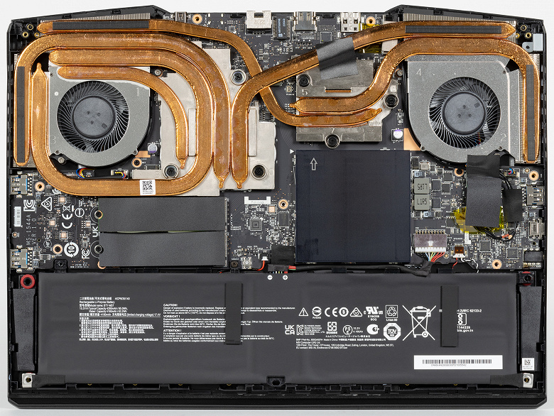 Сняв нижнюю крышку, получаем доступ к системе охлаждения, модулям оперативной памяти, твердотельным накопителям и аккумулятору. Единственное «но»: один из винтов заклеен заводским стикером, и нарушение его целостности может осложнить выполнение производителем гарантийных обязательств. Если забыть об этом, то можно увеличить доступный объем оперативной памяти (скажем, установить 32 ГБ в двух модулях по 16 ГБ), заменить твердотельный накопитель в первом слоте M.2 или добавить еще один во второй слот. Чуть больше времени потребует замена батареи. Последняя, разумеется, крепится к корпусу винтами, но обладает собственным разъемом, поэтому извлекается и устанавливается без особых хлопот.