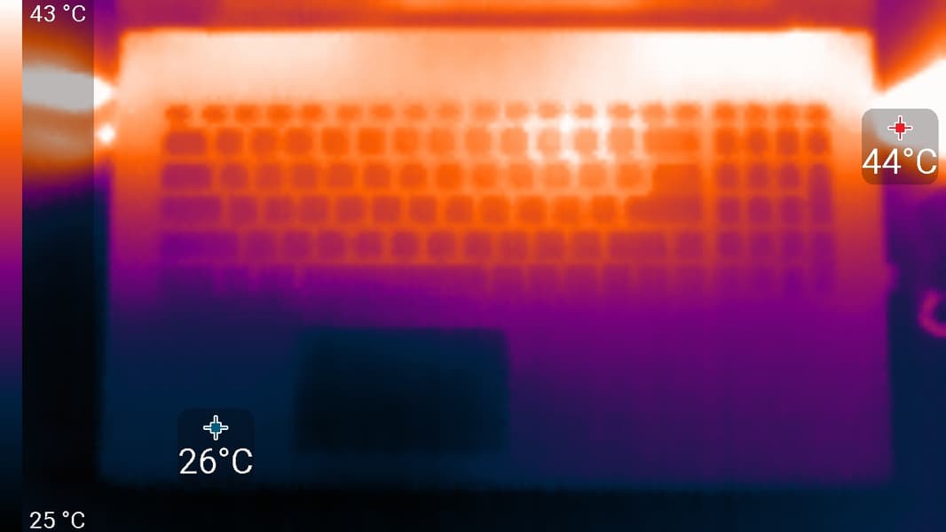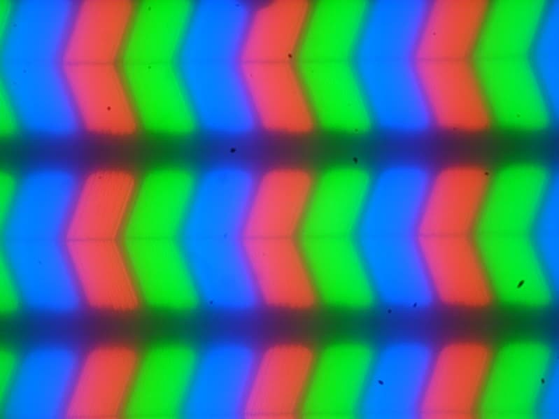 Внешняя поверхность матрицы черная жесткая и полуматовая (зеркальность очень хорошо выражена). Какие-либо специальные антибликовые покрытия или фильтр отсутствуют, нет и воздушного промежутка. При питании от сети или от батареи и при ручном управлении яркостью (автоматической подстройки по датчику освещенности нет) ее максимальное значение составило 300 кд/м² (в центре экрана на белом фоне). Максимальная яркость довольно высокая, поэтому за ноутбуком как-то можно будет работать/играть на улице ясным днем, если расположиться в тени.