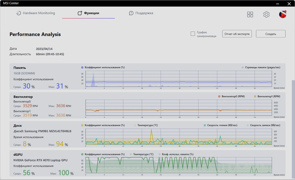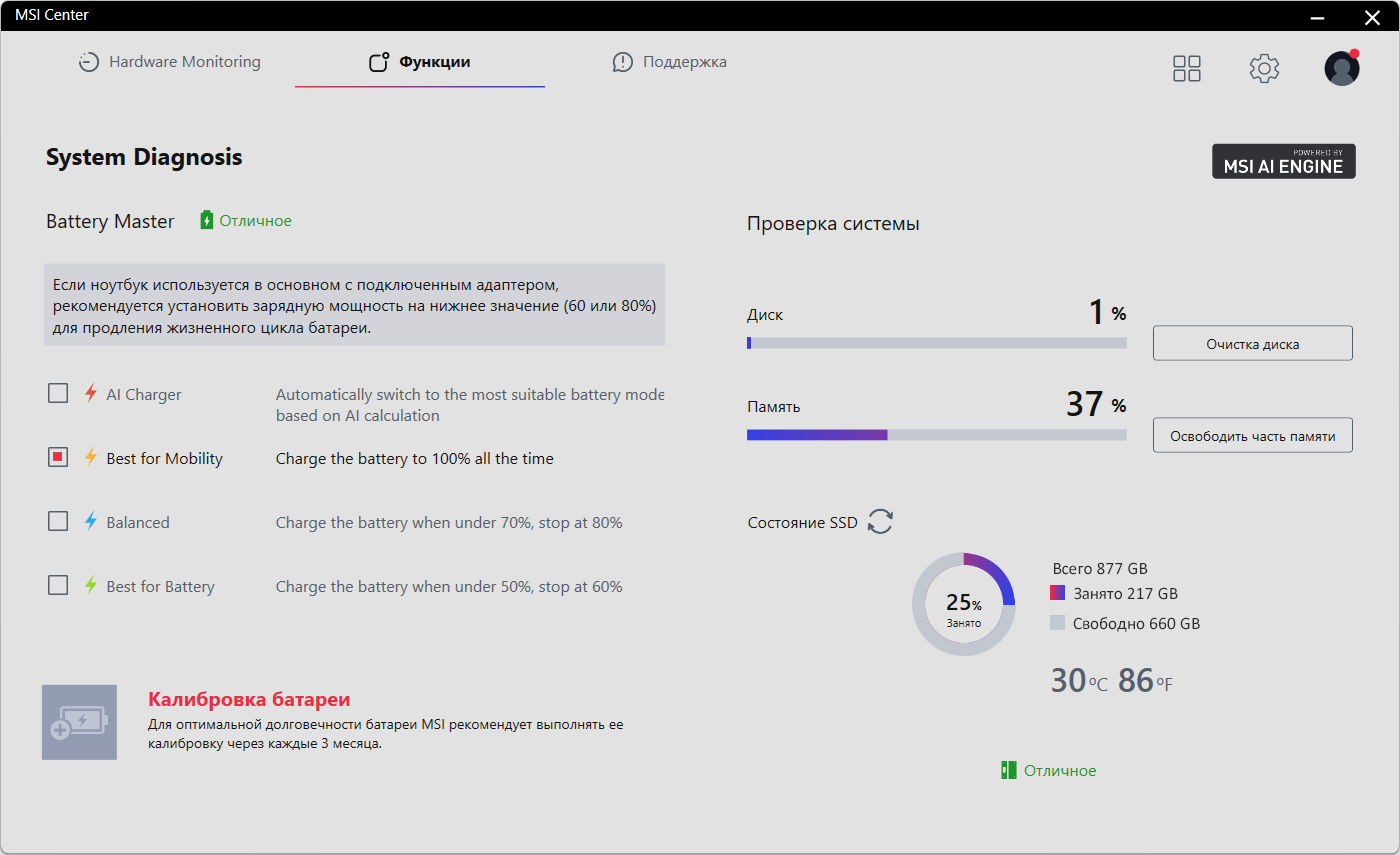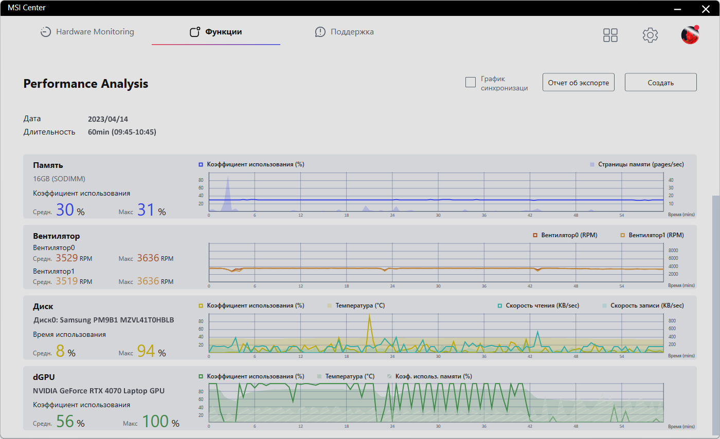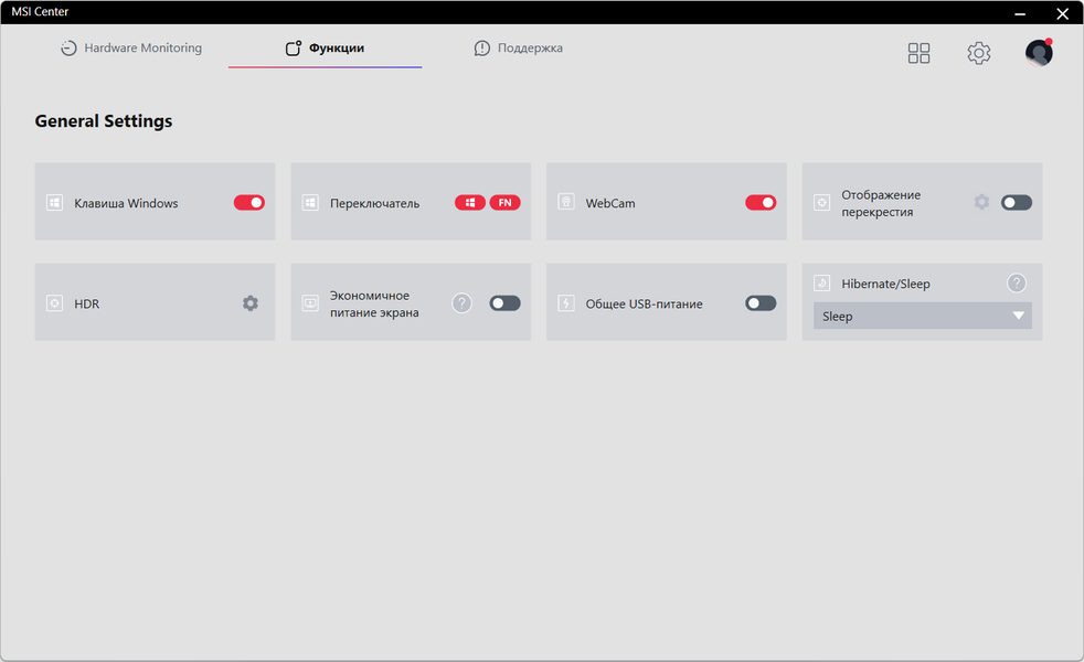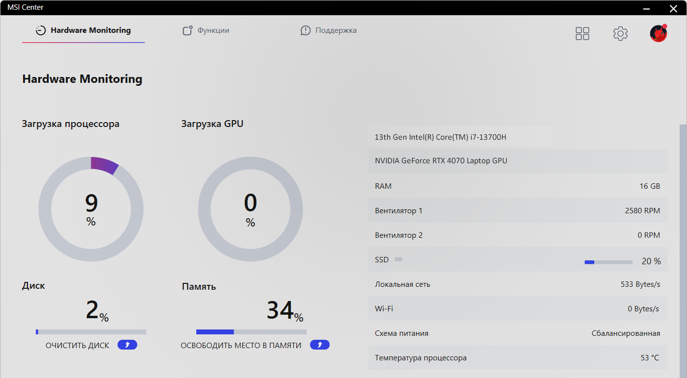 Hardware Monitoring позволяет получить сведения о загрузке CPU и GPU, скорости работы обоих вентиляторов, свободном месте на системном накопителе, состоянии кабельной и беспроводной сети, текущей схеме управления питанием (параметр Windows), температуре центрального процессора и частоте видеопамяти дискретной графики.