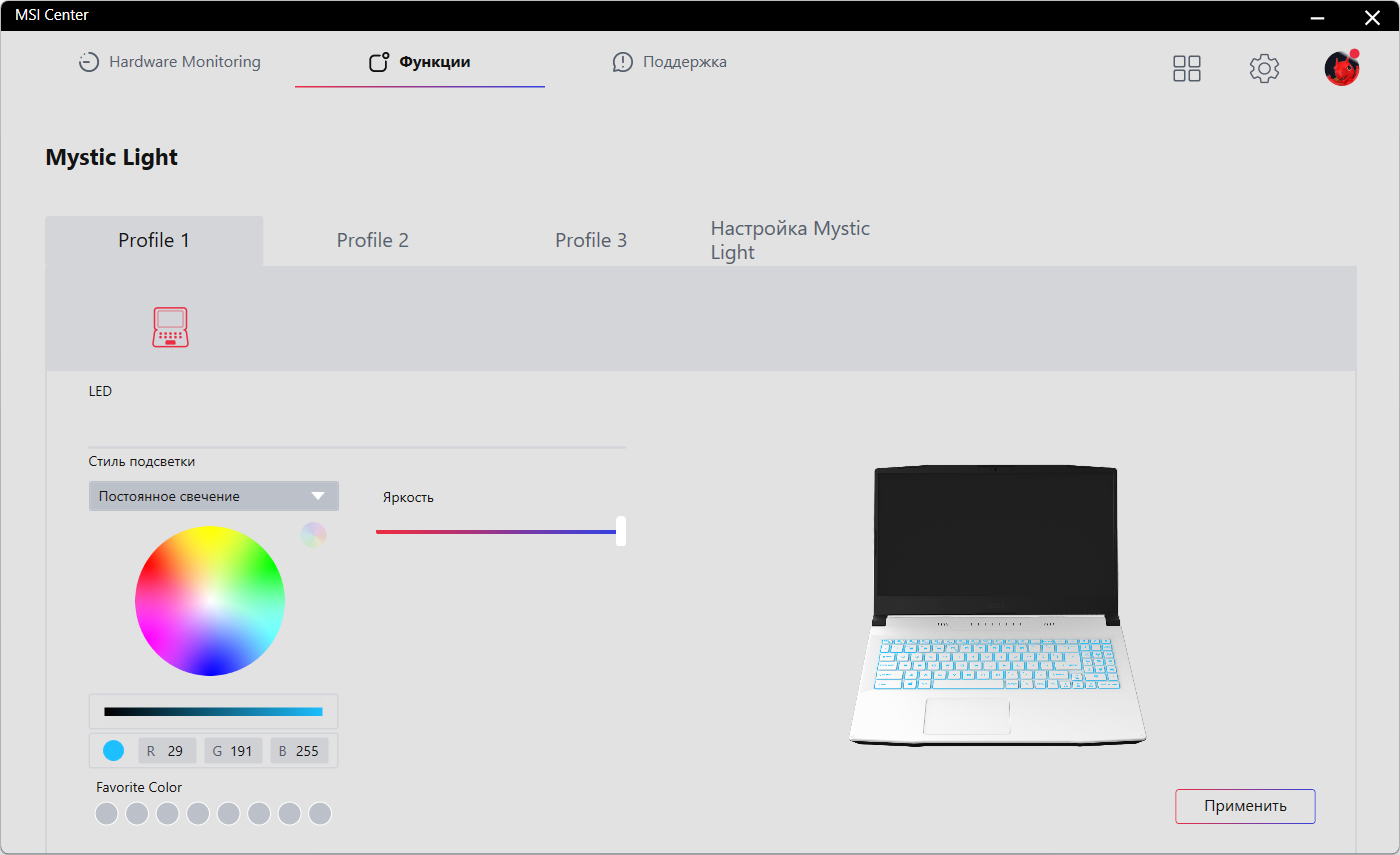 Раздел Mystic Light («таинственный свет») дает возможность управлять подсветкой клавиатуры.