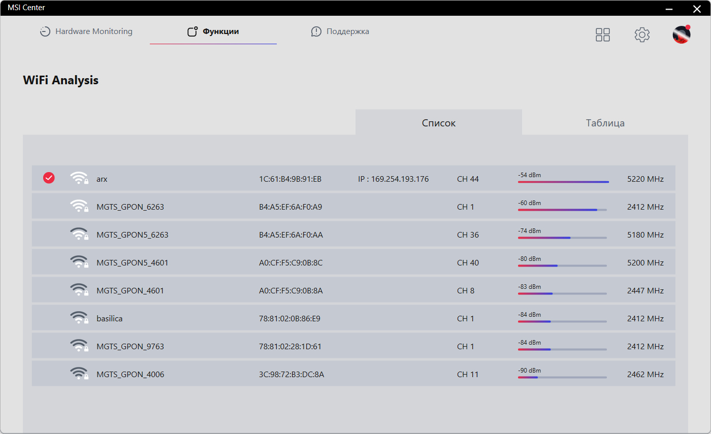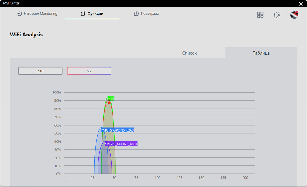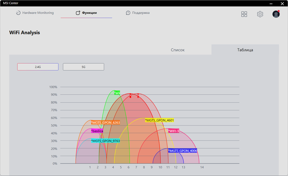 Wi-Fi Analysis («анализ Wi-Fi») позволяет получить список доступных хот-спотов и оценить степень загруженности диапазонов беспроводной связи.