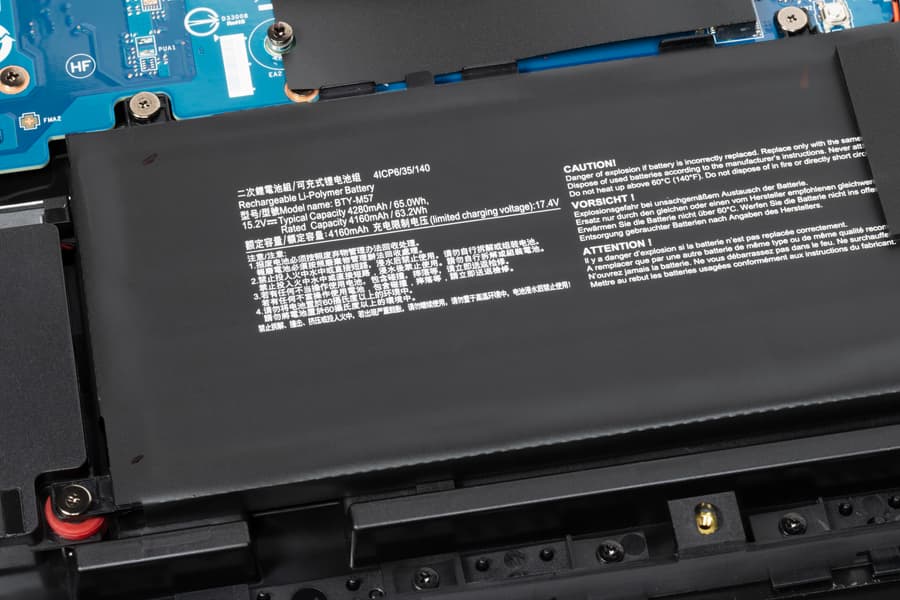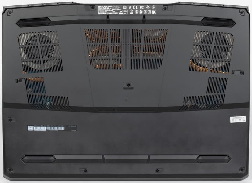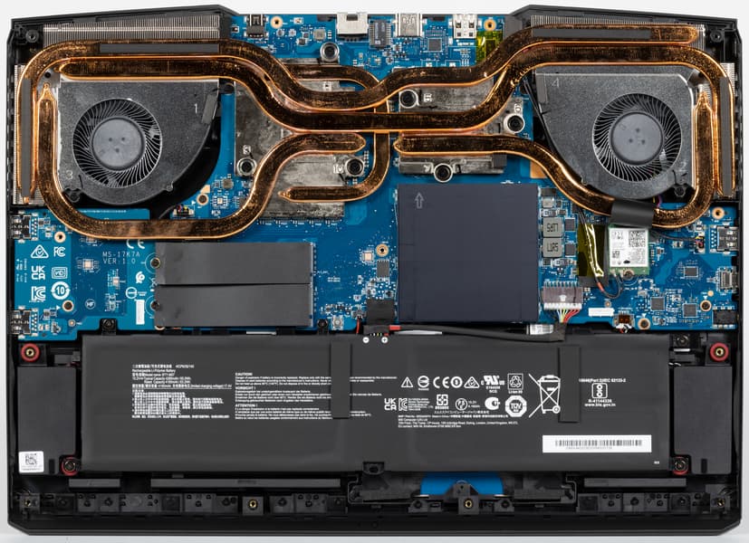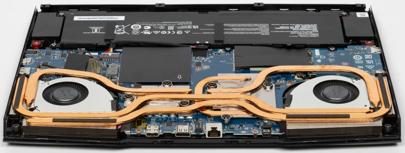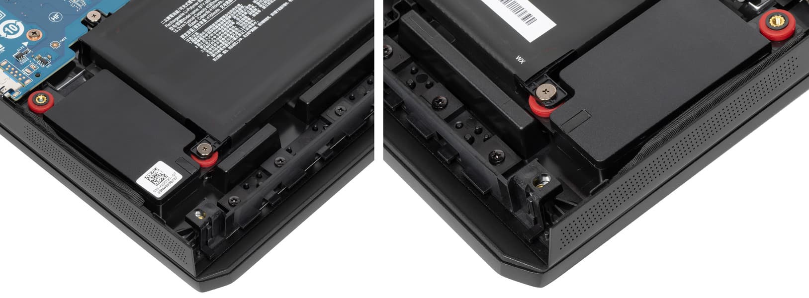 Сняв нижнюю крышку, получаем доступ к системе охлаждения, модулям оперативной памяти, твердотельным накопителям и аккумулятору. Единственное «но»: один из винтов заклеен заводским стикером, и нарушение его целостности может осложнить выполнение производителем гарантийных обязательств. Если забыть об этом, то можно увеличить доступный объем оперативной памяти (скажем, установить 32 ГБ в двух модулях по 16 ГБ), заменить твердотельный накопитель в первом слоте M.2 или добавить еще один во второй слот. Чуть больше времени потребует замена батареи. Последняя, разумеется, крепится к корпусу винтами, но обладает собственным разъемом, поэтому извлекается и устанавливается без особых хлопот.