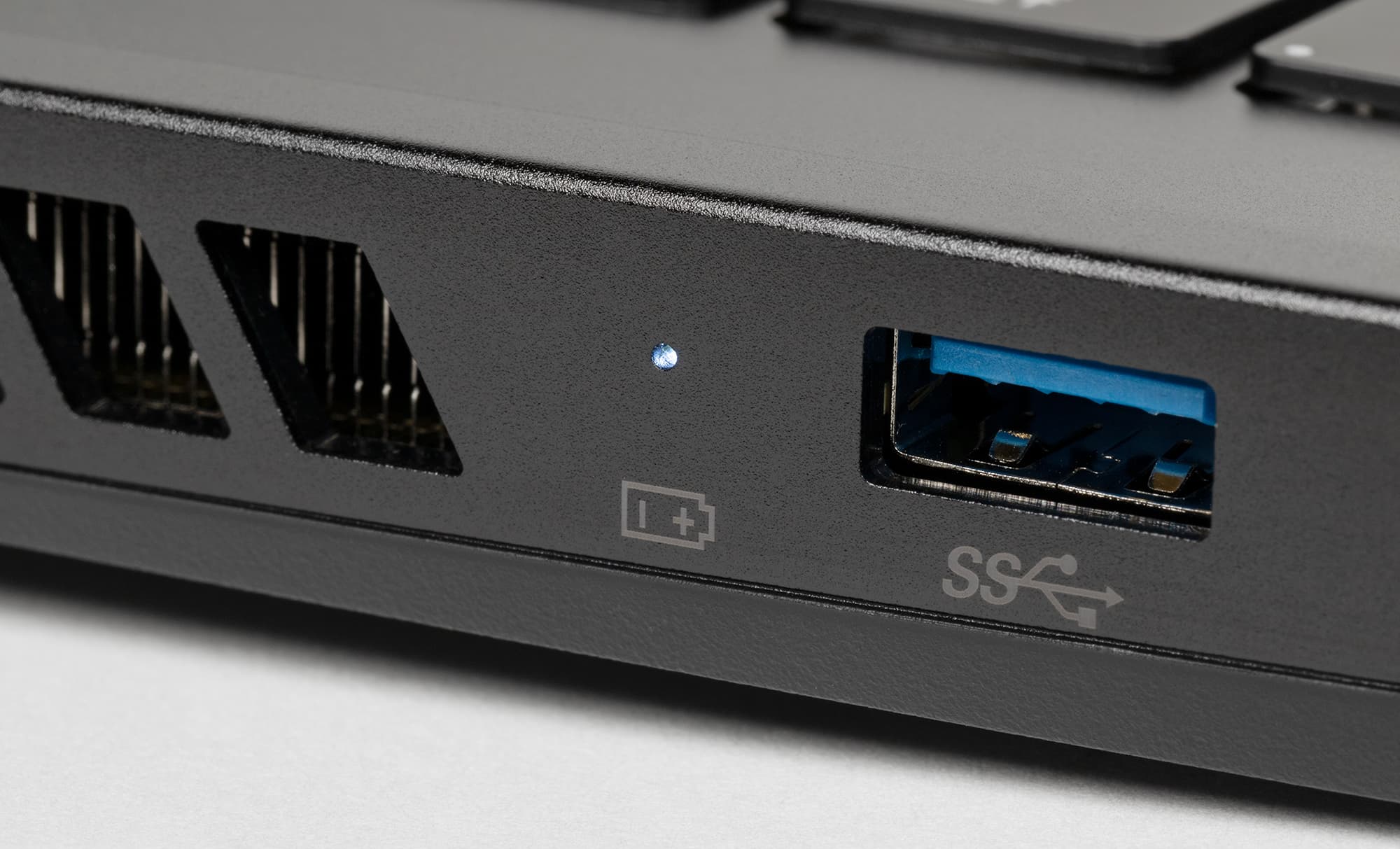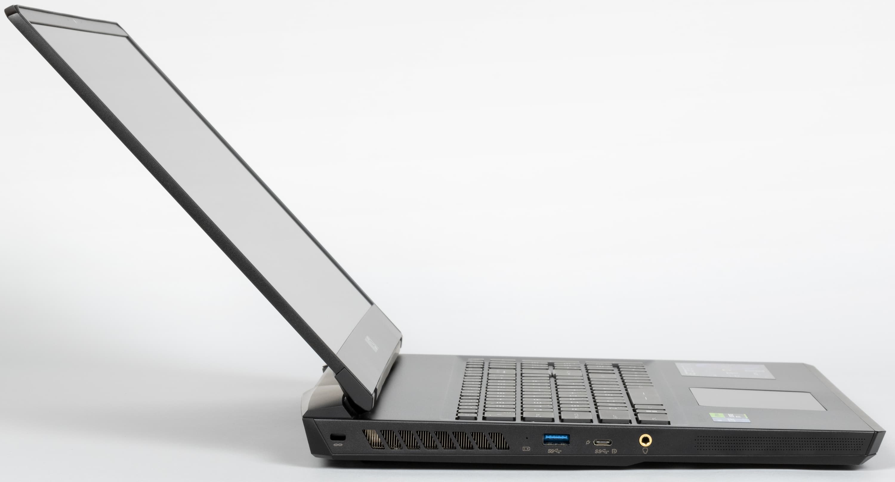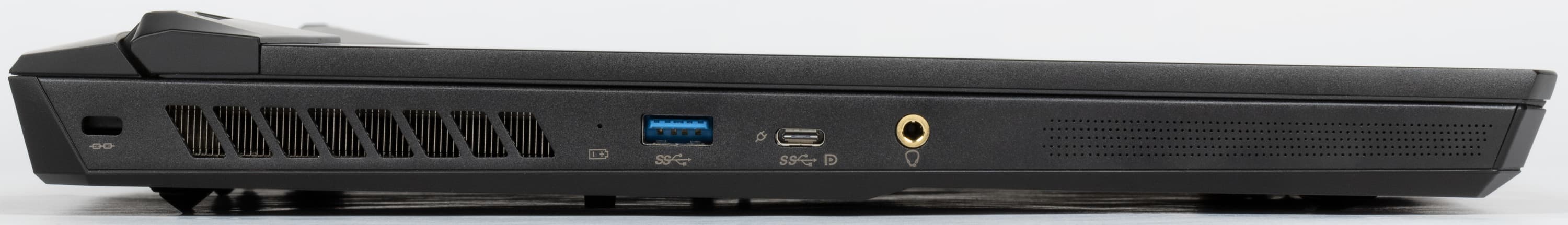 На левой боковой панели помещена решетка выходного отверстия системы охлаждения, слева от нее — отверстие кенсингтонского замка, справа — индикатор зарядки батареи, порты USB3.2 Gen2 Type A и USB3.2 Gen2 Type С (с поддержкой вывода видео) и стандартный миниджек 3,5 мм для подключения аудиогарнитуры.