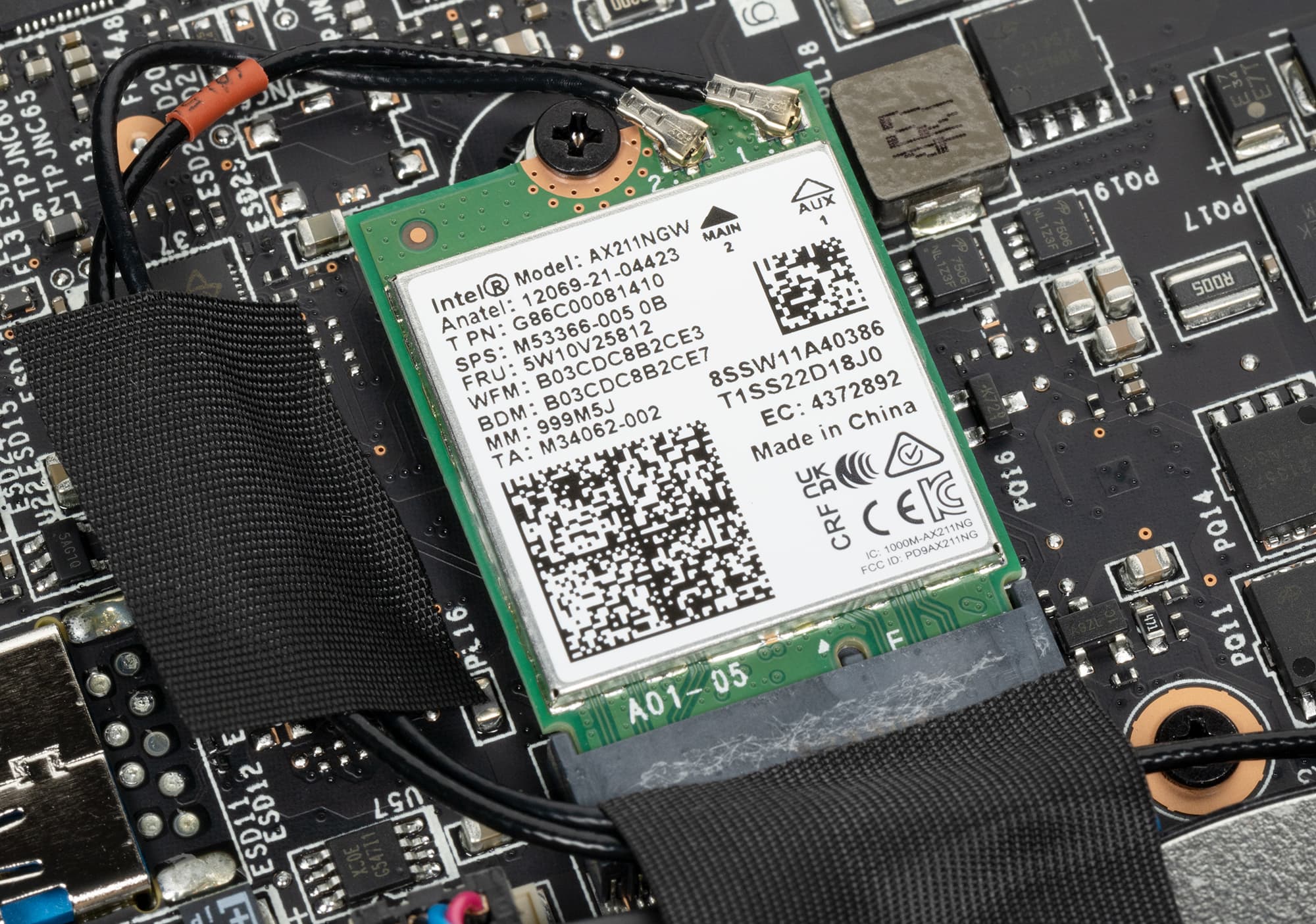 Вблизи кулера GPU располагается заменяемый адаптер беспроводной связи Intel Wi-Fi 6E AX211NGW (Garfield Peak), соответствующий стандарту 802.11ax.