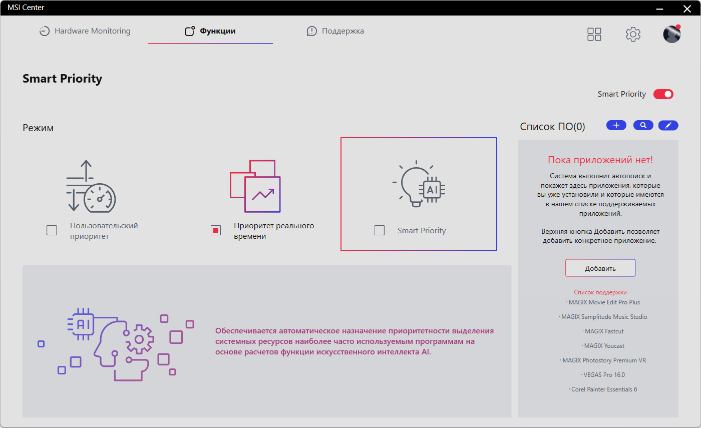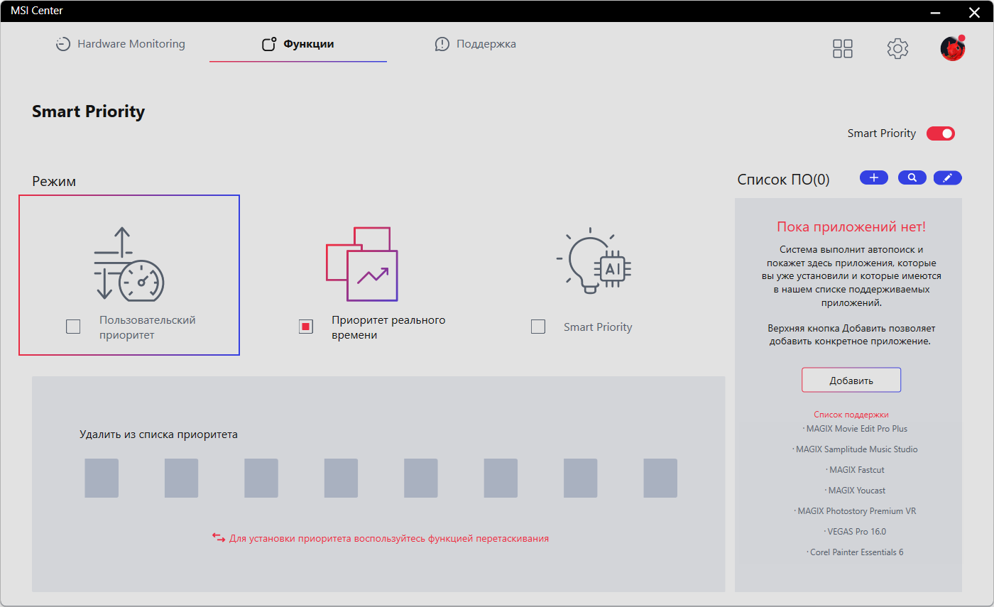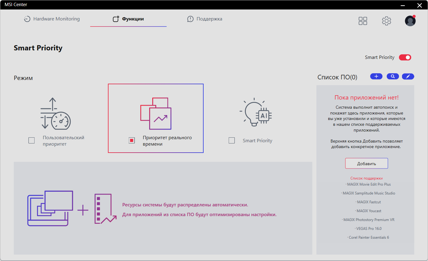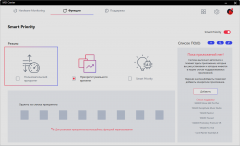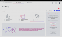 Приоритет реального времени оптимизирует настройки ПО в соответствии с его текущими запросами, Smart Priority использует искусственный интеллект, а пользовательский дает возможность определить главенство приложений вручную.