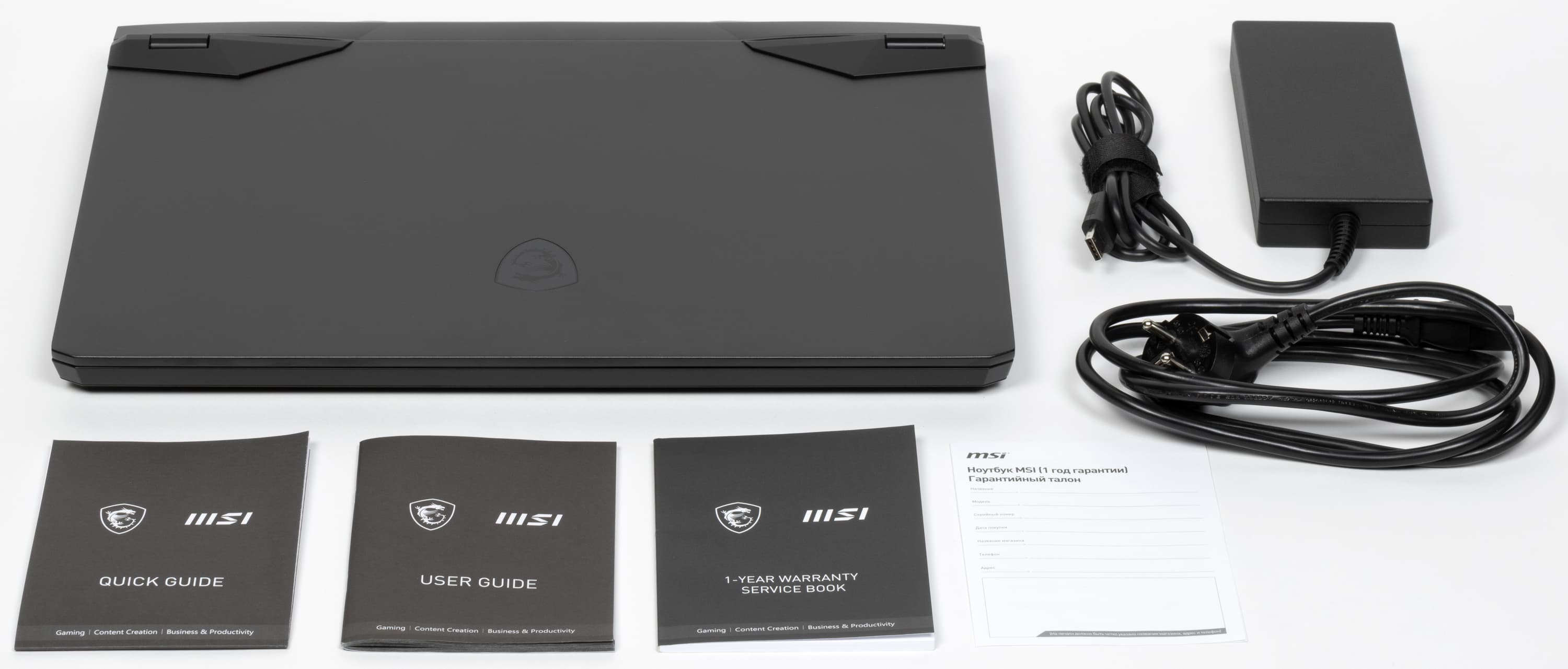 Помимо самой машины в комплекте поставки обнаруживается адаптер питания, который обеспечивает на выходе 20 В при силе тока 12 А (мощность 240 Вт), а также краткие руководства и сервисная карта.